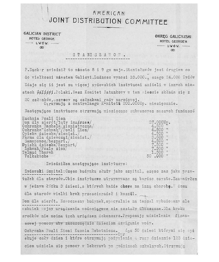 AMERICAN JOINT DISTRIBUTION COMMITTEE -i««o- GAUC1AN BISTRICT BOTEU GEORGE „.,„„ ^ G 0«-ICVJS« 6 K , W/ST, HOTEL GEORGE'A L w O W . ===== ===== u V 6w. 8 T A NI 3 £ A iT 0 W . P.Zuck~r ZY/iedzii to mmasto 8 i 9 go maja.Stanisiawow jest drugiem co do vrielkosci miastem Galioyi.Ludnosc wynosi 33.000.z czego 24.000 Zyddw Zdaje si§ is jest zu wi§ce;j zydowskich instytucai anizeli w innvch miastach ^^t/^j^I.Polski.ftasz Komitet .Ratunkov/v w tern :-:ieecie skiada sie z 20 czionkoWj-szyscy sa czionkami rady narodovrei. Otrzymuja z centralnego Kumitetm 200.000Mp. miesiecznie. Nastepujace instytucye otrzymuja miesieczne subv/encyez naszych fiindusso Kuchnia Poali Zion Dom dla sierot/luty ima^rzes/ , Ochronka Hachela;zionistyczna/ 0chronkanAG]iwah;7Poali Zion/ Opieka dziecka/zionist./ Parma dla d.ziewczat/zionist./ Samopomoc/bezpari;./ Spieka dzieska/Bezpart/ ichwah/Poale zionj Talmud Tnorah Yolkskuche 27.000Mp. 4.500 4.500 " 4.500 " 3.600 "' 4.500 !,Tr 7.500 7.500 r:r 1.500 ' 50 .000 !I Zwiedziiem nast§pujace instytucye: Zydowsti Szpital:Cz§sc budynku siuzy jako szpital, czesc zas jakc przytuiek dla starcow.Obie instytucye utrzymywane sa bardzo czysto.Zaurazyiem w jednym iozku 3 dzieci,z ktcrych kazde chore na inna chorobg." domu dla starcow wielki brak przescieradei i kosz\31. ___,. Dom dla sierot. Uo^oczesny budynek,specyalnie na tencel vjybudov.anv ale vrskutek ~ojny urzadzenia rrodociagowe nie sostaiy ulronszone .Dla braku srodkow nie mozna tych urzadzen dokonczyc-Proponuje udzielenie finan- sowej pomocy "aby zaoszcz§azic dzieciom dzwiganie v/ody. Ochronka Poali Zioni Kucnia Pobotnicza. 6cz 50 dzieci ktorymi sie cD<i Opr ekuje cal'y dzien i ktdre otrzymuja pozyrrienie <=• razy dziennie 123 dzieciom udziela sie pomocy f lekcyayli po gdd-zinacli szkolnych.Otrzymuja AMERICAN JOINT DISTRIBUTION COMMITTEE -C*m»0- GAL1CIAN B1STR1CT 6KR^G GALICYJSKI HOTEL? GEORGE, ===== LWOW. • HOTEL GEORGE'A I 2 V 6 W . ===== jednorazowy posiiek dziennie.Pokoje sa utrzymywarie w czystosci.Mimo to pdiogi kucbni nie zamiatano przez 3 dni.T.20 robotnikdw otrzymuje obiady dziennie, za cen§ 10K. BUBd_Qsliron]ja_i_^us]lBia_2Qbfitnikos.IJtrzymywana czysto .100 ro botnik kdw dziennie otrzymuje posiiek, za 5 Koron. 2ionistyczna_0cliroiikaURacliela"redle mego przekonania udziela najlepszej nauki dzeciom./czrerdziestu/.Klasy czyste ale kuchnia brudna. Chleb dla dzieci walaZ sie. na izkach. Zionistyczna Ochronka/Opieka aziecka/]yba 0 40 dzieci .Zauv/azyiem se/ dzieci bawiiy sie w odworzu zupe-I'nie bez opieki.Poinformov/ano mnie is nauczyciele miel* tego dnia wl'asnie v/olne .Instytucya zajmuje 4 budyn ki wiasne i z cbwila ukonczonia adaptacyi beda mogli -nomoecscic v,rieV_/t-< 1 <LZl LIU w 1 • Talmud_ThorahJ.400 dzieci pobirera nauke,~i§kszosc dzieci prawie nadzy bardzo brudni i bez butov/.Budynek r/raz zwielkim plcem jest v;<i>snoscia Talmud Thoryb.Dzieci otrzymuja tamze jeden posiiek a jeden w Amerykanskiej Kuchni dla dzieci. Ambulatoryum_.L-imo iz ambulatoryum zostaio otworzonem die dzieci sastaiem tam gidwnie dorosiych.Jako powdd podano mi is Zydowski szpital nie nalezy do zydowskiej sekcyi i dlatego ci "szyscy zwracajs. sie tutaj. Parma dziewczat./Hechalucim, Budynek wraz z gruntem robi r/spania^e wrazenie.Okoio 30 dziewczat uczy sie ogro&nictwa i uprawy roli.Sypialnie s§. bardzo czystei jest jesscze miejsce na 10 dziev/ezat tylrio brak Zuzek. Publiczna Kcbnia. 3ubwencyonoT.vana wyiacznie przez nasz Komitet i vrodle JUL?.-'9'-0 AMERICAN JOINT DISTRIBUTION COMMITTEE e m GAL.C1AN B.STR.CT f GAUCYJSK1 K0TEL «°RGE* ===== LfW6W. ===== - HCTEb GEORGE. ====== LWOW. ===== CS3 CsD podanycb mi informacyil800 porcyi wydaje sie dsiennie.Podczas mojej T/izyty jednak rozdano 83?? porcyi ,s czego 250 po 40 hellrd1,?. YJprawdzie miasto to posiada najv/ie§cej instytucyi ze wszystkich miast Galicyi wschodniej lees zdaniem mojem otrzymuja oni s naszycb fundussdw v,ri§cej anizeli nalezna im cs§sc T? stosunku do ludnosci. Dwazam iz odpowiodnia akcya skl'adkowa przyndsos'laby dose pieniedzy i ze poirinno si§ takoira iTsscsae. Miast to otrzymuje od nassego Iwowskiego Komitetu Patunkowego ze szkoda dla innyeh miast zpeinie uposledzonvch.