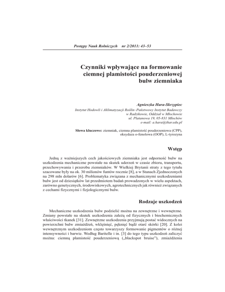 Postêpy Nauk Rolniczych nr 2/2011: 43–53 Czynniki wp³ywaj¹ce na formowanie ciemnej plamistoœci pouderzeniowej bulw ziemniaka Agnieszka Hara-Skrzypiec Instytut Hodowli i Aklimatyzacji Roœlin–Pañstwowy Instytut Badawczy w Radzikowie, Oddzia³ w M³ochowie ul. Platanowa 19, 05-831 M³ochów e-mail: [email protected] S³owa kluczowe: ziemniak, ciemna plamistoœæ pouderzeniowa (CPP), oksydaza o-fenolowa (OOP), L-tyrozyna Wstêp Jedn¹ z wa¿niejszych cech jakoœciowych ziemniaka jest odpornoœæ bulw na uszkodzenia mechaniczne powsta³e na skutek uderzeñ w czasie zbioru, transportu, przechowywania i przerobu ziemniaków. W Wielkiej Brytanii straty z tego tytu³u szacowane by³y na ok. 30 milionów funtów rocznie [8], a w Stanach Zjednoczonych na 298 mln dolarów [6]. Problematyka zwi¹zana z mechanicznymi uszkodzeniami bulw jest od dziesi¹tków lat przedmiotem badañ prowadzonych w wielu aspektach, zarówno genetycznych, œrodowiskowych, agrotechnicznych jak równie¿ zwi¹zanych z cechami fizycznymi i fizjologicznymi bulw. Rodzaje uszkodzeñ Mechaniczne uszkodzenia bulw podzieliæ mo¿na na zewnêtrzne i wewnêtrzne. Zmiany powsta³e na skutek uszkodzenia zale¿¹ od fizycznych i biochemicznych w³aœciwoœci tkanek [31]. Zewnêtrzne uszkodzenia przyjmuj¹ postaæ widocznych na powierzchni bulw zmia¿d¿eñ, wklêœniêæ, pêkniêæ b¹dŸ otaræ skórki [20]. Z kolei wewnêtrznym uszkodzeniom czêsto towarzyszy formowanie pigmentów o ró¿nej intensywnoœci i barwie. Wed³ug Baritelle i in. [3] do tego typu uszkodzeñ zaliczyæ mo¿na: ciemn¹ plamistoœæ pouderzeniow¹ („blackspot bruise”), zmia¿d¿enia 44 A. Hara-Skrzypiec („crush”), bia³e czopy („white spot/white knot”), wewnêtrzne i zewnêtrzne pêkniêcia („internal shatter” i „external shatter”). Praca ma na celu przedstawienie stanu wiedzy na temat ciemnej plamistoœci pouderzeniowej bulw ziemniaka. Ciemna plamistoœæ pouderzeniowa – definicja i powstawanie Symptomami ciemnej plamistoœci pouderzeniowej (CPP) s¹ niebieskawoszare do czarnych przebarwienia mi¹¿szu ulokowane 1–2 mm pod peryderm¹ [20]. Formowanie CPP w bulwach jest procesem z³o¿onym i poprzedzonym szeregiem zaburzeñ wywo³anych uderzeniem. Na skutek dekompartmentacji komórek, dochodzi do uwolnienia zwi¹zków bior¹cych udzia³ w tworzeniu ciemnych pigmentów, do wzrostu iloœci rybosomów i mitochondriów w cytoplazmie oraz zagêszczenia struktur granularnych wzd³u¿ œcian komórkowych i wokó³ amyloplastów. Kolejnym etapem jest synteza pigmentów w tych miejscach [17]. Synteza ciemnych barwników w uszkodzonych komórkach jest skutkiem reakcji utleniania zwi¹zków fenolowych takich jak: L-tyrozyna, kwas chlorogenowy, kwas kawowy. Reakcja ta katalizowana jest przez enzym oksydazê o-fenolow¹ (OOP). Dekompartmentacja subkomórkowa prowadzi do uwolnienia OOP, g³ównie zlokalizowanego w amyloplastach oraz do uwalniania zwi¹zków fenolowych wystêpuj¹cych w wakuoli, do cytoplazmy. Dochodzi do syntezy barwnych pigmentów, które zalicza siê do grupy makromolekularnych zwi¹zków – melanin. Analizy chemiczne pigmentów CPP potwierdzi³y, ¿e barwniki te sk³adaj¹ siê z bia³kowej matrix i kowalencyjnie z ni¹ po³¹czonych zwi¹zków poœrednich [42]. Pierwszym etapem tworzenia melanin jest reakcja utleniania monofenoli, przy udziale OOP (aktywnoœæ krezolazy), do o-difenoli oraz o-dihydroksyfenoli, a nastêpnie ich dalsza oksydacja do o-chinonów (aktywnoœæ katecholazy) (rys. 1). S¹ to reakcje bezwzglêdnie wymagaj¹ce obecnoœci tlenu [43]. Wed³ug teorii melanogenezy tyrozyna jest utleniana do DOPA chinonu, który z kolei cyklizuje do 5,6-dihydroksyindolu. Utlenianie kwasu chlorogenowego i kwasu kawowego prowadzi do wytworzenia ¿ó³tych zwi¹zków poœrednich, natomiast reakcje utleniania tyrozyny prowadz¹ do tworzenia czerwonoró¿owych pochodnych. Dalsze spontaniczne reakcje oksydacji i polimeryzacji zwi¹zków poœrednich oraz nastêpuj¹ce po nich reakcje z nukleofilowymi grupami bia³ek (pierwszo- i drugorzêdowe aminokwasy, grupy tiolowe, tioestrowe, hydroksylowe) prowadz¹ do tworzenia melanin. W przypadku kiedy substratami reakcji s¹ chinony zawieraj¹ce azot powstaj¹ czarne eumelaniny, w obecnoœci cysteiny tworz¹ siê ró¿owawoczerwone feomelaniny. Trzecia grupê stanowi¹ allomelaniny formowane z difenoli nie zawieraj¹cych azotu (np. katechol) [42, 44]. Na podstawie dotychczas przeprowadzonych badañ, przy u¿yciu ró¿nych technik mikroskopowych, nie stwierdzono jednoznacznie, czy objawom CPP zawsze towarzysz¹ uszkodzenia w obrêbie œcian komórkowych [26]. Na podstawie ultrastruk- Czynniki wp³ywaj¹ce na formowanie ciemnej plamistoœci … 45 Rysunek 1. Szlak biosyntezy melanin [22, 23, 36] turalnych badañ Edgell i Cobb [18] wyró¿nili dwie grupy ciemnej plamistoœci. Pierwsz¹ stanowi¹ powsta³e w czasie zbioru przebarwienia, wyraŸnie oddzielone od zdrowych tkanek, przebiegaj¹ce z ca³kowitym rozerwaniem struktur miêdzykomórkowych, wytworzeniem licznych b³oniastych pêcherzyków, wzrostem iloœci mitochondriów oraz wklêœniêciami j¹dra komórkowego. Drug¹ grupê stanowi¹ zmiany powsta³e w czasie przechowywania. Charakteryzuj¹ siê one niewyraŸnie zarysowanymi konturami oraz brakiem uszkodzeñ w obrêbie œcian komórkowych. Dekompartmentacja wewn¹trzkomórkowa jest ograniczona, ciemne pigmenty formuj¹ siê wzd³u¿ œcian komórkowych i wokó³ ziaren skrobi. Tego typu zmiany mo¿na okreœliæ, jako fizjologiczn¹ CPP. Metody stosowane do wywo³ywania CPP Ocena podatnoœci na CPP wymaga zastosowania odpowiedniej metody testowej w celu wywo³ania zmian o charakterze CPP. Do oceny tej wykorzystuje siê metody statyczne oraz dynamiczne. W przypadku metod statycznych testowane s¹ pojedyncze, unieruchomione bulwy. Do uderzania bulw wykorzystuje siê m.in. wahad³owe bijaki [43], penetrometry lub specjalnie konstruowane aparaty uderzeniowe [49]. W metodach dynamicz