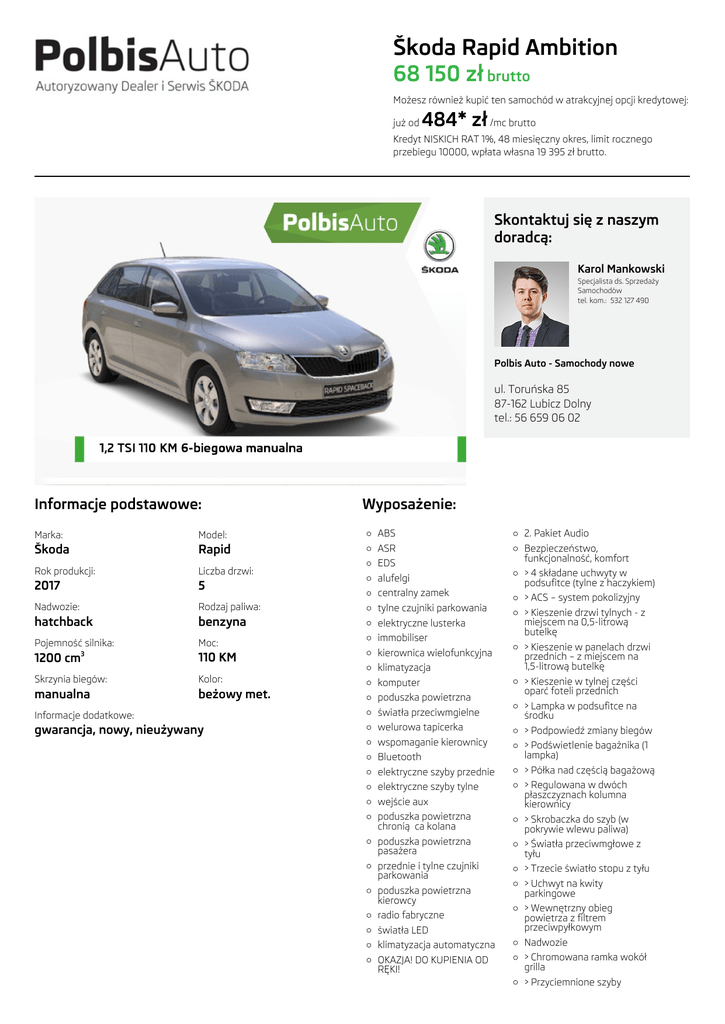 Škoda Rapid Ambition 68 150 zł brutto Możesz również kupić ten samochód w atrakcyjnej opcji kredytowej: już od 484* zł /mc brutto Kredyt NISKICH RAT 1%, 48 miesięczny okres, limit rocznego przebiegu 10000, wpłata własna 19 395 zł brutto. Skontaktuj się z naszym doradcą: Karol Mankowski Specjalista ds. Sprzedaży Samochodów tel. kom.: 532 127 490 Polbis Auto - Samochody nowe ul. Toruńska 85 87-162 Lubicz Dolny tel.: 56 659 06 02 Informacje podstawowe: Wyposażenie: Marka: Model: ABS 2. Pakiet Audio Škoda Rapid ASR Bezpieczeństwo, funkcjonalność, komfort EDS Rok produkcji: Liczba drzwi: 2017 5 Nadwozie: Rodzaj paliwa: tylne czujniki parkowania hatchback benzyna elektryczne lusterka Pojemność silnika: Moc: alufelgi centralny zamek immobiliser 110 KM kierownica wielofunkcyjna Skrzynia biegów: Kolor: manualna beżowy met. komputer 1200 cm 3 klimatyzacja poduszka powietrzna > 4 składane uchwyty w podsufitce (tylne z haczykiem) > ACS – system pokolizyjny > Kieszenie drzwi tylnych - z miejscem na 0,5-litrową butelkę > Kieszenie w panelach drzwi przednich – z miejscem na 1,5-litrową butelkę > Kieszenie w tylnej części oparć foteli przednich Informacje dodatkowe: światła przeciwmgielne > Lampka w podsufitce na środku gwarancja, nowy, nieużywany welurowa tapicerka > Podpowiedź zmiany biegów wspomaganie kierownicy Bluetooth > Podświetlenie bagażnika (1 lampka) elektryczne szyby przednie > Półka nad częścią bagażową elektryczne szyby tylne wejście aux > Regulowana w dwóch płaszczyznach kolumna kierownicy poduszka powietrzna chronią ca kolana > Skrobaczka do szyb (w pokrywie wlewu paliwa) poduszka powietrzna pasażera > Światła przeciwmgłowe z tyłu przednie i tylne czujniki parkowania > Trzecie światło stopu z tyłu poduszka powietrzna kierowcy > Uchwyt na kwity parkingowe światła LED > Wewnętrzny obieg powietrza z filtrem przeciwpyłkowym klimatyzacja automatyczna Nadwozie OKAZJA! DO KUPIENIA OD RĘKI! > Chromowana ramka wokół grilla radio fabryczne > Przyciemnione szyby Wyposażenie dodatkowe: > Zestaw naprawczy do kół 1. Zapasowe koło stalowe pełnowymiarowe, podnośnik, klucz, bez zestawu naprawczego Wnętrze > Chromowane elementy kontrolne nawiewów powietrza > Deska rozdzielcza czarna > Klamki wewnętrzne – chromowane > Panel instrumentów Ambition (chromowany pierścień zegarów obrotomierza i prędkościomierza) > Wnętrze AMBITION czarne Niniejsze ogłoszenie jest wyłącznie informacją handlową i nie stanowi oferty w myśl art. 66, § 1. Kodeksu Cywilnego. Sprzedający nie odpowiada za ewentualne błędy lub nieaktualność ogłoszenia. Skorzystaj z naszej oferty! Zapraszamy do kontaktu z naszym Doradcą Klienta. Zapytaj o dostępność auta. Gwarantujemy profesjonalne doradztwo w zakresie kupna samochodu oraz kompleksową realizację formalności związanych z zakupem. Oferujemy atrakcyjne WARUNKI FINANSOWANIA oraz promocyjne pakiety ubezpieczeniowe OC AC NNW. PAKIET POGWARANCYJNY - Przedłuż beztroską jazdę swoją ŠKODĄ! Pakiety pogwarancyjne to program, który pozwala na przedłużenie bezproblemowego serwisowania nowego samochodu na kolejne 2 lata lub do osiągnięcia określonego limitu kilometrów (60 000 km lub 120 000 km). PAKIET PRZEGLĄDÓW – Zapewnij sobie spokój, pewność i najwyższą jakość Pakiet przeglądów to opłacone wcześniej obowiązkowe przeglądy (robocizna, oryginalne części i materiały eksploatacyjne zgodne z planem serwisowym) przez pierwsze 4 lata lub do osiągnięcia określonego limitu kilometrów (60 000 km lub 120 000 km). GWARANCJA DOŻYWOTNIEJ MOBILNOŚCI Program Gwarancja Dożywotniej Mobilności skierowany jest do użytkowników samochodów marki ŠKODA po upływie dwuletniej gwarancji i obejmuje cały okres eksploatacji samochodu. W przypadku awarii poniesiesz jedynie koszty związane z naprawą i użytymi materiałami - wszystkie pozostałe usługi programu ŠKODA Assistance świadczone są bezpłatnie. ASSISTANCE W przypadku unieruchomienia samochodu, nie pozwalającego na kontynuowanie jazdy w sposób bezpieczny lub zgodny z przepisami, będącego skutkiem awarii części, podzespołów lub akcesoriów pojazdu objętego gwarancją producenta, możesz skorzystać z usług Program ŠKODA Assistance oferuje również usługi płatne, m.in. naprawa w miejscu zdarzenia lub holowanie. ŠKODA Assistance. Uwaga! Zamieszczone zdjęcia stanowią materiał poglądowy. Przedstawiona propozycja nie jest ofertą handlową w rozumieniu przepisów prawa, ma jedynie charakter informacyjny.