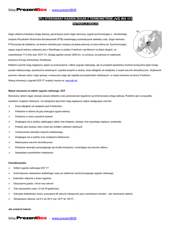 Sklep PrezentBox - www.prezentBOX (PL) STEROWANY RADIEM ZEGAR Z TERMOMETREM JVD RH 111 INSTRUKCJA OBSŁUGI Zegar odbiera przesyłany drogą radiową, generowany przez zegar atomowy, sygnał synchronizujący z niemieckiego instytutu Physikalish-Technische Bundesanstalt (PTB) nastawiający automatycznie dokładny czas. Zegar atomowy PTB pracuje tak dokładnie, że średnia odchyłka jest mniejsza od jednej sekundy na dwa miliony lat. Synchronizujący zegary sygnał radiowy nadawany jest z Mainflingen w pobliżu Frankfurtu nad Menem na falach długich, na częstotliwości 77,5 kHz (tzw. DCF-77). Zasięg sygnału wynosi 2000 km, co oznacza, że pokrywa on większość terytorium Europy Zachodniej i Środkowej. Niektóre czynniki mają negatywny wpływ na przenoszenie i odbiór sygnału radiowego, jak na przykład sąsiedztwo monitora komputera bądź innego sprzętu elektrycznego, powierzchni metalowych, wysokie budynki w okolicy, duża odległość od nadajnika, a nawet warunki atmosferyczne. Użytkownik powinien zdawać sobie z tego sprawę i umieszczać zegar jak najdalej od przedmiotów metalowych i w miarę mośności od strony Frankfurtu. Więcej informacji o sygnale DCF-77 znaleźć można na: www.ptb.de Wpływ otoczenia na odbiór sygnału radiowego DCF Sterowany radiem zegar ukazuje zawsze dokładny czas ponieważ jest regularnie synchronizowany drogą radiową. Podobnie jak w przypadku wszelkich urządzeń radiowych, na nawiązanie łączności mają negatywny wpływ następujące czynniki: Duża odległość od nadajnika pod Frankfurtem Położenie w dolinie lub góry blokujące sygnał radiowy Położenie w cieniu wysokich budowli Znajdujące się w pobliżu zakłócające odbiór linie kolejowe, lotniska, linie wysokiego napięcia, autostrady. Pobliski plac budowy, który może być źródłem zakłóceń radiowych Umieszczenie wewnątrz budynku żelbetowego. Znajdujące sie w pobliżu inne urządzenia elektryczne Niekorzystne warunki atmosferyczne Położenie wewnątrz poruszającego się środka transportu i zmieniające się warunki odbioru Sąsiedztwo przedmiotów metalowych Charakterystyka Odbiór sygnału radiowego DCF 77 Automatyczne nastawienie dokładnego czasu po odebraniu synchronizującego sygnału radiowego Kalendarz włącznie z dniem tygodnia Ukazywanie godzin, minut oraz sekund Tryb ukazywania czasu 12 lub 24-godzinowy Odchyłka dokładności chodu: przeciętnie 60 sekund miesięcznie (przy swobodnym chodzie – bez sterowania radiem) Temperatura robocza: od 0C do 50C (od -32F do 122F) Jak umieścić baterie Sklep PrezentBox - www.prezentBOX Sklep PrezentBox - www.prezentBOX • Po otwarciu wieczka pojemnika baterii • wkładamy do niego nowe baterie zwracając uwagę na właściwe skierowanie biegunów „+“ oraz „–“. • Po umieszczeniu baterii wieczko pojemnika baterii zamykamy. Uwaga: Nigdy nie należy mieszać starych i nowych baterii ani też baterii różnych rodzajów, jak niklowo-kadmowych, cynkowo-węglowyh, czy też akumulatorków. Zalecenia co do wyboru miejsca Urządzenie to odbiera sygnał radiowy, podobnie jak telewizor czy radio, należy więc umieszczać je w miejscu zapewniającym dobry odbiór ( na przykład w pobliżu okna), natomiastunikać umieszczania go w miejscach gdzie występują zakłócenia Wewnątrz konstrukcji metalowych W pobliżu sprzętu domowego W pobliżu elektrowni W sąsiedztwie placu budowy Wewnątrz środków transportu Na powierzchniach metalowych URUCHAMIANIE Czas sterowany radiem Zegar ten wyposażony jest w odbiornik sygnału radiowego na falach długich (DCF). Po włożeniu baterii zaczyna on automatycznie wyszukiwać sygnał DCF, a w przypadku udanego odibioru sygnału synchronizującego zegar nastawi się automatycznie na właściwy czas (ikona WAVE OK oraz symbol nadajnika pojawią się na wyświetlaczu). W zasięgu odbioru sygnału radiowego zegar nie wymaga żadnego ręcznego nastawiania. Jeśli odbiór synchronizującego sygnału radiowego się nie powiedzie DCF, ikona WAVE OK nie pojawi się na wyświetlaczu w ogóle, natomiast symbol nadajnika będzie miał kształt następujący: . Budzik ponawiać będzie poszukiwanie sygnału synchronizującego co trzy godziny – aż do skutku. UWAGA: W trakcie seansu łączności nie należy naciskać żadnych przycisków. Zalecamy wyszukiwanie przez budzik sygnału pozostawiać na noc, gdy są lepsze warunki odbioru (występuje mniej zakłóceń). Po udanym odbiorze sygnału i początkowym nastawieniu czasu kolejna synchronizacja odbywa się codziennie, pomiędzy godziną 02:00 a 03:00 rano. Jeśli w tym czasie odbiór się nie powiedzie, zegar będzie przez cztery godziny ponawiał próbę co godzina. Jeśli i po tym czasie odbiór się nie powiedzie, kolejna próba podjęta będzie następnego dnia w godzinach od 2:00 do 3:00 ráno. Sklep PrezentBox - www.prezentBOX Sklep PrezentBox - www.prezentBOX Jak ręcznie uruchomić wyszukiwanie sygnału Próbę odbioru sygnału synchronizującego może zegar podjąć o każdym czasie, po naciśnięciu przycisku SET/WAVE. Niepowodzenie odbioru i nawiązywanie łączności W przypadku niepowodzenia w nawiązaniu łączności, symbol nadajnika wygląda następuj ąco: a napis WAVE OK zniknie z wyświetlacza i pojawi się, ponownie, gdy odbiór się powiedzie. Zegar próbuje odebrać sygnał co godzinę, przez okres do czterech godzin. Nastawianie ręczne Nastawienie języka oraz strefy czasowej 1. W celu rozpoczęcia nastawiania języka (LANGUAGE) oraz strefy czasowej (TIME ZONE), należy nacisnąć i przytrzymać przez kilka sekund przycisk SET/WAVE 2. Następnie należy naciskać przycisk „–“ aż do momentu gdy na wyświetlaczu nie pojawi się żądany język. 3. Z kolei naciskaniem przycisku „+“ przełącza się strefy czasowe (GERMAN TIME (czas środkowoeuropejski: CET)/ GERMAN TIME +1 (CET+1 godzina)/ GERMAN TIME -1 (Czas zachodnioeuropejski: CET-1godzina) . Nastawianie kalendarza 1. Po nastawieniu języka o