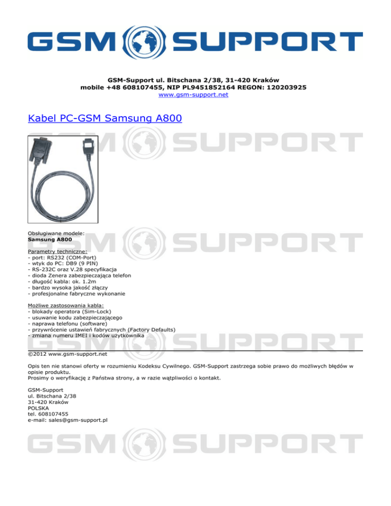 GSM-Support ul. Bitschana 2/38, 31-420 Kraków mobile +48 608107455, NIP PL9451852164 REGON: 120203925 www.gsm-support.net Kabel PC-GSM Samsung A800 Obsługiwane modele: Samsung A800 Parametry techniczne: - port: RS232 (COM-Port) - wtyk do PC: DB9 (9 PIN) - RS-232C oraz V.28 specyfikacja - dioda Zenera zabezpieczająca telefon - długość kabla: ok. 1.2m - bardzo wysoka jakość złączy - profesjonalne fabryczne wykonanie Możliwe zastosowania kabla: - blokady operatora (Sim-Lock) - usuwanie kodu zabezpieczającego - naprawa telefonu (software) - przywrócenie ustawień fabrycznych (Factory Defaults) - zmiana numeru IMEI i kodów użytkownika ©2012 www.gsm-support.net Opis ten nie stanowi oferty w rozumieniu Kodeksu Cywilnego. GSM-Support zastrzega sobie prawo do możliwych błędów w opisie produktu. Prosimy o weryfikację z Państwa strony, a w razie wątpliwości o kontakt. GSM-Support ul. Bitschana 2/38 31-420 Kraków POLSKA tel. 608107455 e-mail: [email protected] Powered by TCPDF (www.tcpdf.org)
