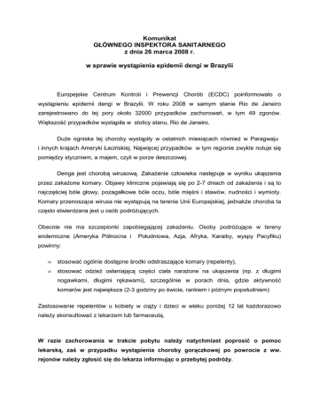 Komunikat GŁÓWNEGO INSPEKTORA SANITARNEGO z dnia 26 marca 2008 r. w sprawie wystąpienia epidemii dengi w Brazylii Europejskie Centrum Kontroli i Prewencji Chorób (ECDC) poinformowało o wystąpieniu epidemii dengi w Brazylii. W roku 2008 w samym stanie Rio de Janeiro zarejestrowano do tej pory około 32000 przypadków zachorowań, w tym 49 zgonów. Większość przypadków wystąpiła w stolicy stanu, Rio de Janeiro. Duże ogniska tej choroby wystąpiły w ostatnich miesiącach również w Paragwaju i innych krajach Ameryki Łacińskiej. Najwięcej przypadków w tym regionie zwykle notuje się pomiędzy styczniem, a majem, czyli w porze deszczowej. Denga jest chorobą wirusową. Zakażenie człowieka następuje w wyniku ukąszenia przez zakażone komary. Objawy kliniczne pojawiają się po 2-7 dniach od zakażenia i są to najczęściej bóle głowy, pozagałkowe bóle oczu, bóle mięśni i stawów, nudności i wymioty. Komary przenoszące wirusa nie występują na terenie Unii Europejskiej, jednakże choroba ta często stwierdzana jest u osób podróżujących. Obecnie nie ma szczepionki zapobiegającej zakażeniu. Osoby podróżujące w tereny endemiczne (Ameryka Północna i Południowa, Azja, Afryka, Karaiby, wyspy Pacyfiku) powinny: • stosować ogólnie dostępne środki odstraszające komary (repelenty), • stosować odzież osłaniającą części ciała narażone na ukąszenia (np. z długimi nogawkami, długimi rękawami), szczególnie w porach dnia, gdzie aktywność komarów jest największa (2-3 godziny po świcie, rankiem i późnym popołudniem) Zastosowanie repelentów u kobiety w ciąży i dzieci w wieku poniżej 12 lat każdorazowo należy skonsultować z lekarzem lub farmaceutą. W razie zachorowania w trakcie pobytu należy natychmiast poprosić o pomoc lekarską, zaś w przypadku wystąpienia choroby gorączkowej po powrocie z ww. rejonów należy zgłosić się do lekarza informując o przebytej podróży.