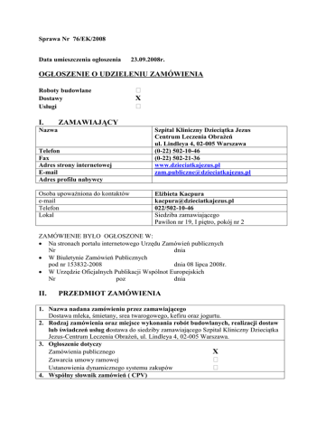 Sprawa Nr 76/EK/2008 Data umieszczenia ogłoszenia 23.09.2008r. OGŁOSZENIE O UDZIELENIU ZAMÓWIENIA Roboty budowlane Dostawy Usługi I. X ZAMAWIAJĄCY Nazwa Telefon Fax Adres strony internetowej E-mail Adres profilu nabywcy Osoba upowaŜniona do kontaktów e-mail Telefon Lokal Szpital Kliniczny Dzieciątka Jezus Centrum Leczenia ObraŜeń ul. Lindleya 4, 02-005 Warszawa (0-22) 502-10-46 (0-22) 502-21-36 www.dzieciatkajezus.pl [email protected] ElŜbieta Kacpura [email protected] 022/502-10-46 Siedziba zamawiającego Pawilon nr 19, I piętro, pokój nr 2 ZAMÓWIENIE BYŁO OGŁOSZONE W: • Na stronach portalu internetowego Urzędu Zamówień publicznych Nr dnia • W Biuletynie Zamówień Publicznych pod nr 153832-2008 dnia 08 lipca 2008r. • W Urzędzie Oficjalnych Publikacji Wspólnot Europejskich Nr poz dnia II. PRZEDMIOT ZAMÓWIENIA 1. Nazwa nadana zamówieniu przez zamawiającego Dostawa mleka, śmietany, srea twarogowego, kefiru oraz jogurtu. 2. Rodzaj zamówienia oraz miejsce wykonania robót budowlanych, realizacji dostaw lub świadczeń usług dostawa do siedziby zamawiającego Szpital Kliniczny Dzieciątka Jezus-Centrum Leczenia ObraŜeń, ul. Lindleya 4, 02-005 Warszawa. 3. Ogłoszenie dotyczy Zamówienia publicznego X Zawarcia umowy ramowej Ustanowienia dynamicznego systemu zakupów 4. Wspólny słownik zamówień ( CPV) Słownik główny Główny przedmiot Dodatkowe przedmioty III. 15.50.00.00-3 . . . . . . . . . Słownik uzupełniający - - - PRPCEDURA TRYB UDZIELENIA ZAMÓWIENIA Rodzaj procedury Przetarg nieograniczony Przetarg ograniczony Negocjacje z ogłoszeniem Dialog konkurencyjny IV. x Negocjacje bez ogłoszenia Zamówienie z wolnej ręki Zapytanie o cenę Licytacja elektroniczna UDZELENIE ZAMÓWIENIA CZĘŚĆ NR 1 NAZWA mleka, śmietany, srea twarogowego, kefiru oraz jogurtu 1. Data udzielnie zamówienia: 14/08/2008 2. Liczba otrzymanych ofert : 2 3. Nazwa i adres wykonawcy, któremu udzielono zamówienia Nazwa: INTER - MLECZ Sp. z o.o. Adres pocztowy ul. Chrzanowskiego 14 Miejscowość: Kod pocztowy: Kraj/województwo: Warszawa 04-392 Polska/mazowieckie E-mail: Tel: 022/810-43-58 Adres internetowy(URL Fax: 022/810-62-61 Informacja o cenie wybranej oferty oraz o niepodlegających odrzuceniu ofertach z najtańszą i najdroŜszą ceną ( bez VAT) Cena wybranej oferty 172.074,00 zł. Oferta z najniŜszą ceną 172.074,00 zł. Oferta z najwyŜszą ceną 172.074,00 zł. Waluta: zł IV. INFORMACJE UZUPEŁNIAJĄCE 1. Zamówienie dotyczy projektu/programu finansowego ze środków Unii Europejskiej tak nie X JeŜeli tak, wskazać projekt/program:…………………………………………………… 2. Informacje dodatkowe………………………………………………………………….. 3. Data wysłania niniejszego zaproszenia ………………………………………………...