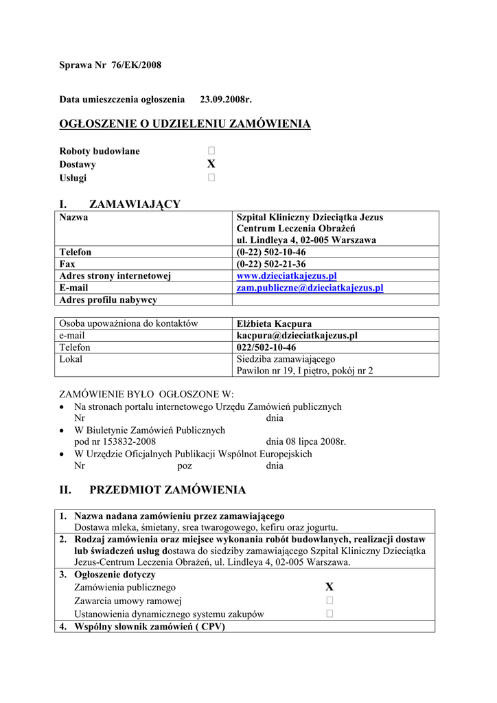 OGŁOSZENIE O UDZIELENIU ZAMÓWIENIA X I. ZAMAWIAJĄCY II