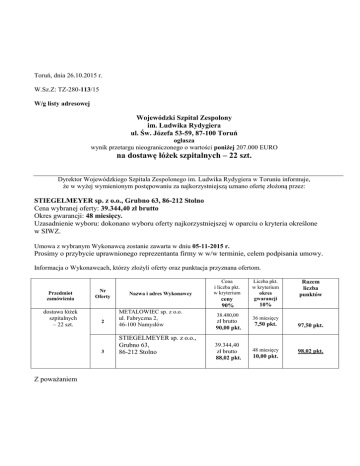 Toruń, dnia 26.10.2015 r. W.Sz.Z: TZ-280-113/15 W/g listy adresowej Wojewódzki Szpital Zespolony im. Ludwika Rydygiera ul. Św. Józefa 53-59, 87-100 Toruń ogłasza wynik przetargu nieograniczonego o wartości poniżej 207.000 EURO na dostawę łóżek szpitalnych – 22 szt. Dyrektor Wojewódzkiego Szpitala Zespolonego im. Ludwika Rydygiera w Toruniu informuje, że w wyżej wymienionym postępowaniu za najkorzystniejszą uznano ofertę złożoną przez: STIEGELMEYER sp. z o.o., Grubno 63, 86-212 Stolno Cena wybranej oferty: 39.344,40 zł brutto Okres gwarancji: 48 miesięcy. Uzasadnienie wyboru: dokonano wyboru oferty najkorzystniejszej w oparciu o kryteria określone w SIWZ. Umowa z wybranym Wykonawcą zostanie zawarta w dniu 05-11-2015 r. Prosimy o przybycie uprawnionego reprezentanta firmy w w/w terminie, celem podpisania umowy. Informacja o Wykonawcach, którzy złożyli oferty oraz punktacja przyznana ofertom. Przedmiot zamówienia dostawa łóżek szpitalnych – 22 szt. Nr Oferty 2 3 Z poważaniem Nazwa i adres Wykonawcy Cena i liczba pkt. w kryterium ceny 90% METALOWIEC sp. z o.o. ul. Fabryczna 2, 46-100 Namysłów STIEGELMEYER sp. z o.o., Grubno 63, 86-212 Stolno 38.480,00 zł brutto 90,00 pkt. 39.344,40 zł brutto 88,02 pkt. Liczba pkt. w kryterium okres gwarancji Razem liczba punktów 10% 36 miesięcy 7,50 pkt. 97,50 pkt. 48 miesięcy 98,02 pkt. 10,00 pkt.