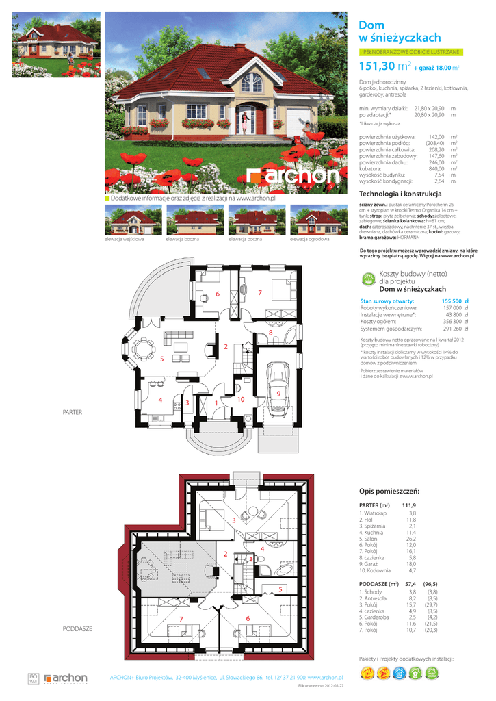 Dom w śnieżyczkach Pełnobranżowe odbicie lustrzane 151,30 m2 + garaż18,00m 2 Dom jednorodzinny 6 pokoi, kuchnia, spiżarka, 2 łazienki, kotłownia, garderoby, antresola min. wymiary działki: 21,80 x 20,90 m po adaptacji:* 20,80 x 20,90 m *Likwidacja wykusza. powierzchnia użytkowa: powierzchnia podłóg: powierzchnia całkowita: powierzchnia zabudowy: powierzchnia dachu: kubatura: wysokość budynku: wysokość kondygnacji: elewacja boczna elewacja boczna m2 m2 m2 m2 m2 m3 m m Technologia i konstrukcja Dodatkowe informacje oraz zdjęcia z realizacji na www.archon.pl elewacja wejściowa 142,00 (208,40) 208,20 147,60 246,00 840,00 7,54 2,64 elewacja ogrodowa ściany zewn.: pustak ceramiczny Porotherm 25 cm + styropian w kropki Termo Organika 14 cm + tynk; strop: płyta żelbetowa; schody: żelbetowe, zabiegowe; ścianka kolankowa: h=81 cm; dach: czterospadowy, nachylenie 37 st., więźba drewniana, dachówka ceramiczna; kocioł: gazowy; brama garażowa: HÖRMANN Do tego projektu możesz wprowadzić zmiany, na które wyrazimy bezpłatną zgodę. Więcej na www.archon.pl Koszty budowy (netto) dla projektu Dom w śnieżyczkach Stan surowy otwarty: Roboty wykończeniowe: Instalacje wewnętrzne*: Koszty ogółem: Systemem gospodarczym: 155 500 157 000 43 800 356 300 291 260 Koszty budowy netto opracowane na I kwartał 2012 (przyjęto minimanlne stawki robocizny) * koszty instalacji doliczamy w wysokości 14% do wartości robót budowlanych i 12% w przypadku domów z podpiwniczeniem Pobierz zestawienie materiałów i dane do kalkulacji z www.archon.pl PARTER Opis pomieszczeń: PARTER (m2) 1. Wiatrołap 2. Hol 3. Spiżarnia 4. Kuchnia 5. Salon 6. Pokój 7. Pokój 8. Łazienka 9. Garaż 10. Kotłownia 111,9 3,8 11,8 2,1 11,4 26,2 12,0 16,1 5,8 18,0 4,7 PODDASZE (m2) 57,4 (96,5) 1. Schody 3,8 (3,8) 2. Antresola 8,2 (8,5) 3. Pokój 15,7 (29,7) 4. Łazienka 4,9 (8,5) 5. Garderoba 2,5 (4,2) 6. Pokój 11,6 (21,5) 7. Pokój 10,7 (20,3) PODDASZE Pakiety i Projekty dodatkowych instalacji: ISO 9001 ARCHON+ Biuro Projektów, 32-400 Myślenice, ul. Słowackiego 86, tel. 12/ 37 21 900, www.archon.pl Plik utworzono: 2012-03-27 zł zł zł zł zł