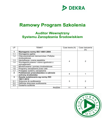 Ramowy Program Szkolenia Auditor Wewnętrzny Systemu Zarządzania Środowiskiem LP TEMAT 1 1.1 1.2 Wymagania normy ISO 14001:2004 Wymagania ogólne Odpowiedzialność kierownictwa i Polityka środowiskowa Identyfikacja i ocena aspektów Wymagania prawne i ocena zgodności z wymaganiami Monitorowanie i pomiary środowiskowe Programy zarządzania przez cele Przeglądy systemu zarządzania Podstawowe prawodawstwo w zakresie ochrony środowiska Zasady audytowania wg normy ISO 19011:2012 Wytyczne do auditowania Definicje dotyczące auditowania Działania auditowe RAZEM: 1.3 1.4 1.5 1.6 1.7 2 3 3.1 3.2 3.3 Czas teoria (h) Czas ćwiczenia (h) 4 2 4 1 3 2 11 5