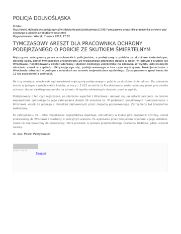 POLICJA DOLNOŚLĄSKA Źródło: http://arch2.dolnoslaska.policja.gov.pl/wr/dzialania-policji/aktualnosci/1790,Tymczasowy-areszt-dla-pracownika-ochrony-pod ejrzanego-o-pobicie-ze-skutkiem-smie.html Wygenerowano: Wtorek, 7 marca 2017, 17:02 TYMCZASOWY ARESZT DLA PRACOWNIKA OCHRONY PODEJRZANEGO O POBICIE ZE SKUTKIEM ŚMIERTELNYM Mężczyzna zatrzymany przez wrocławskich policjantów, a podejrzany o pobicie ze skutkiem śmiertelnym, decyzją sądu, został tymczasowo aresztowany.Do tragicznego zdarzenia doszło w nocy, w jednym z klubów we Wrocławiu. Poszkodowany został uderzony i doznał ciężkiego uszczerbku na zdrowiu. W wyniku odniesionych obrażeń, zmarł w szpitalu. Ukrywającego się, podejrzewanego o ten czyn mężczyznę, funkcjonariusze z Wrocławia odnaleźli w jednym z mieszkań na terenie województwa opolskiego. Zatrzymanemu grozi teraz do 12 lat pozbawienia wolności. Na trzy miesiące, wrocławski sąd aresztował mężczyznę podejrzanego o pobicie ze skutkiem śmiertelnym. Do zdarzenia doszło w jednym z wrocławskich klubów, w nocy z 21/22 września br.Poszkodowany został uderzony przez pracownika ochrony i doznał ciężkiego uszczerbku na zdrowiu. W wyniku odniesionych obrażeń, zmarł w szpitalu. Podejrzewany o ten czyn mężczyzna, po zdarzeniu wyjechał z Wrocławia i ukrywał się, jak ustalili policjanci, na terenie województwa opolskiego.Do jego zatrzymania doszło 30 września br. W godzinach południowych funkcjonariusze z Wrocławia weszli do jednego z mieszkań zajmowanych przez znajomą poszukiwanego. Zatrzymany był kompletnie zaskoczony. Po zatrzymaniu, 27 – letni mieszkaniec województwa śląskiego, zatrudniony w klubie jako pracownik ochrony, został przewieziony do Wrocławia i osadzony w policyjnym areszcie. Po wykonaniu przez policjantów czynności z jego udziałem, został on doprowadzony do prokuratury, która prowadzi w sprawie przedmiotowego zdarzenia śledztwo, gdzie usłyszał zarzuty. st. asp. Paweł Petrykowski Ocena: 0/5 (0) Tweetnij