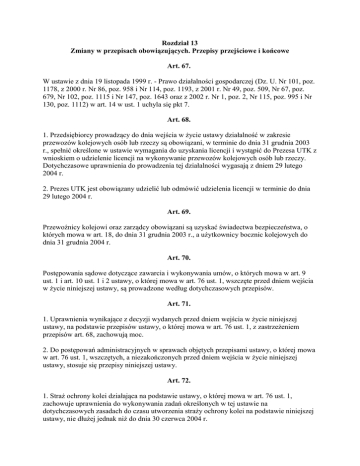 Rozdział 13 Zmiany w przepisach obowiązujących. Przepisy przejściowe i końcowe Art. 67. W ustawie z dnia 19 listopada 1999 r. - Prawo działalności gospodarczej (Dz. U. Nr 101, poz. 1178, z 2000 r. Nr 86, poz. 958 i Nr 114, poz. 1193, z 2001 r. Nr 49, poz. 509, Nr 67, poz. 679, Nr 102, poz. 1115 i Nr 147, poz. 1643 oraz z 2002 r. Nr 1, poz. 2, Nr 115, poz. 995 i Nr 130, poz. 1112) w art. 14 w ust. 1 uchyla się pkt 7. Art. 68. 1. Przedsiębiorcy prowadzący do dnia wejścia w życie ustawy działalność w zakresie przewozów kolejowych osób lub rzeczy są obowiązani, w terminie do dnia 31 grudnia 2003 r., spełnić określone w ustawie wymagania do uzyskania licencji i wystąpić do Prezesa UTK z wnioskiem o udzielenie licencji na wykonywanie przewozów kolejowych osób lub rzeczy. Dotychczasowe uprawnienia do prowadzenia tej działalności wygasają z dniem 29 lutego 2004 r. 2. Prezes UTK jest obowiązany udzielić lub odmówić udzielenia licencji w terminie do dnia 29 lutego 2004 r. Art. 69. Przewoźnicy kolejowi oraz zarządcy obowiązani są uzyskać świadectwa bezpieczeństwa, o których mowa w art. 18, do dnia 31 grudnia 2003 r., a użytkownicy bocznic kolejowych do dnia 31 grudnia 2004 r. Art. 70. Postępowania sądowe dotyczące zawarcia i wykonywania umów, o których mowa w art. 9 ust. 1 i art. 10 ust. 1 i 2 ustawy, o której mowa w art. 76 ust. 1, wszczęte przed dniem wejścia w życie niniejszej ustawy, są prowadzone według dotychczasowych przepisów. Art. 71. 1. Uprawnienia wynikające z decyzji wydanych przed dniem wejścia w życie niniejszej ustawy, na podstawie przepisów ustawy, o której mowa w art. 76 ust. 1, z zastrzeżeniem przepisów art. 68, zachowują moc. 2. Do postępowań administracyjnych w sprawach objętych przepisami ustawy, o której mowa w art. 76 ust. 1, wszczętych, a niezakończonych przed dniem wejścia w życie niniejszej ustawy, stosuje się przepisy niniejszej ustawy. Art. 72. 1. Straż ochrony kolei działająca na podstawie ustawy, o której mowa w art. 76 ust. 1, zachowuje uprawnienia do wykonywania zadań określonych w tej ustawie na dotychczasowych zasadach do czasu utworzenia straży ochrony kolei na podstawie niniejszej ustawy, nie dłużej jednak niż do dnia 30 czerwca 2004 r. 2. W okresie do dnia 31 grudnia 2005 r. w straży ochrony kolei mogą być zatrudnione osoby niespełniające wymagań określonych w art. 59 ust. 4 pkt 3, jeżeli mają co najmniej trzyletni okres zatrudnienia w straży ochrony kolei. Art. 73. Minister właściwy do spraw transportu przekaże Prezesowi UTK sprawy wraz z aktami, które przechodzą do zakresu jego działania i nie zostały zakończone do dnia wejścia w życie ustawy. Art. 74. 1. Tworzy się Urząd Transportu Kolejowego. 2. Urząd Transportu Kolejowego jest utworzony w drodze przekształcenia dotychczasowego Głównego Inspektoratu Kolejnictwa. 3. Znosi się Główny Inspektorat Kolejnictwa. 4. Prezes UTK przejmuje prowadzenie spraw Głównego Inspektora Kolejnictwa, wraz z aktami spraw niezakończonych do dnia zniesienia Głównego Inspektoratu Kolejnictwa. 5. Pracownicy Głównego Inspektoratu Kolejnictwa stają się pracownikami Urzędu Transportu Kolejowego. 6. Urząd Transportu Kolejowego przejmuje mienie Głównego Inspektoratu Kolejnictwa. 7. Prezes UTK wstępuje we wszystkie stosunki prawne, których podmiotem był Główny Inspektorat Kolejnictwa. Art. 75. 1. Finansowanie Urzędu Transportu Kolejowego do końca roku kalendarzowego, w którym przypada jego utworzenie, odbywa się ze środków finansowych przeznaczonych na funkcjonowanie Głównego Inspektoratu Kolejnictwa oraz z części budżetowej ministra właściwego do spraw transportu przeznaczonej na zadania realizowane dotychczas przez ministra właściwego do spraw transportu w zakresie, w którym przeszły do zakresu działania Prezesa UTK. 2. Minister właściwy do spraw finansów publicznych dokona w budżecie państwa na rok 2003 odpowiednich zmian zapewniających finansowanie Urzędu Transportu Kolejowego w zakresie niezbędnym do wykonania zadań określonych w niniejszej ustawie. Art. 76. 1. Traci moc ustawa z dnia 27 czerwca 1997 r. o transporcie kolejowym (Dz. U. Nr 96, poz. 591, z 1998 r. Nr 106, poz. 668, z 1999 r. Nr 84, poz. 934, z 2000 r. Nr 84, poz. 948, Nr 120, poz. 1268 i Nr 122, poz. 1314 oraz z 2001 r. Nr 154, poz. 1800). 2. Dotychczasowe przepisy wykonawcze wydane na podstawie art. 5 ust. 2, art. 7 ust. 3 i 4, art. 13 ust. 4 i 5, art. 14 ust. 4, art. 16, art. 17 ust. 4, art. 19, art. 22 ust. 10 i 11, art. 41b ust. 3, art. 46, art. 48 ust. 4-6, art. 51 ust. 2-4 ustawy, o której mowa w ust. 1, zachowują moc do czasu wydania nowych przepisów wykonawczych na podstawie art. 6 ust. 2, art. 17 ust. 7, art. 20, art. 22 ust. 2, art. 23 ust. 4 pkt 1 i 2, art. 24 ust. 5, art. 25, art. 28 ust. 3, art. 40 ust. 6 i 7, art. 54, art. 59 ust. 6 pkt 1 i 3 oraz ust. 8, art. 62 ust. 2, 3, 5 i 6 niniejszej ustawy, jednak nie dłużej niż do dnia uzyskania przez Rzeczpospolitą Polską członkostwa w Unii Europejskiej. Art. 77. Przepisy art. 27 ust. 6 oraz art. 43 ust. 3 stosuje się z dniem uzyskania przez Rzeczpospolitą Polską członkostwa w Unii Europejskiej. Art. 78. Ustawa wchodzi w życie po upływie 14 dni od dnia ogłoszenia.