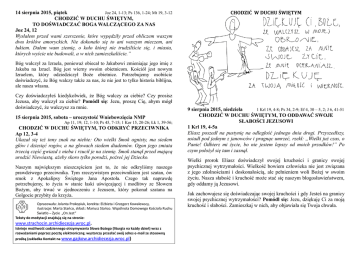 14 sierpnia 2015, piątek Joz 24, 1-13; Ps 136, 1-24; Mt 19, 3-12 CHODZIĆ W DUCHU ŚWIĘTYM, TO DOŚWIADCZAĆ BOGA WALCZĄCEGO ZA NAS Joz 24, 12 Wysłałem przed wami szerszenie, które wypędziły przed obliczem waszym dwu królów amoryckich. Nie dokonało się to ani waszym mieczem, ani łukiem. Dałem wam ziemię, o koło której nie trudziliście się, i miasta, których wyście nie budowali, a w nich zamieszkaliście.” CHODZIĆ W DUCHU ŚWIĘTYM Bóg walczył za Izraela, ponieważ obiecał to Jakubowi zmieniając jego imię z Jakuba na Izrael. Bóg jest wierny swoim obietnicom. Kościół jest nowym Izraelem, który odziedziczył Boże obietnice. Potrzebujemy osobiście doświadczyć, że Bóg walczy także za nas, że nie jest to tylko historia biblijna, ale nasza własna. Czy doświadczyłeś kiedykolwiek, że Bóg walczy za ciebie? Czy prosisz Jezusa, aby walczył za ciebie? Pomódl się: Jezu, proszę Cię, abym mógł doświadczyć, że walczysz za mnie. 15 sierpnia 2015, sobota – uroczystość Wniebowzięcia NMP Ap 11, 19; 12, 1-10; Ps 45, 7-15; 1 Kor 15, 20-26; Łk 1, 39-56; CHODZIĆ W DUCHU ŚWIĘTYM, TO ODKRYĆ PRZECIWNIKA Ap 12, 3-4 Ukazał się też inny znak na niebie: Oto wielki Smok ognisty, ma siedem głów i dziesięć rogów, a na głowach siedem diademów. Ogon jego zmiata trzecią część gwiazd z nieba i rzucił je na ziemię. Smok stanął przed mającą urodzić Niewiastą, ażeby skoro tylko porodzi, pożreć jej Dziecko. Naszym największym nieszczęściem jest to, że nie odkryliśmy naszego prawdziwego przeciwnika. Tym rzeczywistym przeciwnikiem jest szatan, ów smok z Apokalipsy Świętego Jana Apostoła. Czego tak naprawdę potrzebujemy, to życia w stanie łaski uświęcającej i modlitwy ze Słowem Bożym, aby trwać w zjednoczeniu z Jezusem, który pokonał szatana na Golgocie przybity do krzyża. Opracowała: Jolanta Prokopiuk, korekta: Elżbieta i Grzegorz Kowalewscy, ilustracje: Marta Stańco, skład:: Mariusz Stańco. Wspólnota Domowego Kościoła Ruchu Światło – Życie „On Jest” Teksty do medytacji znajdują się na stronie: www.strachocin.archidiecezja.wroc.pl. Istnieje możliwość codziennego otrzymywania Słowa Bożego (liturgia na każdy dzień) wraz z rozważaniami poprzez pocztę elektroniczną; wystarczy przesłać swój adres e-mail ze stosowną prośbą (zakładka Kontakt na www.gajkow.archidiecezja.wroc.pl) 9 sierpnia 2015, niedziela 1 Krl 19, 4-8; Ps 34, 2-9; Ef 4, 30 – 5, 2; J 6, 41-51 CHODZIĆ W DUCHU ŚWIĘTYM, TO ODDAWAĆ SWOJE SŁABOŚCI JEZUSOWI 1 Krl 19, 4-5a Eliasz poszedł na pustynię na odległość jednego dnia drogi. Przyszedłszy, usiadł pod jednym z janowców i pragnąc umrzeć, rzekł: „Wielki już czas, o Panie! Odbierz mi życie, bo nie jestem lepszy od moich przodków!” Po czym położył się tam i zasnął. Wielki prorok Eliasz doświadczył swojej kruchości i granicy swojej psychicznej wytrzymałości. Wielkość bowiem człowieka nie jest związana z jego zdolnościami i doskonałością, ale pełnieniem woli Bożej w swoim życiu. Nasza słabość i kruchość może stać się naszym błogosławieństwem, gdy oddamy ją Jezusowi. Jak zachowujesz się doświadczając swojej kruchości i gdy Jesteś na granicy swojej psychicznej wytrzymałości? Pomódl się: Jezu, dziękuję Ci za moją kruchość i słabości. Zamieszkaj w nich, aby objawiała się Twoja chwała. 10 sierpnia 2015, poniedziałek Mdr 3, 1-9; Ps 112, 1-9; 2 Kor 9, 6-10; J 12, 24-26 CHODZIĆ W DUCHU ŚWIĘTYM, TO WZRASTAĆ W HOJNOŚCI 2 Kor 9,6-7 Kto skąpo sieje, ten skąpo i zbiera, kto zaś hojnie sieje, ten hojnie też zbierać będzie. Każdy niech przeto postąpi tak, jak mu nakazuje jego własne serce, nie żałując i nie czując się przymuszonym, albowiem radosnego dawcę miłuje Bóg. 12 sierpnia 2015, środa Pwt 34, 1-12; Ps 66, 1-17; Mt 18, 15-20 CHODZIĆ W DUCHU ŚWIĘTYM, TO BYĆ PRZYJACIELEM BOGA Pwt 34, 4 Rzekł Pan do niego: „Oto kraj, który poprzysiągłem Abrahamowi, Izaakowi i Jakubowi tymi słowami: «Dam go twemu potomstwu». Dałem ci go zobaczyć własnymi oczami, lecz tam nie wejdziesz”. Skąpstwo i hojność to cechy, które rodzą się w ludzkim sercu. Bóg jest hojnym dawcą. Mało tego nie da się prześcignąć w hojności. Bóg żywy kocha ludzi hojnych, wielkodusznych i dających z radością. Proś Jezusa, aby uzdolnił cię do hojności z radością. Proś Jezusa, abyś był do Niego podobny. Bóg ze swoimi przyjaciółmi postępuje otwarcie, ale nie stosuje żadnych taryf ulgowych. Tego na własnej skórze doświadczył Mojżesz. Brak wiary w określonym miejscu sprawił, że nie mógł wejść do ziemi obiecanej. Bóg zaprasza nas do przyjaźni ze Sobą. Bóg żywy pragnie bowiem zaprzyjaźnić się z każdym człowiekiem. Tylko od nas zależy czy odpowiemy na to zaproszenie. Czy jesteś człowiekiem hojnym? Czy masz pragnienie być podobnym do Jezusa? Pomódl się: Jezu, pragnę być do Ciebie podobnym. Spraw, abym dawał hojnie i wielkodusznie. 11 sierpnia 2015, wtorek Pwt 31, 1-8 ; Pwt 32, 3-12; Mt 18, 1-14 CHODZIĆ W DUCHU ŚWIĘTYM, TO WZRASTAĆ W WIERZE Pwt 31, 7-8 Zawołał potem Mojżesz Jozuego i rzekł mu na oczach całego Izraela: „Bądź mężny i mocny, bo ty wkroczysz z tym narodem do ziemi, którą poprzysiągł Pan dać ich przodkom, i wprowadzisz ich w jej posiadanie. Sam Pan, który pójdzie przed tobą, On będzie z tobą, nie opuści cię i nie porzuci. Nie lękaj się i nie drżyj!” Pokora Mojżesza sprawia, że Naród Wybrany może wejść do ziemi obiecanej pod wodzą Jozuego. To jeden z dwóch, którzy wyszli z Egiptu i dotarli do ziemi obiecanej. To jeden z dwóch, którym udało się przekształcić szemranie w dziękczynienie, co zrodziło nową jakość wiary. Bowiem tylko wiara rodząca zaufanie doprowadzi nas do naszej ziemi obiecanej. Czy prosisz Jezusa o przymnażanie wiary? Czy przekształcasz szemranie w dziękczynienie? Pomódl się: Jezu, uzdoln