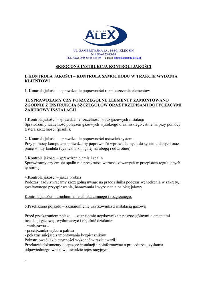 UL. ZAMBROWSKA 4A , 16-001 KLEOSIN NIP 966-123-43-20 TEL/FAX: 0048 85 664 84 40 e-mail: [email protected] SKRÓCONA INSTRUKCJA KONTROLI JAKOŚCI I. KONTROLA JAKOŚCI – KONTROLA SAMOCHODU W TRAKCIE WYDANIA KLIENTOWI 1. Kontrola jakości – sprawdzenie poprawności rozmieszczenia elementów II. SPRAWDZAMY CZY POSZCZEGÓLNE ELEMENTY ZAMONTOWANO ZGODNIE Z INSTRUKCJĄ SZCZEGÓLÓW ORAZ PRZEPISAMI DOTYCZĄCYMI ZABUDOWY INSTALACJI 1.Kontrola jakości – sprawdzenie szczelności złącz gazowych instalacji Sprawdzamy szczelność połączeń gazowych wysokiego oraz niskiego ciśnienia przy pomocy testera szczelności (pianki). 2. Kontrola jakości – sprawdzenie poprawności ustawień systemu Przy pomocy komputera sprawdzamy poprawność wprowadzonych do systemu danych oraz pracę sondy lambda (cykliczna z bogatej na ubogą i odwrotnie) 3.Kontrola jakości – sprawdzenie emisji spalin Sprawdzamy czy emisja spalin nie przekracza wartości zawartych w przepisach regulujących tę normę. 4.Kontrola jakości – jazda próbna Podczas jazdy zwracamy szczególną uwagę na pracę silnika podczas wchodzenia w zakręty, gwałtownego przyspieszania, hamowania i wyrzucania na bieg jałowy. Kontrola jakości – uruchomienie silnika zimnego i rozgrzanego. 5.Przekazano pojazdu – zaznajomienie użytkownika z instalacją gazową. Przed przekazaniem pojazdu – zaznajomić użytkownika z poszczególnymi elementami instalacji gazowej, wytłumaczyć i objaśnić działanie: - wielozaworu - przełącznika wyboru paliwa - pokazać miejsce zamontowania bezpieczników Poinstruować jakie czynności wykonać w razie awarii. Przekazać dokumenty dotyczące instalacji i poinformować o procedurze uzyskania odpowiedniego wpisu w dowodzie rejestracyjnym. .