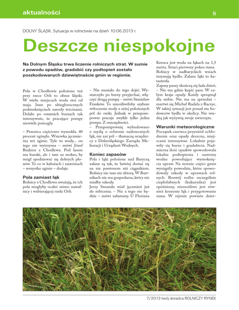 aktualności 5 DOLNY ŚLĄSK. Sytuacja w rolnictwie na dzień 10.06.2013 r. Deszcze niespokojne Na Dolnym Śląsku trwa liczenie rolniczych strat. W sumie z powodu opadów, gradobić czy podtopień zostało poszkodowanych dziewiętnaście gmin w regionie. Pola w Chodlewie położone tuż przy rzece Orli to obraz klęski. W wielu miejscach woda stoi od maja. Inne po ubiegłorocznych podmoknięciach zarosły trzcinami. Dolało po ostatnich burzach tak intensywnie, że pracujące pompy niewiele pomogły. – Pszenica częściowo wymokła. 40 procent zginęło. Wsiewka jęczmienia też zginie. Tyle tu wody... on tego nie wytrzyma – mówi Józef Budzisz z Chodlewa. Pod lasem ma buraki, ale i tam za mokro, by mógł spodziewać się dobrych plonów. To co w kałużach i zastoinach ‒ wszystko zginie – dodaje. Pola zamiast łąk Rolnicy z Chodlewa uważają, że ich pola mogłyby ocaleć mimo nawałnicy i wzbierającej rzeki Orli. ‒ Nie musiało do tego dojść. Wystarczyło po burzy przyjechać, włączyć drugą pompę ‒ mówi Stanisław Franków. To umożliwiłoby szybsze wtłoczenie wody z niżej położonych pól do rzeki. Jednak w przepompowni pracuje zwykle tylko jedna pompa. Z oszczędności. ‒ Przepompownię wybudowano z myślą o ochronie nadrzecznych łąk, nie zaś pól – tłumaczą urzędnicy z Dolnośląskiego Zarządu Melioracji i Urządzeń Wodnych. Koniec zapasów Pola i łąki położone nad Baryczą zalane są tak, że łatwiej dostać się na nie pontonem niż ciągnikiem. Rolnicy nic tam nie zbiorą. W Bartnikach nie ma gospodarza, który nie miałby szkody. Jerzy Sznatała miał jęczmień już do młócenia. ‒ Nic z tego nie będzie – mówi załamany. U Floriana Krenca jest woda na łąkach na 1,5 metra. Straci pierwszy pokos siana. Rolnicy w nadbaryckich wsiach trzymają bydło. Zalane łąki to katastrofa. Zapasy paszy skończą się lada dzień. ‒ Nie ma gdzie kupić pasz. W całym kraju opady. Każdy sprzątnął dla siebie. Nie ma na sprzedaż – martwi się Michał Radała z Raczyc. W takiej sytuacji jest ponad stu hodowców bydła w okolicy. Nie wiedzą jak wyżywią swoje zwierzęta. Warunki meteorologiczne Początek czerwca przyniósł ochłodzenie oraz opady deszczu, miejscami intensywne. Lokalnie pojawiły się burze i gradobicia. Nadmierna ilość opadów spowodowała lokalne podtopienia i zastoiny wodne powodujące wymoknięcia upraw. Na terenie części gmin wystąpiły powodzie, które spowodowały szkody w uprawach rolnych. Rozwój roślin szczególnie ciepłolubnych (kukurydza) jest opóźniony, niemożliwe jest również koszenie łąk i przygotowanie siana. W rejonie powiatu dzier- 7/2013 twój doradca ROLNICZY RYNEK aktualności żoniowskiego, w okresie od 10 maja do 10 czerwca było 14 dni z opadami i spadło około 149 mm deszczu. Największy opad wystąpił 9 czerwca, było to 43 mm. Stan upraw – zboża Zboża ozime znajdują się w fazie od liścia flagowego do początku kwitnienia. Zboża jare, w zależności od terminu siewu – w fazie strzelania w źdźbło do liścia flagowego. Pojawiły się choroby kłosa i liści (fuzarioza i septorioza). W dużym nasileniu wystąpił mączniak. Na jęczmieniu występuje porażenie brunatną plamistością liści. Pogoda uniemożliwia walkę chemiczną z chorobami. Plantacje kukurydzy są słabe, przebarwione ze względu na niskie temperatury i deszcz, który wypłukał pokarm z wierzchniej warstwy gleby. W niektórych rejonach występuje nasilenie chorób grzybowych w głównie zbożach ozimych. Widać objawy porażenia mączniakiem rzekomym, septoriozą liści, rdzą brunatną, plamistością siatkową, septoriozą plew i fuzariozą kłosów. Na większości plantacji widać nasilone objawy żerowania skrzypionek oraz nalot mszycy zbożowej. Występuje średnie i duże zachwaszczenie niechronionych plantacji ozimin miotłą zbożową, przytulią czepną, chabrem bławatkiem, fiołkiem polnym i makiem. W zbożach jarych występuje głównie zachwaszczenie przytulią i ostrożeniem polnym 6 Większość plantacji buraków cukrowych posianych w terminie jest w dobrym stanie, rośliny znajdują się w fazie zwierania rzędów. Buraki wysiane z opóźnieniem znajdują się w fazie od 2 do 6 liści właściwych. Trwa dolistne dokarmianie mikroelementami. Rzepak ze słodyszkiem Plantacje rzepaku ozimego znajdują się w fazie formowania i przyrostu masy łuszczyn. Rzepak jary – w fazie kwitnienia. Zaobserwowano większą niż w poprzednich latach skalę występowania słodyszka rzepakowego, chowacza podobnika oraz zauważalne uszkodzenia spowodowane przez pryszczarka kapustnika. Widać niewielkie zachwaszczenie, głównie samosiewami zbóż, makami, chabrami i przytulią (szczególnie plantacji niechronionych). Zauważalne są objawy chorobowe zgnilizny twardzikowej i szarej pleśni. Rośliny sadownicze Rozpoczął się zbiór truskawek i czereśni odmian wczesnych. Jest on utrudniony przez opady deszczu i ochłodzenie. Drzewa owocowe znajdują się w fazie formowania owoców. Występuje nasilenie mszyc. Stwierdzono występowanie chorób roślin sadowniczych ‒ parcha jabłoni, brunatnej zgnilizny drzew oraz szarej pleśni na truskawkach. Niższe ceny zbóż Pogoda sprzyja zarazie ziemniaczanej Ziemniaki wczesne uprawiane pod osłonami znajdują się w trakcie zbioru. Ziemniaki wczesne – w fazie zakrywania międzyrzędzi i kwitnienia. Ziemniaki późne w fazie zakrywania międzyrzędzi. Pogoda sprzyja rozwojowi zarazy ziemniaczanej, widać pierwsze objawy porażenia. Na niektórych plantacjach występuje stonka ziemniaczana. Ceny młodych ziemniaków utrzymują się na wysokim poziomie. Za 1 kilogram trzeba było zapłacić od 4 nawet do 8 zł. Skup zbóż prowadzony jest w punktach skupu na bieżąco. Ceny skupu spadły w stosunku do poprzedniego miesiąca. Za 1 dt pszenicy konsumpcyjnej otrzymamy maksymalnie 101,65 zł. Średnio możemy sprzedać pszenicę konsumpcyjną za 89,03 zł/
