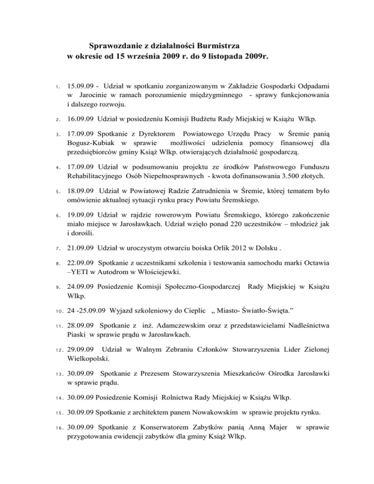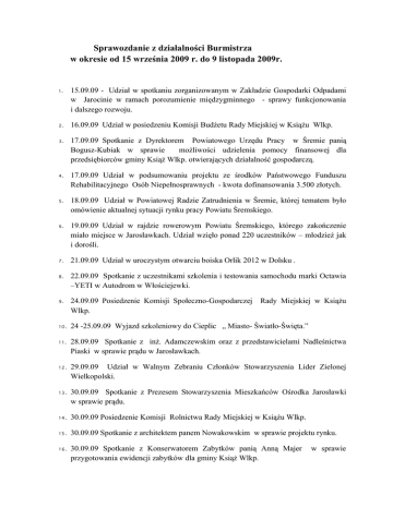 Sprawozdanie z działalności Burmistrza w okresie od 15 września 2009 r. do 9 listopada 2009r. 1. 15.09.09 - Udział w spotkaniu zorganizowanym w Zakładzie Gospodarki Odpadami w Jarocinie w ramach porozumienie międzygminnego - sprawy funkcjonowania i dalszego rozwoju. 2. 16.09.09 Udział w posiedzeniu Komisji Budżetu Rady Miejskiej w Książu Wlkp. 3. 17.09.09 Spotkanie z Dyrektorem Powiatowego Urzędu Pracy w Śremie panią Bogusz-Kubiak w sprawie możliwości udzielenia pomocy finansowej dla przedsiębiorców gminy Książ Wlkp. otwierających działalność gospodarczą. 4. 17.09.09 Udział w podsumowaniu projektu ze środków Państwowego Funduszu Rehabilitacyjnego Osób Niepełnosprawnych - kwota dofinansowania 3.500 złotych. 5. 18.09.09 Udział w Powiatowej Radzie Zatrudnienia w Śremie, której tematem było omówienie aktualnej sytuacji rynku pracy Powiatu Śremskiego. 6. 19.09.09 Udział w rajdzie rowerowym Powiatu Śremskiego, którego zakończenie miało miejsce w Jarosławkach. Udział wzięło ponad 220 uczestników – młodzież jak i dorośli. 7. 21.09.09 Udział w uroczystym otwarciu boiska Orlik 2012 w Dolsku . 8. 22.09.09 Spotkanie z uczestnikami szkolenia i testowania samochodu marki Octawia –YETI w Autodrom w Włościejewki. 9. 24.09.09 Posiedzenie Komisji Społeczno-Gospodarczej Rady Miejskiej w Książu Wlkp. 10. 24 -25.09.09 Wyjazd szkoleniowy do Cieplic „ Miasto- Światło-Święta.” 1 1 . 28.09.09 Spotkanie z inż. Adamczewskim oraz z przedstawicielami Nadleśnictwa Piaski w sprawie prądu w Jarosławkach. 1 2. 29.09.09 Udział w Walnym Zebraniu Członków Stowarzyszenia Lider Zielonej Wielkopolski. 1 3. 30.09.09 Spotkanie z Prezesem Stowarzyszenia Mieszkańców Ośrodka Jarosławki w sprawie prądu. 1 4. 30.09.09 Posiedzenie Komisji Rolnictwa Rady Miejskiej w Książu Wlkp. 1 5. 30.09.09 Spotkanie z architektem panem Nowakowskim w sprawie projektu rynku. 1 6. 30.09.09 Spotkanie z Konserwatorem Zabytków panią Anną Majer przygotowania ewidencji zabytków dla gminy Książ Wlkp. w sprawie 1 7. 4.10.2009r Udział w obchodach święta Gimnazjum im. Dr. Maksymiliana Krybusa w Książu Wlkp. 1 8. 5.10 2009 r. Podpisanie umowy w Urzędzie Marszałkowskim w Poznaniu na środki unijne z programu Odnowa wsi w wysokości 500 tys. złotych - modernizacja parku. 1 9. 7.10.2009 Posiedzenie Komisji Wspólnej Rady Miejskiej w Książu Wlkp. 20. 7.10.2009 Udział w otwarciu wystawy Kapliczki i Świątki przydrożne gm. Dolsk. 2 1. 7.10.2009 Udział w spotkaniu z Stowarzyszeniem Przedsiębiorców gminy Książ . 22. 12.10.2009 Odbył się przetarg na dzierżawę gruntów rolnych. 23. 13.10.2009 Posiedzenie Komisji Rewizyjnej Rady Miejskiej. 24. 13.10.2009 Udział w konwencie burmistrzów powiatu śremskiego – sprawa schroniska dla zwierząt w Gaju. 25. 14.10.2009 Wręczenie nagród Burmistrza 3 nauczycielom z gminy Książ Wlkp. z okazji Dnia Edukacji Narodowej. 26. 25.10.2009 Uroczystość 70 rocznicy rozstrzelanych na rynku zorganizowana wspólnie z gminą Dolsk. 27. 28.10.09 Posiedzenie Komisji Wspólnej Rady Miejskiej w Książu Wlkp. 28. 30.10.09 Uroczystość otwarcia boiska wielofunkcyjnego Orlik 2012 w Książu Wlkp. 29. 30.10.2009 Udział w otwarciu boiska Orlik w Śremie. 30. 30.10.2009 Udział w uroczystościach 10 lecia Jubileuszu wydania pierwszego numeru Tygodnia Ziemi Śremskiej 3 1. 2.11.2009r. Udział w otwarciu nowego biura Stowarzyszenia Lider Zielonej Wielkopolski w Środzie Wlkp. Biuro obecnie mieści się w Środzie przy ulic Berwińskiego 1. 32. 5.11.2009r. Udział posiedzeniu Zarządu Unii Gospodarczej Miast Regionu Śremskiego – omawiano działalność Stowarzyszenia za IX i X br. 33. 5.11.2009r. Spotkanie z przedsiębiorcami powiatu Śremskiego w Śremie, tematem którego było omówienie ustawy o łagodzeniu skutków kryzysu gospodarczego oraz przedstawienie możliwości kredytowania przedsięwzięć realizowanych przez przedsiębiorców celem pozyskania środków unijnych. Podjęte zarządzenia w tym zakresie ; 1. Zarządzenie w sprawie ustalenia wysokości stawek czynszu na najem niepodlegających przetargowi lokali użytkowych oraz za najem pomieszczeń i gruntów przeznaczonych na cele socjalno-bytowe najemców lokali w budynkach komunalnych oraz opłat za umieszczanie reklam na budynkach i gruntach. 2. Zarządzenia w sprawie planu finansowego dochodów i wydatków jednostki Urzędu Miejskiego w Książu Wlkp. 3. Zarządzenie w sprawie planu finansowego zadań z zakresu administracji rządowej zleconych gminie na rok 2009. 4. Zarządzenia 88-93 w sprawie informacji o ostatecznych kwotach dochodów i wydatków oraz wysokości dotacji gminnych jednostek organizacyjnych na rok 2009. 5. Zarządzenie w sprawie ogłoszenia wykazu lokali użytkowych stanowiących własność gminy Książ Wlkp. przeznaczonych do sprzedaży w trybie bezprzetargowym na rzecz dotychczasowych najemców. 6. Zarządzenie w sprawie opracowania i składania planów finansowych jednostek budżetowych, Zakładu Budżetowego gminy i planu działalności instytucji kultury. 7. Zarządzenie w sprawie ogłoszenia wykazu gruntów stanowiących własność Gminy Książ Wlkp. przeznaczonych do wydzierżawienia w drodze przetargu. 8. Zarządzenie w sprawie powołania Komisji Przetargowej oraz ustalenia Regulaminu przetargu ustnego nieograniczonego na dzierżawę gruntów stanowiących własność Gminy. 9. Zarządzenia nr 98-103 w sprawie zmiany zarządzeń nr 42-47 z dnia 25 maja 2009r. w sprawie zatwierdzenia arkuszy organizacyjnych Przedszkola w Książu Wlkp., Szkoły Podstawowej w Książu Wlkp., Szkoły Podstawowej w Konarzycach, Szkoły Podstawowej w Chwałkowie Kościelnym, Gimnazjum w Książu Wlkp., Zespołu Szkół w Mchach. 10. Zarządzenie w sprawie zmian w budżecie na rok 2009. 1 1 . Zarządzenia nr 105 -110 w sprawie informacji o ostatecznych kwotach wydatków oraz wysokości dotacji gminnych jednostek organizacyjnych na rok 2009 r. 12. Zarządzenie w spr