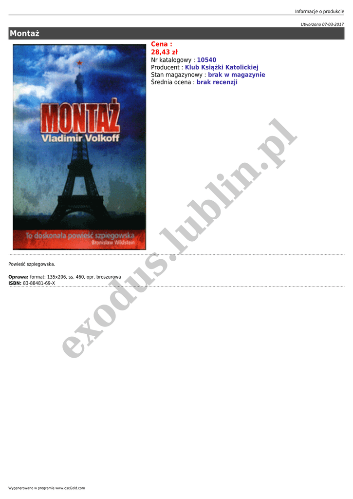 Informacje o produkcie Utworzono 07-03-2017 Montaż Cena : 28,43 zł od us Powieść szpiegowska. .lu bl in .p l Nr katalogowy : 10540 Producent : Klub Książki Katolickiej Stan magazynowy : brak w magazynie Średnia ocena : brak recenzji ex Oprawa: format: 135x206, ss. 460, opr. broszurowa ISBN: 83-88481-69-X Wygenerowano w programie www.oscGold.com