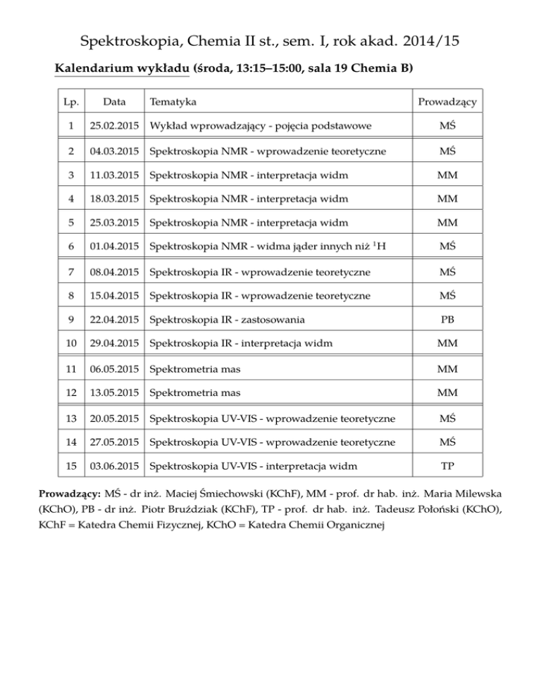 Spektroskopia, Chemia II st., sem. I, rok akad. 2014/15 Kalendarium wykładu (środa, 13:15–15:00, sala 19 Chemia B) Lp. Data Tematyka Prowadzący 1 25.02.2015 Wykład wprowadzający - pojęcia podstawowe MŚ 2 04.03.2015 Spektroskopia NMR - wprowadzenie teoretyczne MŚ 3 11.03.2015 Spektroskopia NMR - interpretacja widm MM 4 18.03.2015 Spektroskopia NMR - interpretacja widm MM 5 25.03.2015 Spektroskopia NMR - interpretacja widm MM 6 01.04.2015 Spektroskopia NMR - widma jąder innych niż 1 H MŚ 7 08.04.2015 Spektroskopia IR - wprowadzenie teoretyczne MŚ 8 15.04.2015 Spektroskopia IR - wprowadzenie teoretyczne MŚ 9 22.04.2015 Spektroskopia IR - zastosowania PB 10 29.04.2015 Spektroskopia IR - interpretacja widm MM 11 06.05.2015 Spektrometria mas MM 12 13.05.2015 Spektrometria mas MM 13 20.05.2015 Spektroskopia UV-VIS - wprowadzenie teoretyczne MŚ 14 27.05.2015 Spektroskopia UV-VIS - wprowadzenie teoretyczne MŚ 15 03.06.2015 Spektroskopia UV-VIS - interpretacja widm TP Prowadzący: MŚ - dr inż. Maciej Śmiechowski (KChF), MM - prof. dr hab. inż. Maria Milewska (KChO), PB - dr inż. Piotr Bruździak (KChF), TP - prof. dr hab. inż. Tadeusz Połoński (KChO), KChF = Katedra Chemii Fizycznej, KChO = Katedra Chemii Organicznej Spektroskopia, Chemia II st., sem. I, rok akad. 2014/15 Kalendarium laboratorium (poniedziałek, 9:15–13:00) Zajęcia seminaryjne: poniedziałek, 11:15–13:00, sala 15 Chemia D Lp. Data 1 09.03.2015 2 Tematyka Czas Prowadzący Zajęcia wprowadzające 1 MŚ 16.03.2015 Spektroskopia NMR - ćwiczenie praktyczne 4 TL 3 23.03.2015 Spektroskopia NMR - interpretacja widm 2 KE 4 30.03.2015 Spektroskopia NMR - interpretacja widm 2 KE 5 13.04.2015 Spektroskopia NMR - interpretacja widm 2 KE 6 20.04.2015 Spektroskopia NMR - kolokwium 1 KE 7 27.04.2015 Spektroskopia IR - interpretacja widm 2 KE 8 04.05.2015 Spektroskopia IR - interpretacja widm 2 KE 9 11.05.2015 Spektroskopia IR - kolokwium 1 KE 10 18.05.2015 Spektroskopia NMR - interpretacja widm 13 C 2 KE 11 25.05.2015 Techniki łączone - interpretacja widm 2 KE 12 01.06.2015 Techniki łączone - kolokwium 1 KE 13 08.06.2015 Spektroskopia IR - ćwiczenie praktyczne 4 PB 14 15.06.2015 Spektroskopia UV-VIS - ćwiczenie praktyczne 4 MŚ Prowadzący: MŚ - dr inż. Maciej Śmiechowski (KChF), TL - dr inż. Tomasz Laskowski (KTLiB), KE - mgr inż. Katarzyna Eichstaedt (KChO), PB - dr inż. Piotr Bruździak (KChF), KChF = Katedra Chemii Fizycznej, KChO = Katedra Chemii Organicznej, KTLiB = Katedra Technologii Leków i Biochemii