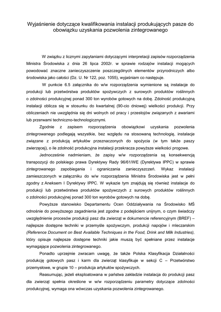 Wyjaśnienie dotyczące kwalifikowania instalacji produkujących pasze do obowiązku uzyskania pozwolenia zintegrowanego W związku z licznymi zapytaniami dotyczącymi interpretacji zapisów rozporządzenia Ministra Środowiska z dnia 26 lipca 2002r. w sprawie rodzajów instalacji mogących powodować znaczne zanieczyszczenie poszczególnych elementów przyrodniczych albo środowiska jako całości (Dz. U. Nr 122, poz. 1055), wyjaśniam co następuje. W punkcie 6.5 załącznika do w/w rozporządzenia wymienione są instalacje do produkcji lub przetwórstwa produktów spożywczych z surowych produktów roślinnych o zdolności produkcyjnej ponad 300 ton wyrobów gotowych na dobę. Zdolność produkcyjną instalacji oblicza się w stosunku do kwartalnej (90-cio dniowej) wielkości produkcji. Przy obliczeniach nie uwzględnia się dni wolnych od pracy i przestojów związanych z awariami lub przerwami techniczno-technologicznymi. Zgodnie z zapisem rozporządzenia obowiązkowi uzyskania pozwolenia zintegrowanego podlegają wszystkie, bez względu na stosowaną technologię, instalacje związane z produkcją artykułów przeznaczonych do spożycia (w tym także paszy zwierzęcej), o ile zdolność produkcyjna instalacji przekracza powyższe wielkości progowe. Jednocześnie nadmieniam, że zapisy w/w rozporządzenia są konsekwencją transpozycji do polskiego prawa Dyrektywy Rady 96/61/WE (Dyrektywa IPPC) w sprawie zintegrowanego zapobiegania i ograniczania zanieczyszczeń. Wykaz instalacji zamieszczonych w załączniku do w/w rozporządzenia Ministra Środowiska jest w pełni zgodny z Aneksem I Dyrektywy IPPC. W wykazie tym znajdują się również instalacje do produkcji lub przetwórstwa produktów spożywczych z surowych produktów roślinnych o zdolności produkcyjnej ponad 300 ton wyrobów gotowych na dobę. Powyższe stanowisko Departamentu Ocen Oddziaływania na Środowisko MŚ odnośnie do powyższego zagadnienia jest zgodne z podejściem unijnym, o czym świadczy uwzględnienie procesów produkcji pasz dla zwierząt w dokumencie referencyjnym (BREF) – najlepsze dostępne techniki w przemyśle spożywczym, produkcji napojów i mleczarskim (Reference Document on Best Available Techniques in the Food, Drink and Milk Industries), który opisuje najlepsze dostępne techniki jakie muszą być spełniane przez instalacje wymagające pozwolenia zintegrowanego. Ponadto uprzejmie zwracam uwagę, że także Polska Klasyfikacja Działalności produkcję gotowych pasz i karm dla zwierząt klasyfikuje w sekcji C – Przetwórstwo przemysłowe, w grupie 10 – produkcja artykułów spożywczych. Reasumując, jeżeli eksploatowana w państwa zakładzie instalacja do produkcji pasz dla zwierząt spełnia określone w w/w rozporządzeniu parametry dotyczące zdolności produkcyjnej, wymaga ona wówczas uzyskania pozwolenia zintegrowanego.