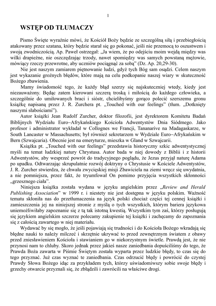 1 WSTĘP OD TŁUMACZY Pismo Święte wyraźnie mówi, że Kościół Boży będzie ze szczególną siłą i przebiegłością atakowany przez szatana, który będzie starał się go pokonać, jeśli nie przemocą to oszustwem i swoją zwodniczością. Ap. Paweł ostrzegał: „Ja wiem, że po odejściu moim wejdą między was wilki drapieżne, nie oszczędzając trzody, nawet spomiędzy was samych powstaną mężowie, mówiący rzeczy przewrotne, aby uczniów pociągnąć za sobą” (Dz. Ap. 20,29-30). Nie jest naszym zamiarem piętnowanie ludzi, gdyż tych Bóg sam osądzi. Celem naszym jest wykazanie groźnych błędów, które mają na celu podkopanie naszej wiary w skuteczność Bożego zbawienia. Mamy świadomość tego, że każdy błąd szerzy się najskuteczniej wtedy, kiedy jest niezauważony. Będąc zatem kierowani szczerą troską i miłością do każdego człowieka, a szczególnie do umiłowanych braci i sióstr, chcielibyśmy gorąco polecić szerszemu gronu książkę napisaną przez J. R. Zurchera pt. „Touched with our feelings” (tłum. „Dotknięty naszymi słabościami”). Autor książki Jean Rudolf Zurcher, doktor filozofii, jest dyrektorem Komitetu Badań Biblijnych Wydziału Euro−Afrykańskiego Kościoła Adwentystów Dnia Siódmego. Jako profesor i administrator wykładał w Collognes we Francji, Tananarive na Madagaskarze, w South Lancaster w Massachusetts; był również sekretarzem w Wydziale Euro−Afrykańskim w Bern (Szwajcaria). Obecnie jest na emeryturze, mieszka w Gland w Szwajcarii. Książka pt. „Touched with our feelings” przedstawia historyczny szkic adwentystycznej myśli na temat ludzkiej natury Chrystusa. Autor bada w niej dowody z Biblii i z historii Adwentystów, aby wesprzeć powrót do tradycyjnego poglądu, że Jezus przyjął naturę Adama po upadku. Odtwarzając skrupulatnie rozwój doktryny o Chrystusie w Kościele Adwentystów, J. R. Zurcher stwierdza, że chwała zwycięskiej misji Zbawiciela na ziemi wręcz się uwydatnia, a nie pomniejsza, przez fakt, że tryumfował On pomimo przyjęcia wszystkich skłonności „grzesznego ciała”. Niniejsza książka została wydana w języku angielskim przez „Review and Herald Publishing Association” w 1999 r. i niestety nie jest dostępna w języku polskim. Ważność tematu skłoniła nas do przetłumaczenia na język polski chociaż części tej cennej książki i zamieszczenia jej na niniejszej stronie z myślą o tych wszystkich, którym bariera językowa uniemożliwiłaby zapoznanie się z tą tak istotną kwestią. Wszystkim tym zaś, którzy posługują się językiem angielskim szczerze polecamy zakupienie tej książki i zachęcamy do zapoznania się z całością zawartego w niej materiału. Wydawać by się mogło, że jeśli pojawiają się trudności i do Kościoła Bożego wkradają się błędne nauki to należy milczeć i skrzętnie ukrywać to przed zewnętrznym światem z obawy przed zniesławieniem Kościoła i stawianiem go w niekorzystnym świetle. Prawdą jest, że nie przynosi nam to chluby. Skoro jednak przez jakieś nasze zaniedbania dopuściliśmy do tego, że Prawda Boża zawarta w Piśmie Świętym została wyparta przez ludzkie błędy, to czas się do tego przyznać. Już czas wyznać te zaniedbania. Czas odrzucić błędy i powrócić do czystej Prawdy Słowa Bożego idąc za przykładem tych, którzy uświadomiwszy sobie swoje błędy i grzechy otwarcie przyznali się, że zbłądzili i zawrócili na właściwe drogi. 2 Będąc zatem kierowani szczerą miłością i troską o pomyślność Kościoła Bożego nawołujemy wszystkich braci i siostry: Zawróćmy do fundamentów naszej wiary i uchwyćmy się Zbawiciela – Jezusa Chrystusa, który jest nam bliższy i bardziej współczujący niż wielu dotąd sądziło. Który jest kością z kości naszej i ciałem z ciała naszego. Który wie co to znaczy być kuszonym tak jak my wszelką męką ciała i ducha, a mimo to nie poddał się w niczym i pozostał nieskazitelnie czystym, będąc naszą świętą ofiarą, ale i naszym wzorem. Chwała Jezusowi, że będąc tak wzniosłym Majestatem Niebios, tak bardzo się uniżył. A wszystko to dlatego, że Jego miłość do nas nie ma sobie równej i żaden język nie jest w stanie wyrazić jej ogromu. Książkę można zamówić pod adresem internetowym adwentystycznego wydawnictwa REVIEW AND HERALD PUBLISHING ASSOCIATION: http://www.rhpa.org/newproducts/product.pl?type=sku&sku=0828013306 okładka książki 3 Przedmowa z książki „Touched with our feelings” J. R. Zurcher wydanej w 1999 r. przez „Review and Herald Publishing Association”, Hagerstown, MD 21740. Od czasu, gdy byłem małym chłopcem, we wczesnych latach 1920–tych, moi rodzice uczyli mnie, że Syn Boży przyszedł na ten świat z takim fizycznym dziedzictwem, jak każde inne ludzkie dziecko. Nie kładąc szczególnego nacisku na grzeszników wśród Jego przodków, powiedzieli mi oni o Rahab i Dawidzie, i podkreślili, że pomimo Swoich odziedziczonych fizycznych obciążeń, Jezus żył doskonałym życiem jako dziecko, młodzieniec i dorosły. Powiedzieli mi, że On rozumie moje pokusy, ponieważ był kuszony tak jak ja i że On da mi moc do zwyciężania tak, jak On zwyciężał. Zrobiło to na mnie głębokie wrażenie. Pomogło mi ujrzeć Jezusa nie tylko jako mojego Zbawiciela, ale także jako mój Wzór i wierzyć, że przez Jego moc mogę żyć zwycięskim życiem. W późniejszych latach nauczyłem się, że nauczanie moich rodziców, dotyczące Jezusa, było należycie potwierdzone przez Biblię i że Ellen G. White, Boża posłanka do ostatków, jasno wyraziła tę prawdę w licznych wypowiedziach, takich jak następująca: „Niech dzieci pamiętają, że dziecię Jezus przyjęło na siebie ludzką naturę i było w podobieństwie grzesznego ciała, i było kuszone przez szatana tak, jak wszystkie dzieci są kuszone. On był w stanie odeprzeć pokusy szatana przez to, 