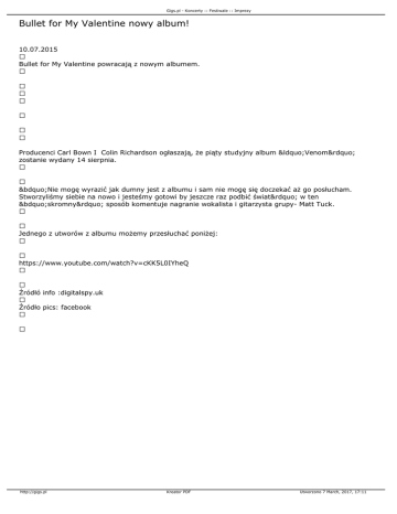 Gigs.pl - Koncerty :: Festiwale :: Imprezy Bullet for My Valentine nowy album! 10.07.2015 Bullet for My Valentine powracają z nowym albumem. Producenci Carl Bown I Colin Richardson ogłaszają, że piąty studyjny album “Venom” zostanie wydany 14 sierpnia. „Nie mogę wyrazić jak dumny jest z albumu i sam nie mogę się doczekać aż go posłucham. Stworzyliśmy siebie na nowo i jesteśmy gotowi by jeszcze raz podbić świat” w ten „skromny” sposób komentuje nagranie wokalista i gitarzysta grupy- Matt Tuck. Jednego z utworów z albumu możemy przesłuchać poniżej: https://www.youtube.com/watch?v=cKK5L0IYheQ Źródłó info :digitalspy.uk Źródło pics: facebook http://gigs.pl Kreator PDF Utworzono 7 March, 2017, 17:11