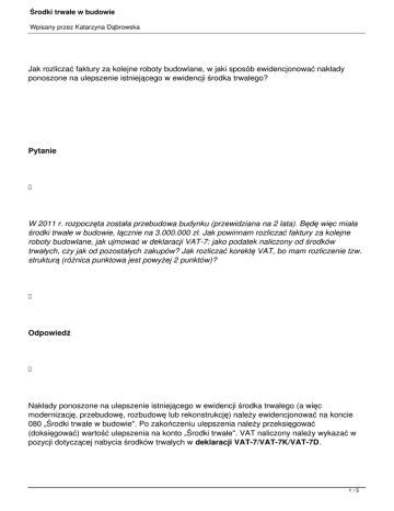 Środki trwałe w budowie Wpisany przez Katarzyna Dąbrowska Jak rozliczać faktury za kolejne roboty budowlane, w jaki sposób ewidencjonować nakłady ponoszone na ulepszenie istniejącego w ewidencji środka trwałego? Pytanie W 2011 r. rozpoczęta została przebudowa budynku (przewidziana na 2 lata). Będę więc miała środki trwałe w budowie, łącznie na 3.000.000 zł. Jak powinnam rozliczać faktury za kolejne roboty budowlane, jak ujmować w deklaracji VAT-7: jako podatek naliczony od środków trwałych, czy jak od pozostałych zakupów? Jak rozliczać korektę VAT, bo mam rozliczenie tzw. strukturą (różnica punktowa jest powyżej 2 punktów)? Odpowiedź Nakłady ponoszone na ulepszenie istniejącego w ewidencji środka trwałego (a więc modernizację, przebudowę, rozbudowę lub rekonstrukcję) należy ewidencjonować na koncie 080 „Środki trwałe w budowie". Po zakończeniu ulepszenia należy przeksięgować (doksięgować) wartość ulepszenia na konto „Środki trwałe". VAT naliczony należy wykazać w pozycji dotyczącej nabycia środków trwałych w deklaracji VAT-7/VAT-7K/VAT-7D. 1/5 Środki trwałe w budowie Wpisany przez Katarzyna Dąbrowska Proporcję określa się procentowo w stosunku rocznym na podstawie obrotu osiągniętego w roku poprzedzającym rok podatkowy, w odniesieniu do którego jest ustalana proporcja. Proporcję tę zaokrągla się w górę do najbliższej liczby całkowitej. Zarówno ustawa o rachunkowości, jak i przepisy ustaw o podatku dochodowym przewidują możliwość zwiększenia wartości początkowej środka trwałego o koszty ulepszenia. Ulepszenie polega m.in. na przebudowie istniejącego środka trwałego. Powoduje, że wartość użytkowa środka trwałego po zakończeniu ulepszenia przewyższa posiadaną przy przyjęciu do używania wartość użytkową, mierzoną okresem używania, zdolnością wytwórczą, jakością produktów uzyskiwanych za pomocą ulepszonego środka trwałego, kosztami eksploatacji lub innymi miarami. Księgowanie nakładów na ulepszenie środka trwałego Nakłady ponoszone na ulepszenie istniejącego w ewidencji środka trwałego (a więc przebudowę) należy ewidencjonować na koncie „Środki trwałe w budowie". Dopiero po zakończeniu ulepszenia poniesione nakłady należy przeksięgować na konto „Środki trwałe". 2/5 Środki trwałe w budowie Wpisany przez Katarzyna Dąbrowska W przypadku zakończenia powiększa procesu ulepszania się jego wartość środka . Dalszych początkowa trwałego odpisów amortyzacyjnych należy dokonać od Środki trwałe w budowie a VAT VAT naliczony z faktur zakupu towarów i usług związanych z przebudową środka trwałego należy wykazać w pozycji służącej do wykazywania VAT naliczonego od zakupów środków trwałych. Wydatki te zwiększają bowiem wartości środka trwałego. Nabycie należy wykazać w części D.2. „Nabycie towarów i usług". Wartość netto zakupu należy wykazać w poz. 49 deklaracji VAT-7 (VAT-7K lub VAT-7D - w zależności od rodzaju składanej przez podatnika deklaracji VAT) w pozycji „Nabycie towarów i usług zaliczanych do środków trwałych" . Odliczony podatek należy wykazać w poz. 50 deklaracji VAT. 3/5 Środki trwałe w budowie Wpisany przez Katarzyna Dąbrowska Na podatnikach wykorzystujących zakupione przez siebie towary i usługi do sprzedaży opodatkowanej i zwolnionej, którzy odliczali podatek naliczony związany z tymi zakupami w ubiegłym roku według wstępnej proporcji ustalonej zgodnie z art. 90 ust. 2 - 9 ustawy z 11 marca 2004 r. o podatku od towarów i usług (Dz.U. nr 54, poz. 535 z późn. zm.), dalej: ustawa o VAT , ciąży dodatkowy obowiązek dokonania rocznej korekty podatku odliczonego . W pierwszej kolejności należy dokonać obliczenia rzeczywistej proporcji dla zakończonego roku podatkowego, na podstawie której należy skorygować wstępne odliczenie podatku naliczonego. Proporcję tę ustala się jako udział rocznego obrotu za rok ubiegły z tytułu czynności, w związku z którymi przysługiwało podatnikowi prawo do obniżenia kwoty podatku należnego (licznik), w całkowitym obrocie uzyskanym z tytułu czynności, w związku z którymi podatnikowi przysługiwało prawo do obniżenia kwoty podatku należnego, oraz czynności, w związku z którymi podatnikowi takie prawo nie przysługiwało (mianownik). Przy obliczaniu proporcjinie uwzględnia się importu (nie stanowią towarów,one importu sprzedaży dotacji usług, w (subwencji) rozumieniu WNT, dostawy ustawy ,towaró nieo ma VA art. 29 ust. 1 ustawy o VAT Korekty dokonuje się w deklaracji podatkowej składanej za pierwszy okres rozliczeniowy roku następującego po roku podatkowym , za który dokonuje się korekty, tzn. podatnicy rozliczający się za okresy miesięczne korekty dokonają w deklaracji VAT za styczeń, a podatnicy rozliczający się kwartalnie w deklaracji za I kwartał. Proporcja ostateczna wyliczona za zakończony rok podatkowy będzie równocześnie proporcją wstępną na rok następny, uprawniającą podatnika w tym roku do pomniejszenia 4/5 Środki trwałe w budowie Wpisany przez Katarzyna Dąbrowska podatku należnego o podatek naliczony związany z zakupami służącymi działalności mieszanej w wysokości wynikającej z tej proporcji. Podstawa prawna: - art. 28 ust. 2 , art. 31 ustawy z 29 września 1994 r. o rachunkowości (Dz.U. z 2009 r. nr 152, poz. 1223 z późn. zm.) , - art. 16g ust. 13 ustawy z 15 lutego 1992 r. o podatku dochodowym od osób prawnych (Dz.U. z 2000 r. nr 54, poz. 654 z późn. zm.) , - art. 86 ust. 1 , art. 90 ust. 2 - 9 , art. 91 ust. 1 ustawy z 11 marca 2004 r. o podatku od towarów i usług (Dz.U. nr 54, poz. 535 z późn. zm.) . 5/5