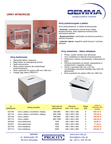 URNY WYBORCZE Urny przezroczyste z pleksi Urna sześciościenna, w całości przeźroczysta. - Kontrola: mechaniczny licznik wraz z klapą bezpieczeństwa, która zapewnia kontrolę ilości wrzucanych głosów. - Bezpieczeństwo: zamknięcie za pomocą zamków z różnymi kluczami. - Łatwość użycia: wygodne rączki boczne i ruchoma pokrywa. Urny metalowe – łatwo składane Urny kartonowe Niezwykle lekkie i poręczne. Biały karton na zewnętrznej stronie. Spód wzmocniony. Może zostać złożona dla swobodnego przechowywania. Dwie wysokości do wyboru 400 mm i 800 mm. Uwaga: bez napisu PROCITY nr katalogowy 527100 527110 527104 527114 527200 527201 527103 527113 rodzaj produktu Urna z pleksi z licznikiem i klapką Urna z pleksi z licznikiem i klapką Urna z pleksi Urna z pleksi Urna kartonowa Urna kartonowa Urna metalowa Urna metalowa GEMMA ul. Kościuszki 34 50-012 Wrocław Prosty i szybki montaż oraz demontaż. Urny rozkładane to łatwość przechowywania. Wykonane z blachy ocynkowanej i malowanej na biało. Pokrywa zamykana na zamek, wyposażona w zintegrowane i wygodne uchwyty. Otwór o wymiarze 220 mm x 20 mm, umożliwiający wsunięcie każdego typu karty do głosowania. Dwie wysokości do wyboru 400 mm i 800 mm. Ilość kart do głosowania Wymiary szer. x dł. x wys. Waga (kg) 600-800 800-1200 600-800 800-1200 1000 2000 1000 2000 400 x 400 x 320 400 x 400 x 450 400 x 400 x 320 400 x 400 x 450 400 x 400 x 400 400 x 400 x 800 400 x 400 x 400 400 x 400 x 800 5 6 4 5 2 3 7 11 www.pro-city.pl [email protected] tel. (071) 734 55 04 cena z rabatem 5% (netto) 658,35 zł 790,40 zł 399,00 zł 446,50 zł 58,90 zł 71,25 zł 333,45 zł 443,65 zł