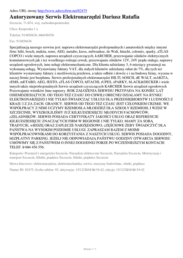 Adres URL strony http://www.adresyfirm.net/82475 Autoryzowany Serwis Elektronarzędzi Dariusz Ratafia Szczecin, 71-074, woj. zachodniopomorskie Ulica: Kasprzaka 1 a Telefon: 914856636, 604456556 Fax: 914856636 Specjalizacją naszego serwisu jest: naprawa elektronarzędzi profesjonalnych i amatorskich między innymi firm: hilti, bosch, makita, rems, AEG, metabo, kress, milwaukee, de Walt, hitachi, colomix, sparky, aTLAS COPCO i wiele innych, naprawa urządzeń czyszczących, kARCHER, przezwajanie silników elektrycznych komutatorowych jak i też wszelkiego rodzaju cewek, przezwajanie silników 12V, 24V prądu stałego, naprawy urządzeń ogrodowych, inne usługi elektromechaniczne. Dla klienta udzielamy 3, 6 miesięcy gwarancji na wykonaną usługę. Wystawiamy faktury VAT, dla stałych klientów udzielamy rabat do 7%, dla tych też klientów wystawiamy faktury z możliwością przelewu, a także odbiór i dowóz z i na budowę firmy, wycena w naszej firmie jest bezpłatna. Serwis profesjonalnych elektronarzędzi HILTI, bOSCH, dE WALT, mAKITA, rEMS, mETABO, AEG, fESTO, aTLAS COPCO, hITACHI, rUPES, sPARKY, bLACK&DECKER i wiele innych także nieprofesjonalnych Serwis urządzeń czyszczących KARCHER Serwis urządzeń ogrodowych Przezwajanie wirników Inne naprawy. ROK ZAŁOŻENIA SERWISU PRZYPADA NA KONIEC LAT OSIEMDZIESIĄTYCH. OD TEGO TEŻ CZASU DO CHWILI OBECNEJ DZIAŁAMY NA RYNKU ELEKTRONARZĘDZI I NIE TYLKO ŚWIADCZĄC USŁUGI DLA PRZEDSIĘBIORSTW I LUDNOŚCI Z KRAJU I Z ZA ZACH. GRANICY. SERWIS OD TEGO TEŻ CZASU JEST CZŁONKIEM CRZMiE. WE WSPÓŁPRACY Z NIMI UCZYMY RZEMIOSŁA MŁODZIEŻ DLA SZKOŁY RZEMIOSŁ I WZDZ W SZCZECINIE. WYSZKOLILIŚMY JUŻ KILKUDZIESIĘCIU MŁODYCH FACHOWCÓW, cZELADNIKÓW. SERWIS POSIADA CERTYFIKATY JAKOŚCI USŁUG ORAZ REFERENCJE KILKUDZIESIĘCIU ZNACZĄCYCH FIRM W REGIONIE I NIE TYLKO. MAMY ZA SOBĄ TRADYCJE, wIEDZĘ ORAZ ZAPLECZE NARZĘDZIOWO, cZĘŚCIOWE ŻEBY ŚWIADCZYĆ DLA PAŃSTWA NA WYSOKIM POZIOMIE USŁUGI. ZAPRASZAM RAZEM Z MOIMI WSPÓŁPRACOWNIKAMI DO KORZYSTANIA Z NASZYCH USŁUG. SERWIS POSIADA DOGODNY, bEZPŁATNY PARKING. JEŻELI NIE ODPOWIADAJĄ PAŃSTWU GODZINY OTWARCIA SERWISU UMÓWIMY SIĘ Z PAŃSTWEM O INNEJ DOGODNEJ PORZE PO WCZEŚNIEJSZYM KONTACIE TELEF. 0 604 456 556. Kategorie: Przemysł i energetyka Szczecin, Narzędzia elektryczne Szczecin, Narzędzia Szczecin, Motoryzacja i transport Szczecin, Silniki, prądnice Szczecin, Silniki, prądnice Szczecin Słowa kluczowe: elektronarzędzia, elektromechanika, serwis, maszyny budowlane, silniki, prądnice Numer ID: 82475, liczba odsłon: 93, aktywacja: 15/12/2010 06:54:42, edycja: 15/12/2010 06:54:42 Strona 1 / 1