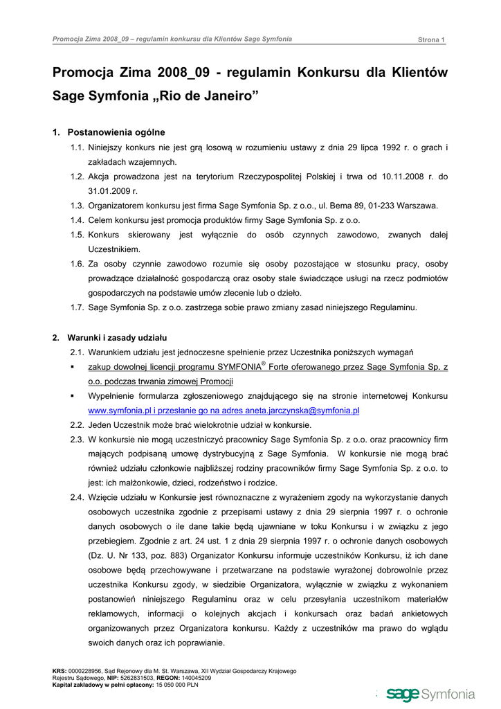 Strona 1 Promocja Zima 2008_09 – regulamin konkursu dla Klientów Sage Symfonia Promocja Zima 2008_09 - regulamin Konkursu dla Klientów Sage Symfonia „Rio de Janeiro” 1. Postanowienia ogólne 1.1. Niniejszy konkurs nie jest grą losową w rozumieniu ustawy z dnia 29 lipca 1992 r. o grach i zakładach wzajemnych. 1.2. Akcja prowadzona jest na terytorium Rzeczypospolitej Polskiej i trwa od 10.11.2008 r. do 31.01.2009 r. 1.3. Organizatorem konkursu jest firma Sage Symfonia Sp. z o.o., ul. Bema 89, 01-233 Warszawa. 1.4. Celem konkursu jest promocja produktów firmy Sage Symfonia Sp. z o.o. 1.5. Konkurs skierowany jest wyłącznie do osób czynnych zawodowo, zwanych dalej Uczestnikiem. 1.6. Za osoby czynnie zawodowo rozumie się osoby pozostające w stosunku pracy, osoby prowadzące działalność gospodarczą oraz osoby stale świadczące usługi na rzecz podmiotów gospodarczych na podstawie umów zlecenie lub o dzieło. 1.7. Sage Symfonia Sp. z o.o. zastrzega sobie prawo zmiany zasad niniejszego Regulaminu. 2. Warunki i zasady udziału 2.1. Warunkiem udziału jest jednoczesne spełnienie przez Uczestnika poniższych wymagań zakup dowolnej licencji programu SYMFONIA® Forte oferowanego przez Sage Symfonia Sp. z o.o. podczas trwania zimowej Promocji Wypełnienie formularza zgłoszeniowego znajdującego się na stronie internetowej Konkursu www.symfonia.pl i przesłanie go na adres [email protected] 2.2. Jeden Uczestnik może brać wielokrotnie udział w konkursie. 2.3. W konkursie nie mogą uczestniczyć pracownicy Sage Symfonia Sp. z o.o. oraz pracownicy firm mających podpisaną umowę dystrybucyjną z Sage Symfonia. W konkursie nie mogą brać również udziału członkowie najbliższej rodziny pracowników firmy Sage Symfonia Sp. z o.o. to jest: ich małżonkowie, dzieci, rodzeństwo i rodzice. 2.4. Wzięcie udziału w Konkursie jest równoznaczne z wyrażeniem zgody na wykorzystanie danych osobowych uczestnika zgodnie z przepisami ustawy z dnia 29 sierpnia 1997 r. o ochronie danych osobowych o ile dane takie będą ujawniane w toku Konkursu i w związku z jego przebiegiem. Zgodnie z art. 24 ust. 1 z dnia 29 sierpnia 1997 r. o ochronie danych osobowych (Dz. U. Nr 133, poz. 883) Organizator Konkursu informuje uczestników Konkursu, iż ich dane osobowe będą przechowywane i przetwarzane na podstawie wyrażonej dobrowolnie przez uczestnika Konkursu zgody, w siedzibie Organizatora, wyłącznie w związku z wykonaniem postanowień niniejszego Regulaminu oraz w celu przesyłania uczestnikom materiałów reklamowych, informacji o kolejnych akcjach i konkursach oraz badań ankietowych organizowanych przez Organizatora konkursu. Każdy z uczestników ma prawo do wglądu swoich danych oraz ich poprawianie. KRS: 0000228956, Sąd Rejonowy dla M. St. Warszawa, XII Wydział Gospodarczy Krajowego Rejestru Sądowego, NIP: 5262831503, REGON: 140045209 Kapitał zakładowy w pełni opłacony: 15 050 000 PLN Strona 2 Promocja Zima 2008_09 – regulamin konkursu dla Klientów Sage Symfonia 2.5. Osoby zgłaszające udział w Konkursie wyrażają tym samym swoją zgodę na publikację ich nazwisk i / lub nazwy firmy na stronie internetowej www.symfonia.pl 2.6. Zgłoszenie się do konkursu jest jednoznaczne z akceptacją niniejszych zasad. 3. Nagrody 3.1 Nagrodą dla zwycięzcy konkursu będzie dwuosobowa wycieczka do Rio de Janeiro. 3.2 Sage Symfonia zastrzega sobie prawo wyróżnienia więcej osób, niż tylko zwycięzcę. 3.3 Nagrodami dla wyróżnionych mogą być również aparaty cyfrowe lub inne niespodzianki. 4. Zasady przyznawania nagród 4.1 Laureatami zostanie 10 firm, które dokonają zakupu w okresie promocji zimowej oprogramowania Forte za największą kwotę. Następnie Laureaci będą musieli odpowiedzieć na pytania związane z promocją. (kontakt telefoniczny) – Laureatem konkursu zostanie osoba, która udzieli najwięcej poprawnych odpowiedzi na zadane pytania związane z Promocją Zimową. 4.2 Ogłoszenie zwycięzców nastąpi do 3 tygodni po zakończeniu konkursu. 4.3 Laureaci Konkursu zostaną powiadomieni o przyznanych im nagrodach pocztą elektroniczną na podany w formularzu zgłoszeniowym zwrotny adres e-mail. 4.4 Forma dostarczenia nagród zostanie uzgodniona indywidualnie z Laureatami. KRS: 0000228956, Sąd Rejonowy dla M. St. Warszawa, XII Wydział Gospodarczy Krajowego Rejestru Sądowego, NIP: 5262831503, REGON: 140045209 Kapitał zakładowy w pełni opłacony: 15 050 000 PLN