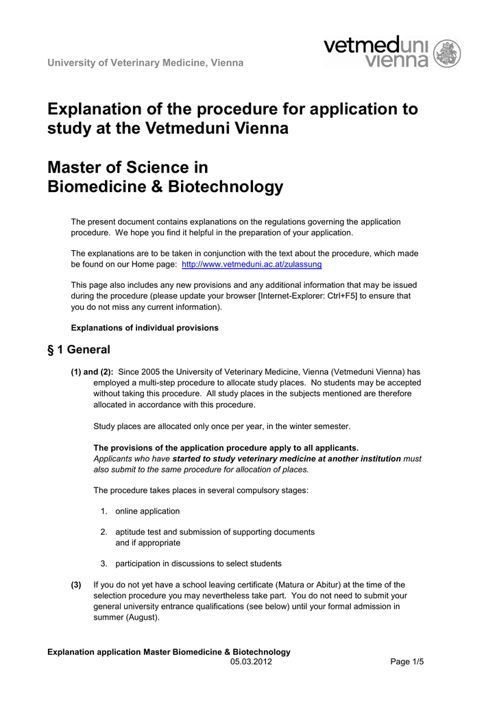 University of Veterinary Medicine, Vienna Explanation of the procedure for application to study at the Vetmeduni Vienna Master of Science in Biomedicine & Biotechnology The present document contains explanations on the regulations governing the application procedure. We hope you find it helpful in the preparation of your application. The explanations are to be taken in conjunction with the text about the procedure, which made be found on our Home page: http://www.vetmeduni.ac.at/zulassung This page also includes any new provisions and any additional information that may be issued during the procedure (please update your browser [Internet-Explorer: Ctrl+F5] to ensure that you do not miss any current information). Explanations of individual provisions § 1 General (1) and (2): Since 2005 the University of Veterinary Medicine, Vienna (Vetmeduni Vienna) has employed a multi-step procedure to allocate study places. No students may be accepted without taking this procedure. All study places in the subjects mentioned are therefore allocated in accordance with this procedure. Study places are allocated only once per year, in the winter semester. The provisions of the application procedure apply to all applicants. Applicants who have started to study veterinary medicine at another institution must also submit to the same procedure for allocation of places. The procedure takes places in several compulsory stages: 1. online application 2. aptitude test and submission of supporting documents and if appropriate 3. participation in discussions to select students (3) If you do not yet have a school leaving certificate (Matura or Abitur) at the time of the selection procedure you may nevertheless take part. You do not need to submit your general university entrance qualifications (see below) until your formal admission in summer (August). Explanation application Master Biomedicine & Biotechnology 05.03.2012 Page 1/5 University of Veterinary Medicine, Vienna Courses already completed at other institutions (even those relating to other subjects) may be recognized once you have been offered a place if they are of equivalent standing (if you wish, you may obtain the necessary forms on demand following completion of the selection procedure, in advance of your admittance). § 2 Admittance procedure for study places for the 2012/2013 academic year 2) Online application: The first step of your application is the online registration. Your data will be gathered and you will be entered into the applicant database. You may only apply for a single course of study. You will be assigned a registration number during the online registration. Please use this number at all stages of the procedure. Record the number immediately as you will need it to log in to your data later. Please note: Your data will be entered into the system the first time you press the “Continue" button. Tip: If you leave the registration procedure without completing it, you may amend or complete the data you have entered at any time up to the deadline for submitting applications. You will need your registration number and the password you choose to enter the system. In your own interest – and in ours – please only register once. Applications are only accepted via the online system. Participation in the procedure is only possible if the deadline for applications is respected. The order in which registrations are received is not related to the allocation of dates for the aptitude test. Once your online registration is complete you will automatically receive an e-mail confirmation containing all data you have entered. Check the contents and correct any mistakes by logging in with your registration number and password. Please ensure that you enter your e-mail address correctly (e-mail addresses always include one “@”), as this represents our means of communication with you. Please ensure that your mailbox is not full and check your mails regularly to make sure you do not miss any deadlines. Please note: If you see the following error message, or something similar, on the final page of the registration, you have entered your e-mail address incorrectly: ORA-20000: Fehler: ORA-29278: Transienter SMTP-Fehler: 450 4.1.2 : Recipient address rejected: Domain not found Log in again with your registration number and password and correct your e-mail address. Explanation application Master Biomedicine & Biotechnology 05.03.2012 Page 2/5 University of Veterinary Medicine, Vienna If there are any changes to your contact details (e-mail address, postal address etc.) during the application procedure, please inform us in writing. If you choose to inform us via e-mail, please note that for security reasons we will only accept changes sent to us from the mail address you gave in your online registration. 3) aptitude test and submission of supporting documents (Test procedure and method of assessment, see Point 4 below) The precise dates of the aptitude test will be announced via the Homepage of the Vetmeduni Vienna a few days after the deadline for submission of applications. For administrative reasons the tests may not be postponed. You must bring a valid photo identification with you. During the aptitude test your application documents will be collected. These include: a An authenticated copy (information on authentication is given below) of proof of identity (i.e. passport, identity card, driving license,…). b An authenticated copy (information on authentication is given below) of proof of nationality. Please note: Proof of nationality is effected by an official document that contains your nationality, e.g. passport, proof of citizenship, identity card (if this includes mention of the nationality). Please note: Your birth certificate does NOT represent proof of nationality as it does not mention your nationality. Tip: An authenticated copy of your passport will satisfy both a) and b). c An authenticated copy (information on authentication is given below) 