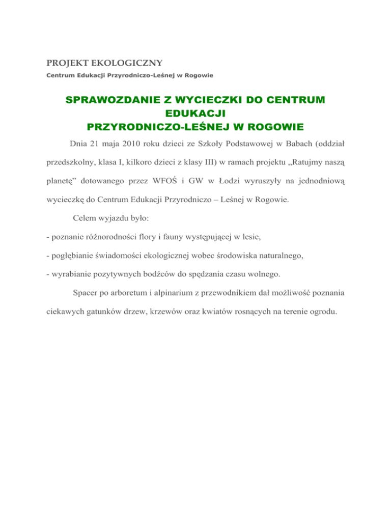 PROJEKT EKOLOGICZNY Centrum Edukacji Przyrodniczo-Leśnej w Rogowie SPRAWOZDANIE Z WYCIECZKI DO CENTRUM EDUKACJI PRZYRODNICZO-LEŚNEJ W ROGOWIE Dnia 21 maja 2010 roku dzieci ze Szkoły Podstawowej w Babach (oddział przedszkolny, klasa I, kilkoro dzieci z klasy III) w ramach projektu „Ratujmy naszą planetę” dotowanego przez WFOŚ i GW w Łodzi wyruszyły na jednodniową wycieczkę do Centrum Edukacji Przyrodniczo – Leśnej w Rogowie. Celem wyjazdu było: - poznanie różnorodności flory i fauny występującej w lesie, - pogłębianie świadomości ekologicznej wobec środowiska naturalnego, - wyrabianie pozytywnych bodźców do spędzania czasu wolnego. Spacer po arboretum i alpinarium z przewodnikiem dał możliwość poznania ciekawych gatunków drzew, krzewów oraz kwiatów rosnących na terenie ogrodu. Dzieci miały okazję zwiedzić Muzeum Lasu i Drewna. Podziwiały znajdujące się tam okazy leśnych zwierząt zamieszkujących nasz kraj. Widziały bogate zbiory owadów i ptaków, uzyskały wiele interesujących informacji np. jak obliczyć wiek drzewa. Uczestniczyliśmy także w ciekawych zajęciach edukacyjnych na świeżym powietrzu. Dzięki, którym dzieci poznały roślinność zamieszkujące las, ich zwyczaje oraz jak wygląda praca leśnika. leśną, zwierzęta Pobyt w Rogowie został urozmaicony poprzez zwiedzanie taboru kolejki wąskotorowej. Pobyt w Centrum Edukacji Przyrodniczo – Leśnej w Rogowie wzbogacił wiedzę dzieci o lesie, leśnictwie, ochronie przyrody i ekologii. Opracowały: Dorota Olczyk Elżbieta Fortak – Florczyk
