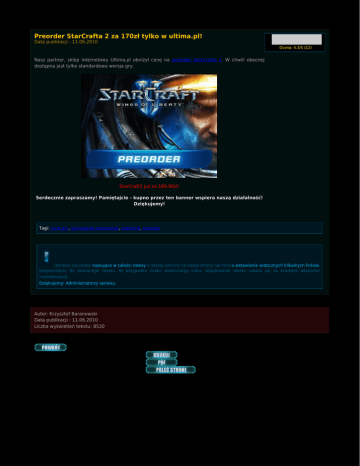 Preorder StarCrafta 2 za 170zł tylko w ultima.pl! Data publikacji : 11.06.2010 Ocena: 4.3/5 (12) Nasz partner, sklep internetowy Ultima.pl obniżył cenę na preorder StarCrafta 2. W chwili obecnej dostępna jest tylko standardowa wersja gry. StarCraft2 już za 169.90zł! Serdecznie zapraszamy! Pamiętajcie - kupno przez ten banner wspiera naszą działalność! Dziękujemy! Tagi: cena gry, wymagania systemowe, premiera, preorder Uprasza się osoby kopiujące w całości newsy z naszej witryny na swoje strony lub fora o wstawianie widocznych klikalnych linków, bezpośrednio do pobranego tekstu. W przypadku braku widocznego linku, skopiowanie tekstu uważa się za kradzież własności intelektualnej. Dziękujemy: Administratorzy serwisu. Autor: Krzysztof Baranowski Data publikacji : 11.06.2010 Liczba wyświetleń tekstu: 8530 Komentarz (86) dodaj komentarz za 20zł - widzę że nie zrozumiałeś mojej wypowiedzi - nie za czas pracy się płaci a za efekty. Argument z ośmioma latami produkcji dla mnie jest pustym zdaniem. Nie uważam że 200zł za SCII to dużo, ale jeszcze raz - nie czas pracy jest wyznacznikiem ceny. To kształtuje rynek, prawo podaży i popytu, oraz kilka innych czynników, które wszystkie można podsumować stwierdzeniem - coś jest tyle warte, ile ktoś jest skłonny za to zapłacić. A masa fanów SC jest skłonna zapłacić więcej niż 200zł.~CobraPunisher 2010/06/12 12:57 "A masa fanów SC jest skłonna zapłacić więcej niż 200zł." Oczywiscie! Np ja bardzo rzadko gram a co za tym idzie, rzadko kupuje gry. Dla mnie jednorazowy wydatek 200 zl (gdzie mam stypendium i prace) nie jest jakas szczegolna tragedia. Ba nawet postanowilem wydac ostatnio 500 zl na kupno lepszego kompa (na 1,8 GHz i 1 GB RAMu potrafilo przyciac, ale sie dalo grac! :D). Owszem, to jest duzo drozej niz inne gry, ale chyba raz mozna sie szarpnac na dwa razy wiekszy wydatek, nieprawdaz? :)~VerTax 2010/06/12 13:03 @CobraPunisher No nie do końca, tworzenie softu kosztuje tyle, ile roboczogodzin się w niego włoży + 10-50% w zależności dla kogo się robi ;) To akurat nie jest custom software, ale ilość pracy włożonej w projekt na pewno ma znaczenie tak dla ceny, jak i dla faktu podzielenia gry na 3 części.~AkodoRyu 2010/06/12 13:11 Nie wiem ile kosztuje robienie softu, ale wiem ile kosztuje robienie gier, a biorąc pod uwagę czas jaki Blizzard poświęcił na robienie SC2 to jest to raczej gigantyczna kwota. Podejrzewam że gdyby nie WoW mogło by być cienko.~Killst4r 2010/06/12 13:52 po pierwsze w praktyce oni tą gre nie robili 8 lat, tylko dużo mniej, gdyby beta testy zaczeli w tamtym roku wszystko byłoby na czas, mam tu balans na myśli i dopracowanie bugów.~Fanek 2010/06/12 14:13 lol jak ogladam stare gameplaye z 2007 roku, to bylo wiele roznych fajnych jednostek i umiejetnosci ktore zostaly pousuwane do dnia dzisiejszego, troche szkoda, i grafika mi sie zdaje troche zbyt kreskowkowa w stosunku do mrocznych epickich swietnie zrealizowanych cinematic trailerow, przykladowo taki hydralisk na filmiku wyglada swietnie i przerazajaco a juz w samej grze to taki maly fajny zwierzaczek, taki pokemonik w stylu pikaczu :)~Kris_to 2010/06/12 14:58 To są czyste presumpcje. Dopóki na szali nie stanie ciężar ilości kodu to można tak snuć przypuszczenia w nieskończoność i nikt nie będzie miał prawa napisać że ma rację. Nie możecie też stwierdzić że Blizzard przez 8 lat tworzył grę i nic innego nie robił (tzn. że robił to najszybciej jak można było). Za 5 miesięcy zaprezentuję światu metodę bez przewodowego przesyłu energii elektrycznej (na duże odległości, bez większych ograniczeń mocy, częstotliwości, itp.) i powiem przy tym że pracowałem nad tym przez większość życie więc teraz płacicie mi za patent bajońskie sumy, dwa razy dziennie. A tak na prawdę wymyśliłem to pewnego dnia podczas poobiedniej sjesty.* To żart i porównanie, dla tych, którzy nie załapali.~CobraPunisher 2010/06/12 15:22 "i powiem przy tym że pracowałem nad tym przez większość życie więc teraz płacicie mi za patent bajońskie sumy, dwa razy dziennie." oczywiście, twój patent, twój pomysł i możesz żądać ile ci się tylko podoba~Killst4r 2010/06/12 15:31 Jak narazie technologia przesyłu prądu bezprzewodowo dopiero raczkuje, pierwsze próby choc pomyslne narazie nie wroza rewolucji w tej kwestii~Kris_to 2010/06/12 15:35 "lol jak ogladam stare gameplaye z 2007 roku, to bylo wiele roznych fajnych jednostek i umiejetnosci ktore zostaly pousuwane do dnia dzisiejszego" Te fajne umiejętności wyleciały bo psuły grę swoim nie zbalansowaniem. Wyobraź zresztą sobie, że teraz do Twojej bazy wpada pierwotna wersja Mothershipa. Nie mam w zasadzie pojęcia, czy wogule byłby sens próbować się bronić ;P Najśmieszniejsze byłoby to, że Twoj przeciwnik mógłby dysponować w tym momencie apm na poziomie 5, a 200 i i tak Twój przeciwnik byłby skuteczniejszy. Zapuściłby Ci te laserki, wyznaczył trasę przelotu, a jakby skończył, to niemiałbyś połowy bazy. Zaiste, fajne umiejętności to były ;)~Sulphuriell 2010/06/12 15:41 wez pod uwage ze np mothershipa mozna bylo miec 1 :)~drivex18 2010/06/12 16:00 @drivex18 Czyli tak jak teraz...~Dark_Angel 2010/06/12 16:40 dla mnie jak na razie najlepsza oferta to sam kluczyk - http://www.gamecodes.pl/starcraft-2-cd-key.html~borek87 2010/06/12 17:27 ~borek87 To jest to na co czekam ;) nie potrzeba mi płyty, która będzie brzęczała w napędzie, ani książeczki z instrukcją obsługi marina ;P aczkolwiek 150 to za sam klucz wciąż dużo ;P liczyłem na jakieś 100-120 zł :P~Kuczyniak 2010/06/12 18:15 @Kuczyniak Dokładnie :) żadnego plastiku ani makulatury również mi nie potrzeba. Mam nadzieję, że znajdę jeszcze taniej :)~borek87 2010/06/12 18:47 az taki glupi to nie jestem zeby kupowac kolekcjonerska wersje, ale sam klucz by mi nie wystarczyl, chce miec pudelko plytke i instrukcje, chociaz i ta