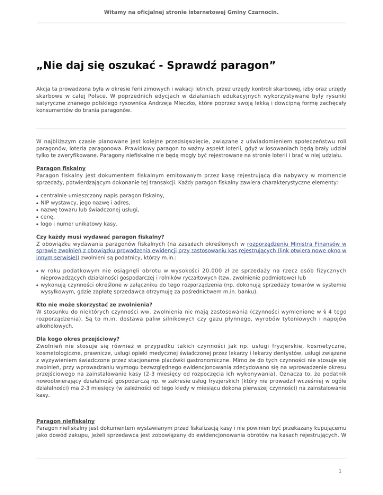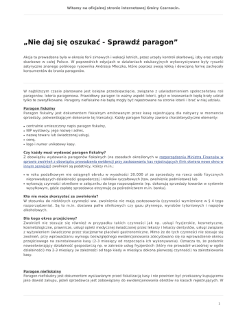 Witamy na oficjalnej stronie internetowej Gminy Czarnocin. „Nie daj się oszukać - Sprawdź paragon” Akcja ta prowadzona była w okresie ferii zimowych i wakacji letnich, przez urzędy kontroli skarbowej, izby oraz urzędy skarbowe w całej Polsce. W poprzednich edycjach w działaniach edukacyjnych wykorzystywane były rysunki satyryczne znanego polskiego rysownika Andrzeja Mleczko, które poprzez swoją lekką i dowcipną formę zachęcały konsumentów do brania paragonów. W najbliższym czasie planowane jest kolejne przedsięwzięcie, związane z uświadomieniem społeczeństwu roli paragonów, loteria paragonowa. Prawidłowy paragon to ważny aspekt loterii, gdyż w losowaniach będą brały udział tylko te zweryfikowane. Paragony niefiskalne nie będą mogły być rejestrowane na stronie loterii i brać w niej udziału. Paragon fiskalny Paragon fiskalny jest dokumentem fiskalnym emitowanym przez kasę rejestrującą dla nabywcy w momencie sprzedaży, potwierdzającym dokonanie tej transakcji. Każdy paragon fiskalny zawiera charakterystyczne elementy: ● ● ● ● ● centralnie umieszczony napis paragon fiskalny, NIP wystawcy, jego nazwę i adres, nazwę towaru lub świadczonej usługi, cenę, logo i numer unikatowy kasy. Czy każdy musi wydawać paragon fiskalny? Z obowiązku wydawania paragonów fiskalnych (na zasadach określonych w rozporządzeniu Ministra Finansów w sprawie zwolnień z obowiązku prowadzenia ewidencji przy zastosowaniu kas rejestrujących (link otwiera nowe okno w innym serwisie)) zwolnieni są podatnicy, którzy m.in.: ● ● w roku podatkowym nie osiągnęli obrotu w wysokości 20.000 zł ze sprzedaży na rzecz osób fizycznych nieprowadzących działalności gospodarczej i rolników ryczałtowych (tzw. zwolnienie podmiotowe) lub wykonują czynności określone w załączniku do tego rozporządzenia (np. dokonują sprzedaży towarów w systemie wysyłkowym, gdzie zapłatę sprzedawca otrzymuję za pośrednictwem m.in. banku). Kto nie może skorzystać ze zwolnienia? W stosunku do niektórych czynności ww. zwolnienia nie mają zastosowania (czynności wymienione w § 4 tego rozporządzenia). Są to m.in. dostawa paliw silnikowych czy gazu płynnego, wyrobów tytoniowych i napojów alkoholowych. Dla kogo okres przejściowy? Zwolnień nie stosuje się również w przypadku takich czynności jak np. usługi fryzjerskie, kosmetyczne, kosmetologiczne, prawnicze, usługi opieki medycznej świadczonej przez lekarzy i lekarzy dentystów, usługi związane z wyżywieniem świadczone przez stacjonarne placówki gastronomiczne. Mimo że do tych czynności nie stosuje się zwolnień, przy wprowadzaniu wymogu bezwzględnego ewidencjonowania zdecydowano się na wprowadzenie okresu przejściowego na zainstalowanie kasy (2-3 miesięcy od rozpoczęcia ich wykonywania). Oznacza to, że podatnik nowootwierający działalność gospodarczą np. w zakresie usług fryzjerskich (który nie prowadził wcześniej w ogóle działalności) ma 2-3 miesięcy (w zależności od tego kiedy w miesiącu dokona pierwszej czynności) na zainstalowanie kasy. Paragon niefiskalny Paragon niefiskalny jest dokumentem wystawianym przed fiskalizacją kasy i nie powinien być przekazany kupującemu jako dowód zakupu, jeżeli sprzedawca jest zobowiązany do ewidencjonowania obrotów na kasach rejestrujących. W 1 Witamy na oficjalnej stronie internetowej Gminy Czarnocin. przypadku niewydania paragonu, jak również wydania paragonu niefiskalnego przez podatnika, na którym ciąży obowiązek jego wystawienia, wartość podatku VAT z reguły i tak jest pobierana od konsumenta. To konsument ostatecznie płaci podatek w cenie towaru lub usługi, jednak nie trafia on do budżetu, lecz do „kieszeni" sprzedawcy. Co jest istotne nie tylko z punktu widzenia społecznego, ale również w aspekcie uczciwej konkurencji – przedsiębiorców, którzy rzetelnie płacą podatki. Przykładem branży, w której zjawisko paragonów niefiskalnych jest szczególnie obecne, jest gastronomia. Funkcjonuje tu często „paragon" potocznie nazywany rachunkiem lub paragonem kelnerskim. W felietonie przygotowanym, przy użyciu ukrytej kamery, przez Telewizję Polską na potrzeby Wielkiego Testu o Podatkach, możemy zobaczyć, że w wielu punktach gastronomicznych klientom wydawane są takie właśnie paragony. Paragony niefiskalne w praktyce Często spotykaną sytuacją w punktach sprzedaży jest próba wydawania potwierdzenia zapłaty kartą płatniczą jako paragonu. Wydruk z karty, stanowiący dowód zapłaty kartą płatniczą lunb kredytową nie zastępuje paragonu fiskalnego. *** To ty decydujesz! Aktualna odsłona kampanii paragonowej, podobnie jak poprzednie, kierowana jest do konsumentów. To konsument decyduje o tym, czy ostatecznie bierze paragon. To również on, jako posiadacz paragonu, ma możliwość jego sprawdzenia. Dlatego dziś zwracamy uwagę konsumentów nie tylko na egzekwowanie paragonu, ale również o jego sprawdzenie. Do naszej akcji zapraszamy nie tylko konsumentów, ale również przedsiębiorców. Dla wszystkich przygotowaliśmy zamieszczone poniżej materiały informacyjne – banery internetowe i plakat. Zapraszamy do pobierania materiałów i eksponowania ich na własnych stronach internetowych, w siedzibach przedsiębiorstw czy urzędów. Poprzez włączenie się do naszej kampanii, wspierasz samego siebie – walczysz z oszustwami i masz pozytywny wpływ na rozwój silnego państwa. Źródło: http://www.mf.gov.pl/ 2