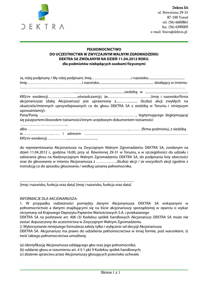 Dektra SA ul. Równinna 29-31 87-100 Toruń tel. (56) 6600861 fax. (56) 6390005 e-mail: [email protected] PEŁNOMOCNICTWO DO UCZESTNICTWA W ZWYCZAJNYM WALNYM ZGROMADZENIU DEKTRA SA ZWOŁANYM NA DZIEŃ 11.04.2012 ROKU. dla podmiotów niebędących osobami fizycznymi Ja, niżej podpisany / My niżej podpisani, Imię…………………………..i nazwisko.............................................. Imię……………………………………..i nazwisko..................................................................... działający w imieniu: ………………………………………………………………………………………………………………… ……………………………………................................................................siedzibą w ...................................................... KRS/nr ewidencji…………..................oświadczam(y), że.……………………………(imię i nazwisko/firma akcjonariusza) (dalej Akcjonariusz) jest uprawniony z......……........... (liczba) akcji zwykłych na okaziciela/imiennych uprzywilejowanych co do głosu DEKTRA SA z siedzibą w Toruniu i niniejszym upoważniam(y): Pana/Panią ……………………………………………………….…………, legitymującego (legitymującą) się paszportem/dowodem tożsamości/innym urzędowym dokumentem tożsamości ………………………………., albo ……………………………………………………………………...………(firma podmiotu), z siedzibą w……….…………..…… i adresem ……………………………………………………………………… KRS/nr ewidencji……………........................................ do reprezentowania Akcjonariusza na Zwyczajnym Walnym Zgromadzeniu DEKTRA SA, zwołanym na dzień 11.04.2012 r., godzina 16:00, przy ul. Równinnej 29-31 w Toruniu, a w szczególności do udziału i zabierania głosu na Nadzwyczajnym Walnym Zgromadzeniu DEKTRA SA, do podpisania listy obecności oraz do głosowania w imieniu Akcjonariusza z ……………..(liczba) akcji / ze wszystkich akcji zgodnie z instrukcją co do sposobu głosowania / według uznania pełnomocnika. _____________________________ ______________________________ [imię i nazwisko, funkcja oraz data] [imię i nazwisko, funkcja oraz data] INFORMACJE DLA AKCJONARIUSZA: 1. W przypadku rozbieżności pomiędzy danymi Akcjonariusza DEKTRA SA wskazanymi w pełnomocnictwie a danymi znajdującymi się na liście akcjonariuszy sporządzonej w oparciu o wykaz otrzymany od Krajowego Depozytu Papierów Wartościowych S.A. i przekazanego DEKTRA SA na podstawie art. 406 (3) Kodeksu spółek handlowych Akcjonariusz DEKTRA SA może nie zostać dopuszczony do uczestnictwa w Zwyczajnym Walnym Zgromadzeniu. 2. Wykorzystanie niniejszego formularza zależy tylko i wyłącznie od decyzji Akcjonariusza DEKTRA SA. Akcjonariusz ma prawo do udzielenia pełnomocnictwa w innej formie, pod warunkiem, iż treść takiego pełnomocnictwa umożliwią: (a) identyfikację Akcjonariusza oddającego głos oraz jego pełnomocnika; (b) oddanie głosu w rozumieniu art. 4 § 1 pkt 9 Kodeksu spółek handlowych; (c) złożenie sprzeciwu przez Akcjonariuszy głosujących przeciwko uchwale; Strona 1 z 1