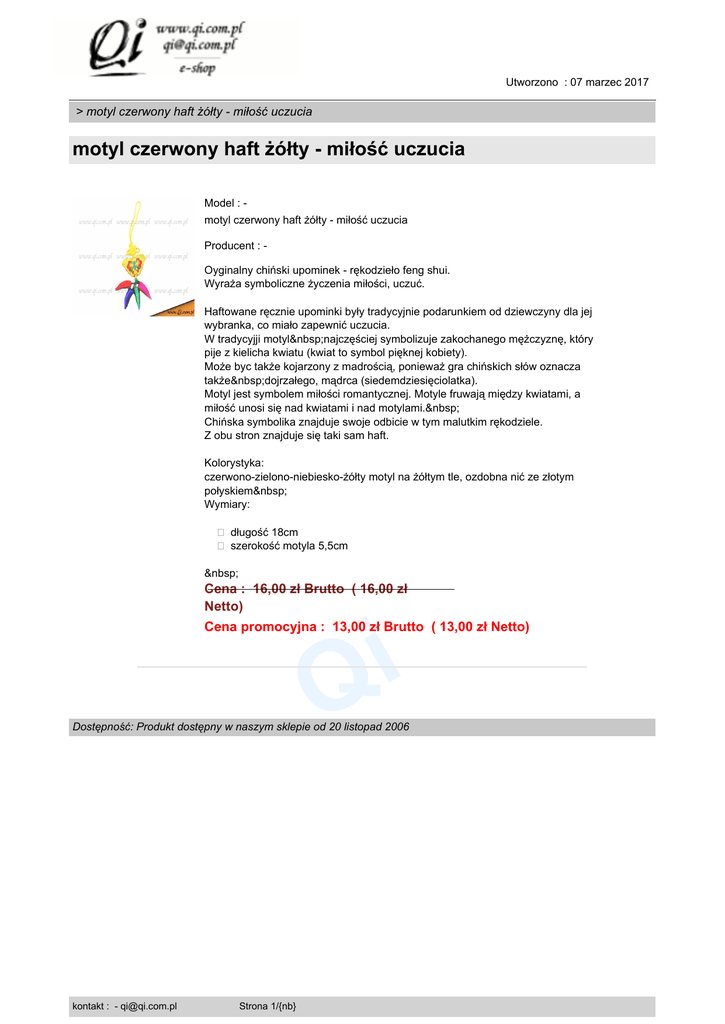 Utworzono : 07 marzec 2017 > motyl czerwony haft żółty - miłość uczucia motyl czerwony haft żółty - miłość uczucia Model : motyl czerwony haft żółty - miłość uczucia Producent : Oyginalny chiński upominek - rękodzieło feng shui. Wyraża symboliczne życzenia miłości, uczuć. Haftowane ręcznie upominki były tradycyjnie podarunkiem od dziewczyny dla jej wybranka, co miało zapewnić uczucia. W tradycyjji motyl najczęściej symbolizuje zakochanego mężczyznę, który pije z kielicha kwiatu (kwiat to symbol pięknej kobiety). Może byc także kojarzony z madrością, ponieważ gra chińskich słów oznacza także dojrzałego, mądrca (siedemdziesięciolatka). Motyl jest symbolem miłości romantycznej. Motyle fruwają między kwiatami, a miłość unosi się nad kwiatami i nad motylami. Chińska symbolika znajduje swoje odbicie w tym malutkim rękodziele. Z obu stron znajduje się taki sam haft. Kolorystyka: czerwono-zielono-niebiesko-żółty motyl na żółtym tle, ozdobna nić ze złotym połyskiem Wymiary: � długość 18cm � szerokość motyla 5,5cm Cena : 16,00 zł Brutto ( 16,00 zł Netto) i Q Cena promocyjna : 13,00 zł Brutto ( 13,00 zł Netto) Dostępność: Produkt dostępny w naszym sklepie od 20 listopad 2006 kontakt : - [email protected] Strona 1/{nb}