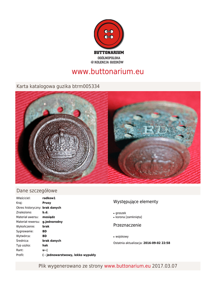 www.buttonarium.eu Karta katalogowa guzika btrm005334 Dane szczegółowe Właściciel: radkow1 Kraj: Prusy Występujące elementy Okres historyczny: brak danych Znaleziono: b.d. Materiał awersu: mosiądz Materiał rewersu: g.jednorodny Wykończenie: brak Sygnowanie: BD Wytwórca: BD Średnica: brak danych Typ uszka: hak Rant: u--| Profil: ( - jednowarstwowy, lekko wypukły ● ● groszek korona [zamknięta] Przeznaczenie ● wojskowy Ostatnia aktualizacja: 2016-09-02 22:58 Plik wygenerowano ze strony www.buttonarium.eu 2017.03.07 Opis guzika btrm005334 Pruski guzikohak wojskowy wzór 1907/10 © buttonarium.eu Awers przedstawia pruską, królewską (!!!) koronę zamkniętą umieszczoną na groszkowanym tle, na obrzeżu guzika znajduje się pojedynczy, wypukły rant. W kolejnej wersji guzika korona zajmowała cały awers. Obie wersje guzików wykorzystywano aż do roku 1919. Ciekawostka Guzik przedstawia najprawdopodobniej koronę królewską Wilhelma II Hohenzollerna, która powstała w 1888 roku. Rewers sygnowany: BD. Ciekawostka Guzikohaki były czasami sygnowane na rewersie, ale od strony wewnętrznej. Przeznaczenie i datowanie Guziki tego typu były przeznaczone tylko do mundurów polowych Model 1907/10 (M1907/10). W różnych formacjach wprowadzano je, do użytku dokumentami zwanymi allgemeine königliche order (AKO), w różnym czasie: ● ● ● ● ● Piechota i Artyleria - AKO z 19.04.1907 roku, Ułani, Dragonii, Kirasjerzy (do mundurów typu Koller) - AKO z 03.05.1908 roku, Husarzy - AKO z 22.11.1909 roku, Szwoleżerowie - AKO z 25.07.1909 roku, Kirasjerzy (do mundurów typu Feldrock) i oficerowie - AKO z 23.02.1910 roku[1]. Kolejny wzór guzików przeznaczony był już dla żołnierzy wszystkich rodzajów wojsk (włącznie z kawalerią) i wprowadzono go do użytku wraz z wprowadzeniem nowego wzoru umundurowania Model 1915 (M1915), w wyniku realizacji AKO z 21 września 1915 roku, czyli głównego królewskiego zamówienia. Ciekawostka Guzik ten nazywany był talienknopf, czyli guzikohak i służył do podtrzymywania pasa głównego, na którym zawieszano część oporządzenia. Guzikohaki przyszywano do kurtki mundurowej na jej bokach (lekko z tyłu). Wymiary guzików Zgodnie z ówczesnym regulaminem obowiązywały dwie wielkości tego guzika: ● ● duże o średnicy 8 linii ± ½ linii, czyli około 20,3 mm ± 1,3 mm - do zapinania bluzy munduru, małe o średnicy 6 linii ± ½ linii, czyli około 17,8 mm ± 1,3 mm - do dolnych kieszeni. Ciekawostka Dawniej, kaliber broni oraz średnice guzików mierzono w tzw. liniach, czyli odpowiednik 1/10 cala, czyli 2,54 mm. Źródła Podobne guziki na stronie Buttonarium Polska www.kaisersbunker.com - Model 1907/10 Feldrock [1] Wikipedia.pl - Cal Wikipedia.pl - Dragoni Wikipedia.pl - Husaria Wikipedia.pl - Kirasjerzy Wikipedia.pl - Linia (jednostka) Wikipedia.pl - Korona Wilhelma II Hohenzollerna Wikipedia.pl - Szwoleżerowie Wikipedia.pl - Ułan Wikipedia.pl - Wilhelm II Hohenzollern www.kaisersbunker.com - Model 1915/16 Bluse Wytwórca: BD Opis tego wytwórcy jest jeszcze w trakcie opracowania. Plik wygenerowano ze strony www.buttonarium.eu 2017.03.07