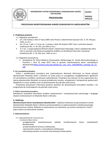 WEWNĘTRZNY SYSTEM ZAPEWNIANIA I DOSKONALENIA JAKOŚCI KSZTAŁCENIA Symbol WSDZJKWNoZ/8 PROCEDURA PROCEDURA MONITOROWANIA KARIER ZAWODOWYCH ABSOLWENTÓW 1. Podstawy prawne 1.1. Regulacje zewnętrzne art. 13a Ustawy z dnia 27 lipca 2005 roku Prawo o szkolnictwie wyższym (Dz. U. Nr 164,poz. 1365, ze zm.) art. 23 ust. 1 pkt 1 i 2 oraz ust. 2 ustawy z dnia 29 sierpnia 1997 roku o ochronie danych osobowych (Dz. U. Nr 101, poz.926 ze zm.) § 7 ust. 1 rozporządzenia Ministra Nauki i Szkolnictwa Wyższego z dnia 5 października 2011 roku w sprawie warunków prowadzenia studiów na określonym kierunku i poziomie kształcenia (Dz. U. Nr 243, poz. 1445 ze zm.) 1.2. Regulacje wewnętrzne Zarządzenie Nr 33/12 Rektora Uniwersytetu Medycznego im. Karola Marcinkowskiego w Poznaniu z dnia 22 maja 2012 roku w sprawie monitorowania karier zawodowych absolwentówhttps://www.ump.edu.pl/files/12_sub_1751_1362390765_uchwala_42_12. pdf 2. Cel i przedmiot procedury Celem i przedmiotem procedury jest systematyczne zbieranie informacji na temat sytuacji absolwentów Wydziału Nauk o Zdrowiu na rynku pracy ze szczególnym uwzględnieniem zgodności ich zatrudnienia z profilem i poziomem wykształcenia. Procedura ma również na celu zapoznanie się z opinią absolwentów Wydziału na temat przydatności wiedzy, umiejętności i kompetencji społecznych zdobytych w czasie studiów oraz ich dostosowania do potrzeb rynku pracy. Pozyskanie powyższych informacji powinno posłużyć do dostosowania kierunków studiów i ich programów do zmieniających się potrzeb rynku pracy. 3. Zakres stosowania procedury Absolwenci wszystkich kierunków studiów stacjonarnych i niestacjonarnych pierwszego i drugiego stopnia realizowanych na Wydziale Nauk o Zdrowiu. 4. Definicje Monitorowanie karier zawodowych absolwentów – badania ankietowe przeprowadzane wśród absolwentów Wydziału Nauk o Zdrowiu przeprowadzane za wykorzystaniem standaryzowanego kwestionariusza ankiety. Badania te wykonywane są trzykrotnie: po sześciu miesiącach, trzech i pięciu latach od ukończenia studiów. 5. Odpowiedzialność 5.1. odpowiedzialność merytoryczna Uczelniane Biuro Karier: -przygotowanie kwestionariusza ankiety monitorowania absolwentów, -przeprowadzenie procesu ankietyzacji, -opracowanie raportu z prowadzonej ankietyzacji, -aktualizacja danych na stronie internetowej Uniwersytetu. karier zawodowych Dziekanat WNoZ: - upowszechnianie informacji o przeprowadzonych badaniach absolwentów wśród studentów wszystkich poziomów nauczania, - zbieranie oświadczeń absolwentów o wyrażeniu zgody/braku zgody na udział w badaniach ankietowych monitorowania karier zawodowych absolwentów Wydziałowy Zespół ds. Doskonalenia i Zapewnienia Jakości Kształcenia - przeprowadzenie analizy wyników ankietyzacji absolwentów przeprowadzonej przez uczelnianie Biuro Karier. 5.2. odpowiedzialność funkcjonalna Wydziałowy Zespół ds. Doskonalenia i Zapewnienia Jakości Kształcenia : - zaakceptowanie kwestionariusza ankiety monitorowania karier zawodowych absolwentów ze szczególnym uwzględnieniem specyfiki kierunkowa studiów realizowanych na wydziale, - przygotowanie propozycji działań naprawczych mających na celu dostosowanie programów kształcenia do aktualnych potrzeb rynku pracy. 5.3. nadzór Dziekan WNoZ – zatwierdzanie działań naprawczych mających na celu dostosowanie programów kształcenia do aktualnych potrzeb rynku pracy 6. Sposób postępowania 6.1. Jednostką odpowiedzialną za monitorowanie karier zawodowych absolwentów, w tym absolwentów Wydziału Nauk o Zdrowiu jest uczelniane Biuro Karier. Do najważniejszych zadań biura należy: przygotowanie kwestionariusza ankiety monitorowania karier zawodowych absolwentów – opracowany kwestionariusz zostaje przedstawiony do akceptacji Wydziałowemu Zespołowi ds. Doskonalenia i Zapewnienia Jakości Kształcenia, opracowanie skierowanego do absolwentów Oświadczenia o wyrażeniu zgody na udział w badaniu monitorowania karier zawodowych absolwentów oraz Oświadczenia o wyrażeniu zgody na przetwarzanie danych osobowych, rozsyłanie drogą elektroniczną, do absolwentów WNoZ, personalizowanych linków do formularza ankiety, przeprowadzanie telefonicznego wywiadu z absolwentami, którzy we wskazanym terminie nie wypełnili formularza ankiety przygotowanie Raportu z przeprowadzonych badań, przekazanie Raportu Wydziałowemu Zespołowi ds. Doskonalenia i Zapewnienia Jakości Kształcenia. 6.2. Uczelniane Biuro Karier współpracuje z Dziekanatem WNoZ w celu usprawnienia procedury monitorowania karier zawodowych absolwentów. W ramach tej współpracy Dziekanat WNoZ: umieszcza i aktualizuje na stronach wydziału informacje mające na celu zachęcenie absolwentów do wzięcia udziału w badaniach ankietowych, pracownicy dziekanatu, przed złożeniem egzaminu dyplomowego, zbierają Oświadczenia o wyrażeniu zgody na udział w badaniu monitorowania karier zawodowych absolwentów oraz Oświadczenia o wyrażeniu zgody na przetwarzanie danych osobowych i przekazują je do uczelnianego Biura Karier, aktualizują w systemie Dziekanat.XP status studentów, którzy złożyli egzamin dyplomowy, weryfikują ich dane adresowe. 7. Procedury powiązane z przedmiotem i zakresem procedury 7.1. Procedura upowszechniania informacji 7.1. Procedura badań ankietowych (w opracowaniu) 8. Załączniki 1. schemat odpowiedzialności 2. formularz zgody na udział w badaniach ankietowych załącznik 1 SCHEMAT ODPOWIEDZIALNOŚCI – WSDJK-WNoZ/8 PROCEDURA MONITOROWANIA KARIER ZAWODOWYCH ABSOLWENTÓW Odpowiedzialni Zadania Uczelniane Biuro Karier Przygotowanie kwestionariusza ankiety monitorowania karier zawodowych absolwentów. Przeprowadzenie procesu ankietyzacji. Opracowanie raportu z prowadzonej ankietyzacji. Aktualizacja danych na stronie internetowej Uniwersytetu. Wydziałowy Zespół ds Doskonalenia i Zapewnienia Jakości Kształcenia Zaopiniowanie kwestionariusza opracowanego przez Biuro Karier