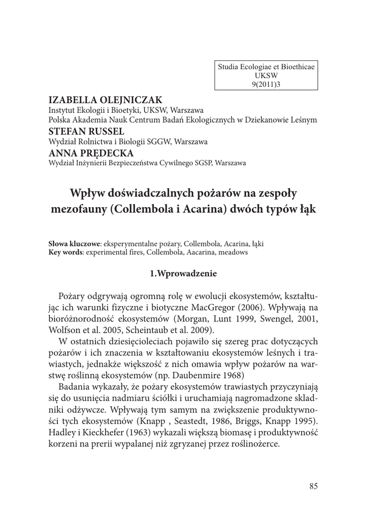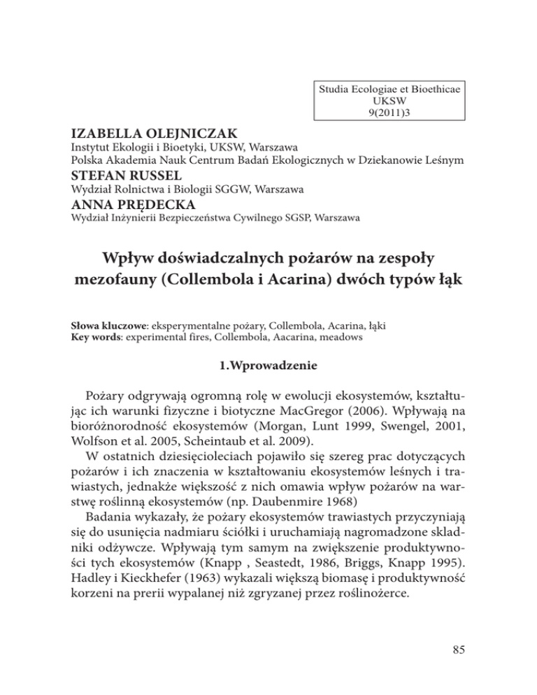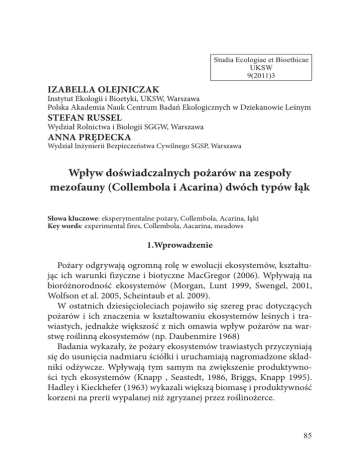 Studia Ecologiae et Bioethicae UKSW 9(2011)3 IZABELLA OLEJNICZAK Instytut Ekologii i Bioetyki, UKSW, Warszawa Polska Akademia Nauk Centrum Badań Ekologicznych w Dziekanowie Leśnym STEFAN RUSSEL Wydział Rolnictwa i Biologii SGGW, Warszawa ANNA PRĘDECKA Wydział Inżynierii Bezpieczeństwa Cywilnego SGSP, Warszawa Wpływ doświadczalnych pożarów na zespoły mezofauny (Collembola i Acarina) dwóch typów łąk Słowa kluczowe: eksperymentalne pożary, Collembola, Acarina, łąki Key words: experimental fires, Collembola, Aacarina, meadows 1.Wprowadzenie Pożary odgrywają ogromną rolę w ewolucji ekosystemów, kształtując ich warunki fizyczne i biotyczne MacGregor (2006). Wpływają na bioróżnorodność ekosystemów (Morgan, Lunt 1999, Swengel, 2001, Wolfson et al. 2005, Scheintaub et al. 2009). W ostatnich dziesięcioleciach pojawiło się szereg prac dotyczących pożarów i ich znaczenia w kształtowaniu ekosystemów leśnych i trawiastych, jednakże większość z nich omawia wpływ pożarów na warstwę roślinną ekosystemów (np. Daubenmire 1968) Badania wykazały, że pożary ekosystemów trawiastych przyczyniają się do usunięcia nadmiaru ściółki i uruchamiają nagromadzone skladniki odżywcze. Wpływają tym samym na zwiększenie produktywności tych ekosystemów (Knapp , Seastedt, 1986, Briggs, Knapp 1995). Hadley i Kieckhefer (1963) wykazali większą biomasę i produktywność korzeni na prerii wypalanej niż zgryzanej przez roślinożerce. 85 Izabella Olejniczak, Stefan Russel, Anna Prędecka Bezsprzecznie, pożary wpływają na mikroklimat gleby (Hulberr 1969). Wraz z usunięciem ściółki wiąże się zmniejszenie wilgotności gleby (Knapp, Seastedt 1986). Wysokość temperatury w czasie pożaru zależy od ilości i jakości spalanego paliwa, właściwości gleby, przede wszystkim jej wilgotności i przepuszczalności (Fisher, Binkley 2000). Wpływ pożarów na bezkręgowce glebowe zwłaszcza mezofaunę jest kontrowersyjny. Wysokie temperatury jakie towarzyszą pożarom powodują śmierć bezkręgowców zasiedlających ściółkę i wierzchnie warstwy gleby. Istnieją także opracowania, które wykazują pozytywny wpływ pożarów na różne gatunki bezkręgowców (Seastedt 1994, Swengel 2001). Mezofauna obejmująca skoczogonki (Collembola) i roztocza (Acarina) występuje w ogromnych liczebnościach w glebie (Seastedt 1984). Collembola i Acarina w sposób pośredni kontrolują procesy glebowe i funkcjonowanie ekosystemów (Lussenhope 1981). Mimo, że wiele prac poświęcona jest pożarom ekosystemów trawiastych, to jednak niewiele wiadomo o ich wpływie na mezofaunę glebową i możliwości jej odnawiania się po pożarze (Lussenhope 1976). Prezentowane wyniki są częścią kompleksowych badań dotyczących oddziaływaniom pożarów na funkcjonowanie ekosystemów trawiastych. Celem poniższej pracy jest określenie wpływu doświadczalnych pożarów na zespoły mezofauny glebowej, Collembola i Acarina z uwzględnieniem różnych typów łąk i gleby. 2. Materiał i metody Badania były prowadzone na dwóch typach łąk wieloletnich, kośnych Instytutu Melioracji i Użytków Zielonych, w okolicach Warszawy (52010’N; 20050’E). Łąki były położone na dwóch typach gleb: mineralnej (łąka I – ŁI) oraz organicznej (łąka II – ŁII). Krótką charakterystykę łąk podano w tabeli 1. W okresie badań poletka doświadczalne, wyznaczone na obu typach łąk nie były koszone. 86 Wpływ doświadczalnych pożarów na zespoły mezofauny (Collembola i Acarina) dwóch typów łąk Typ gleby Dominujące gatunki roślin (udział w fitocenozie) Łąka I (ŁI) Łąka II (ŁII) mineralna, gleba organiczna, gleba torfowoopadowo-glejowa murszowa wytworzona właściwa, wytworzona z torfu niskiego z piasku gliniastego na glinie zwałowej życica trwała – mozga trzcinowa Lolium perenne L. Phalaris arundinacea L. (51%) (49,7%) rajgras wyniosły – sitowie leśne – Arrhenatherum elatius (L.) Scirpus sylvaticus L. P. Beauv. ex J. & C. Presl (31,7%) (27%) Tabela 1. Charakterystyka badanych łąk W listopadzie w 2007 roku na badanych łąkach wybrano poletka doświadczalne o powierzchni 1m2, na których przeprowadzono doświadczalne pożary. Na każdym poletku rozłożono i spalono 50 g ściółki trawiastej oraz dokonano pomiarów temperatury powierzchni gleby tuż po pożarze. Średnie temperatury wynosiły: w przypadku łąki I (Ł I) – 477oC, a łąki II (ŁII) – 473oC. Materiał zebrano bezpośrednio po doświadczalnych pożarach oraz w kwietniu, lipcu i listopadzie następnego roku. Za każdym razem próbki gleby pobierano na głębokości 0-10 cm wycinakiem glebowym o przekroju 2,5 cm, z miejsc niewypalanych (kontrola - K), na granicy pożaru (G) i wypalanych poletek.(P). Mezofaunę z zebranych próbek gleby, wypłaszano w aparacie Tullgrena. Skoczogonki podzielono na trzy grupy ekologiczne ze względu na ich występowanie w warstwach gleby: epigeon – grupa gatunków występująca na powierzchni gleby, hemiedafon – grupa gatunków występująca w ściółce i wierzchniej warstwie gleby oraz euedafon – grupa gatunków występująca w głębszych warstwach gleby (Christiansen, 1964). Do analizy materiału zastosowano testy nieparametryczne: test Wilcoxona różnicy rang dla par – do porównywania średnich oraz nieparametryczną analizę wariancji ANOVA Kruskal-Wallisa – określenia wpływu czynników doświadczenia. 87 Izabella Olejniczak, Stefan Russel, Anna Prędecka 3. Wyniki i dyskusja Zagęszczenia mezofauny przebiegały na badanych poletkach doświadczalnych, na obu typach łąk w sposób zróżnicowany. Bezpośrednio po doświadczalnym wypalaniu poletek nie stwierdzono istotnych różnic zagęszczeń pomiędzy miejscem wypalanym, granicą pożaru i miejscem niewypalanym - kontrolnym zarówno w przypadku zespołów Collembola, jak i Acarina, niezależnie od typu gleby (Tab. 2). Istotne znaczenie na kształtowanie się zagęszczeń mezofau