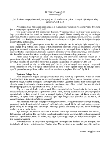 Wznieś swój głos Jim Hohnberger „Idź do domu swego, do swoich, i oznajmij im, jak wielkie rzeczy Pan ci uczynił i jak się nad tobą zmiłował”. Mk 5,19 Prawdopodobnie najbardziej zniewalającą z ewangelicznych historii w całym Piśmie Świętym jest ta o opętanym zapisana w Mk 5,1–20. Ten biedny człowiek był pozbawiony kontroli. W rzeczywistości to demony nim kierowały. Jego przyjaciele i rodzina starali się bezskutecznie go oswoić. Nawet łańcuchy nie były w stanie go zatrzymać. Uciekł ze społeczeństwa i lokalny cmentarz uczynił swoim legowiskiem. Krzyczał szalenie przez dzień i noc. Pociął się kamieniami. Mogę sobie tylko wyobrazić, jaki rodzaj życia i jakie decyzje doprowadziły go tak nisko. Jego społeczność spisała go na straty. Był tak niebezpieczny, że najlepiej było trzymać się z dala od jego dróg. Jednak Jezus widział w tym obłąkanym człowieku wielkiego misjonarza. Odczytał pragnienie wolności z jego serca. Usłyszał płacz o pomoc z mrożących krew w żyłach krzyków i odpowiedział ze współczuciem. Rozkazał legionowi demonów wyjść z tego człowieka, a one usłuchały Go. Temu biednemu człowiekowi został przywrócony rozum i dano mu drugą szanse na życie. Kiedy Jezus wstępował do łodzi, aby odpłynąć, ten odnowiony człowiek błagał go o pozwolenie, aby mógł z nim pójść. Jednak Jezus miał dla niego inny plan. „Idź do domu swego, do swoich, i oznajmij im, jak wielkie rzeczy Pan ci uczynił i jak się nad tobą zmiłował”. Mk 5,19 Jezus powołał go, aby „podniósł swój głos”. Idź do tych, na których masz wpływ i rozgłaszaj dobrą wiadomość o tym, co Bóg dla ciebie uczynił, co czyni w tobie i przez ciebie. To jest Jego boski sposób głoszenia ewangelii wszystkim „narodom, plemionom, językom, i ludom”. Ap 14,6 Tęsknota Bożego Serca Jezus desperacko pragnie dosięgnąć wszystkich tych, którzy są w potrzebie. Widzi tak wiele Swoich dzieci, które gorzko trudzą się w swoich pustych życiach. Zadręczane są demonami poprzez fałszywe religie, okrutne ideologie i skorumpowane systemy. Ogromna liczba z tych dzieci nigdy nie słyszała nawet Jego imienia – bardzo mało miało możliwość, aby z Nim chodzić. Inni zostali zalani fałszywą propagandą na Jego temat i nie biorą Go poważnie. Bóg chce, aby wiedzieli, że nie są sami. Chce, aby wiedzieli, że On może dać im ducha mocy i miłości i słyszy ich, tam gdzie są i potrzebuje ciebie i mnie, abyśmy podnieśli nasze głosy i po prostu opowiedzieli, co Bóg uczynił i czyni w naszych życiach. Podziel się tym, jak Boża prawda cię oświeciła, jak życie Jezusa napełniło cię mocą i jak Jego Święty Duch prowadzi cię. To jest to, co uczynił opętany – i nikt nie mógł tego przecenić. Nikt nie może podważyć twojego osobistego świadectwa. Mogą kwestionować twoje doktryny, pogardzać twoją denominacją lub odrzucać twój styl życia. Jednak kiedy byłeś zniewolony, a teraz jesteś wolny, to nie mogą temu zaprzeczyć. Nie mogą pomóc, ale muszą przyznać, że coś wielkiego wydarzyło się w twoim życiu. Być może jest to pierwsze spotkanie z Jezusem. Może być to twoje małżeństwo lub rodzina, która zostaje uzdrowiona. Dla innych jest to odkrycie praktycznego poselstwa, które w końcu przynosi rezultaty. Czymkolwiek jest to dla ciebie, użyj tego, opowiadając innym, na których masz wpływ. To jest zlecenie ewangelii. Próba radowania się korzyściami wynikającymi z ewangelii bez dzielenia się tym z innymi, aby to dotknęło ich życia – jest niemożliwe. Tak jak Może Martwe staniesz się zastały i słony. Nie możesz Wznieś swój głos – 1/3 być świeżym, słodkim źródłem bez pozwolenia, aby błogosławieństwo wypływało z ciebie dalej. Musisz tym żyć i dawać to. Zaakceptuj i dziel się tym. Zastosuj i głoś to. Twój Głos Jest Istotny Kiedy nowo odkryta prawda w Piśmie Świętym dotknęła mnie, zacząłem dzielić się nią z moimi rodzicami, rodzeństwem, przyjaciółmi i sąsiadami. To było 33 lata temu i nadal wznoszę swój głos. Bóg pokierował mną do napisania 8 książek, z których część przetłumaczona została na ponad 20 języków. Twój głos również powinien się roznosić. Bóg desperacko cię potrzebuje, abyś był świadkiem Jego wielkiej mocy w przemienianiu twojego życia. Poważnie, czy Bóg przemawia teraz do twojego serca i umysłu? Czy prosi On, abyś „począł opowiadać w Dziesięciogrodziu, jak wielkie rzeczy uczynił ci Jezus”? Mk 5,20 Usłuchaj więc wezwania i zostań Jego misjonarzem. Dziel się zza pulpitu, udzielaj lekcji biblijnych, pomóż potrzebującym, rozprowadzaj książki, wysyłaj płyty DVD, zaproś kogoś do kościoła lub na wykład. Zainwestuj siebie dla innych, tak jak Jezus zainwestował samego Siebie w ciebie. Jest to zasada ewangelii. Rozciąga się to poza uczestnictwem w kościele i identyfikowanie się z poselstwem. Jest to wezwanie do przyjęcia brzemienia w dzieleniu się dla dusz. To samo brzemię niósł Jezus dla ciebie, abyś i ty zamanifestował to w twoim kręgu, na który masz wpływ. Co by się stało, gdyby mój dentysta nie podzielił się ze mną? Co by było, gdyby interesowało go tylko wiercenie moich zębów, a nie otworzenie mi oczu? Jestem wdzięczny, że zatroszczył się o moje „potrzeby dentystyczne”. Jednak jeszcze bardziej jestem wdzięczny, że zatroszczył się moją duchową pustką. Podjął ryzyko obrażenia mnie. Chwała Bogu, że troszczył się wystarczająco dużo, aby podjąć ryzyko, aby wyratować moją duszę z bezowocnych poszukiwań. Co by było, gdyby tego nie zrobił? Jakaż strata by to była! Teraz ty musisz podjąć ryzyko dzielenia się twoją wiarą, aby „Jimowie Hohnbergerowie”, na których masz wpływ, mogli zostać wyratowani, aby mogli wznosić swoje głosy. Co teraz Bóg mówi do ciebie? Jeżeli coś znalazłeś, czy przekazujesz to dalej