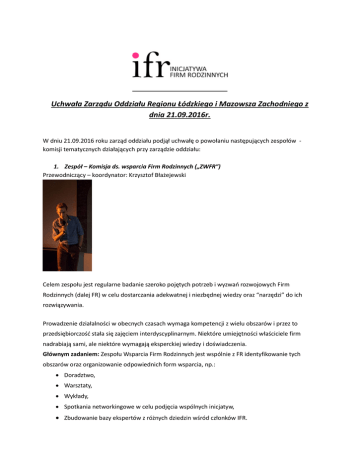Uchwała Zarządu Oddziału Regionu Łódzkiego i Mazowsza Zachodniego z dnia 21.09.2016r. W dniu 21.09.2016 roku zarząd oddziału podjął uchwałę o powołaniu następujących zespołów komisji tematycznych działających przy zarządzie oddziału: 1. Zespół – Komisja ds. wsparcia Firm Rodzinnych („ZWFR”) Przewodniczący – koordynator: Krzysztof Błażejewski Celem zespołu jest regularne badanie szeroko pojętych potrzeb i wyzwań rozwojowych Firm Rodzinnych (dalej FR) w celu dostarczania adekwatnej i niezbędnej wiedzy oraz “narzędzi” do ich rozwiązywania. Prowadzenie działalności w obecnych czasach wymaga kompetencji z wielu obszarów i przez to przedsiębiorczość stała się zajęciem interdyscyplinarnym. Niektóre umiejętności właściciele firm nadrabiają sami, ale niektóre wymagają eksperckiej wiedzy i doświadczenia. Głównym zadaniem: Zespołu Wsparcia Firm Rodzinnych jest wspólnie z FR identyfikowanie tych obszarów oraz organizowanie odpowiednich form wsparcia, np.: Doradztwo, Warsztaty, Wykłady, Spotkania networkingowe w celu podjęcia wspólnych inicjatyw, Zbudowanie bazy ekspertów z różnych dziedzin wśród członków IFR. Zakładamy podejmowanie różnorodnych tematów z zakresu prowadzenia przedsiębiorstwa, chociaż istotne miejsce będą zajmowały tematy specyficzne dla prowadzenia FR. Przykładowe tematy mogą dotyczyć: -Dialogu międzypokoleniowego, -Przygotowania i wsparcia procesu sukcesji, -Przygotowanie kompetencyjne nestorów i sukcesorów, -Łączenia systemu rodzinnego i biznesowego, -Psychologii FR, -Zarządzanie zasobami ludzkim, -Zagadnienia prawno-finansowe, -Integrowanie środowiska lokalnego i wspólne inicjatywy, -Zagadnienia z zakresu zarządzania, - wiele innych zależnych od bieżących potrzeb naszych członków... Zależy nam na znalezieniu odpowiedzi na rzeczywiste potrzeby FR dlatego w pierwszym okresie działalności chcemy skupić się na kontakcie z przedsiębiorcami rodzinnymi w celu podjęcia dialogu na temat potrzeb i oczekiwań w stosunku do ZWFR Działania przygotowawcze: Pierwsze 2 m-c zebranie członków i zawiązanie współpracy wewnątrz zespołu(orientacyjnie do połowy listopada 2016) Od połowy listopada ok. 2 m-cy przygotowanie przez zespół strategii badania potrzeb wśród FR. Przewidujemy “żywe” metody jak na przykład spotkania networkingowe w małych grupach oraz wirtualne np. Ankiety. Na podstawie przeprowadzonego badania potrzeb powstanie docelowa strategia działania ZWFR Przewodniczący koordynator Pan Krzysztof Błażejewski: Członek firmy rodzinnej, wraz z bratem Piotrem tworzy Laboratorium Dialogu, psycholog, trener, coach, psychoterapeuta- osoba wspierająca rozwój. W swojej pracy specjalizuje się w budowaniu atmosfery dialogu oraz relacji opartych na zrozumieniu i szacunku, co w rezultacie przyczynia się do zwiększenia skuteczności w działaniu biznesowym. Ekspert w zakresie: komunikacji, przywództwa partycypacyjnego, emocji, pasjonat zarządzania humanistycznego. Współpracuje z biznesem jako doradca i trener oraz prowadzi warsztaty otwarte. 2. Zespół – Komisja ds. kontaktów międzynarodowych. Przewodnicząca – koordynator: Ewa Kubel Celem działań zespołu jest umożliwienie członkom oddziału włączanie się w programy współpracy międzynarodowej SBICO, tj.: wyjazdy na wizyty studyjne do firm na terenie Unii Europejskiej uczestniczenie w międzynarodowych konferencjach i spotkaniach dotyczących sektora MŚP wyjazdy na krótkie pobytu w firmach zagranicą – tzw. „job shadowing” (obserwacje pracy) przyjmowanie na praktyki uczniów ze szkół zawodowych z zagranicy, aby rozwijać w nich kompetencje przedsiębiorczości branżowe wizyty handlowe u potencjalnych partnerów biznesowych Przewodnicząca koordynator komisji Pani Ewa Kubel: Dyrektor SBICO (Small Business Cooporation Office (www.sbico.eu ) w Warszawie oraz Dyrektor European Small Business Alliance w Brukseli posiada 15-letnie doświadczenie w zarządzaniu własną firmą Meritum, jako Prezes Business Development Manager. Członek Zarządu Fundacji AD Meritum, odpowiedzialna za międzynarodowe i krajowe projekty edukacyjne. Członek IFR, w latach 2014-2015 sekretarz generalny IFR. 3. Zespół – Komisja ds. źródeł finansowania IHR Przewodniczący – koordynator: Dariusz Ciecierski Celem zespołu jest: • dostarczanie firmom rodzinnym praktycznej wiedzy w zakresie nowoczesnych źródeł finansowania • zwiększanie świadomości dotyczącej możliwych do wykorzystania źródeł finansowania rozwoju firm rodzinnych • prelekcje i szkolenia dotyczące alternatywnych źródeł finansowania • pomoc i doradztwo przy restrukturyzacji źródeł finansowania • współpraca z uczelniami B. HR • dostarczenie firmom rodzinnym informacji w zakresie dostępnych i poszukiwanych zasobach personalnych • stworzenie bazy wymiany danych o wolnych wakatach w FR: • informacja o poszukiwanych osobach • informacja o polecanych osobach, które poszukują pracy Przewodniczący koordynator komisji Pan Dariusz Ciecierski: Doświadczony Manager Finansowy posiadający praktyczne doświadczenie w finansach, analizie finansowej, budżetowaniu, rachunkowości zarządczej i prognozowaniu. Doświadczenie zawodowe w zakresie doradztwa w zarządzaniu - projekty dla małych i średnich przedsiębiorstw. Zrealizowane transakcje w zakresie fuzji i przejęć, integracji po fuzji i planowaniu strategicznym. Wdrożone projekty w zakresie analizy kosztów i planowania przepływu gotówki i zorientowane na wynik systemy sprawozdawczości. Przygotowanie planów naprawczych dla zakładów produkcyjnych, poprawa rentowności, restrukturyzacja źródeł kapitału i optymalizacja zadłużenia. Pozyskiwanie źródeł finansowania firmy: IPO, pre IPO, fundusze unijne. Doświadczenie we współpracy z inwestorami i funduszami VC. Autor artykułów i publikacji naukowych: • „New Connect jako źródło finansowania MŚP