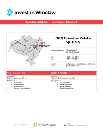 Suppliers database / Lieferantendatenbank GKN Driveline Polska Sp. z o.o. WROCŁAW Address/Adresse Południowa 18 56-400, Oleśnica tel: fax: +48 71 399 80 00 +48 71 399 81 17 e-mail: www: [email protected] gkndriveline.com Sector: Automotive Sektor: Automobil Segment: Engine, gears and drives Bereich: Motoren, Getriebe und Antriebe Products: ▪ Axel gears ▪ Drive systems ▪ Drive shafts ▪ Constant velocity joints Erzeugnisse: ▪ Achsgetriebe ▪ Antriebssysteme ▪ Antriebswellen ▪ Gleichlaufgelenke