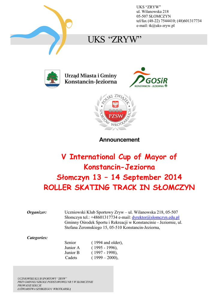 UKS “ZRYW” ul. Wilanowska 218 05-507 SŁOMCZYN tel/fax (48-22) 7544410; (48)601317734 e-mail: [email protected] UKS “ZRYW” Announcement V International Cup of Mayor of Konstancin-Jeziorna Słomczyn 13 – 14 September 2014 ROLLER SKATING TRACK IN SŁOMCZYN Organizer: Uczniowski Klub Sportowy Zryw – ul. Wilanowska 218, 05-507 Słomczyn tel.: +48601317734 e-mail: [email protected] Gminny Ośrodek Sportu i Rekreacji w Konstancinie - Jeziornie, ul. Stefana Żeromskiego 15, 05-510 Konstancin-Jeziorna, Categories: Senior Junior A Junior B Cadets ( 1994 and older), ( 1995 - 1996), ( 1997 - 1998), ( 1999 – 2000), UCZNIOWSKI KLUB SPORTOWY “ZRYW” PRZY GMINNEJ SZKOLE PODSTAWOWEJ NR 5 W SŁOMCZYNIE PROWADZI SEKCJE ŁYŻWIARSTWA SZYBKIEGO I WROTKARSKĄ Page 2 Junior C Junior D Junior E Junior F Senior AK 30 Senior AK 40 Senior AK 50 Entries: ( 2001 - 2002), ( 2003 - 2004), ( 2005 - 2006), ( 2007 – and younger), (1984 - 1975) (1974 -1965) (1964 - and older) Preliminary Entry – number of competitors and the categories must be sent not later than 9.09.2014 If you would like to book a hotel room, please send your entry as soon as possible. Final Entry- must be sent not later than 10.09. 2014. Mailing address: UKS Zryw ul. Wilanowska 218, 05-507 Słomczyn Poland e-mail: [email protected] tel.: +48601317734 fax: +48 22 754 44 10 Entries must include: first and last name, date of birth, age category, name of the club as well as name, surname and contact to the team leader. Determined date of category division is 31.12. of regular calendar year. Entry Fee: Category from Junior F – Senior €10 (40 PLN) per skater. Accommodation: Camping within the school’s premises and along the line track is free. It is also possible to order meals at the track: breakfast 4€ (16zł.), lunch 6€ (24zł.) diner 5€ (20zł.). Orders are taken before: 10.09.2014 e-mail: [email protected] CENTRUM KONFERENCYJNO APARTAMENTOWE „MRÓWKA” ul. Przekorna 33 02- 971 Warszawa tel. 22/ 894 64 15 fax. 22/ 894 64 14 [email protected] http://www.cka-mrowka.pl HOTEL BOROWINA (***) ul. Gruntowa 4, Borowina 05-520 Konstancin - Jeziorna Tel: (+48 22) 201 19 99 Fax: (+48 22) 201 19 88 Recepcja hotelu Page 3 [email protected] http://www.borowina.com.pl DWÓR KONSTANCIN *** ul. Od Lasu 23 05-510 Konstancin- Jeziorna tel. + 48 22 754 72 72 tel. kom. +48 500 702 033 http://www.dworkonstancin.pl mailto:[email protected] HOTEL KONSTANCJA ul. Źródlana 6/8 05-510 Konstancin-Jeziorna tel.: +48 (22) 754 11 55; +48 (22) 754 11 66; fax: +48 (22) 756 43 67 mailto:[email protected] http://www.konstancja.net.pl We offer our help with booking the accommodation. Place: In line parabolic roller speed skating track: Perimeter: 166m.; radius of curves 19,0m, elevation the outer curve edge 80cm. Wilanowska Street 218, 05-507 Słomczyn, Zespół Szkół nr 4 w Słomczynie. Program: Saturday 13.09.2014 warm-up 9.00 - 10.30 Opening Ceremony: 10.45 Start of competition – 11.00 Sunday 14.09.2014 warm-up 8.00 - 9.00 Start of competition – 9.30 Awards Ceremony: 16.30 Rules: V International Cup of Mayor of Konstancin-Jeziorna Competition will be held according to the FIRS International Rules and according to the announcement of this competition. Classification: Each skater will receive points according to their finish place in a races. Competitor with the lowest number of total points wins. In case of a tie, the winner of the longest distance will be placed higher. Protests: Protests can be made not later than 15 minutes after the official announcement of the referee. Protest fee is 100 EUR and can be submitted to main referee. In case of dismissal of protest this fee will not be returned. Page 4 Start numbers: All participants must wear start numbers (on left and right leg and back) Skaters without start numbers will not be allowed to compete. The rental fee for a start number is 20 EUR( 80zł.). This fee will be returned after the competition. Distances: Program V International Cup of Mayor of Konstancin-Jeziorna Category I day II day senior ladies 500m, 10000m. ELIMINATION 1000m, 5000 POINT senior men 500m, 15000m. ELIMINATION 1000m, 10000 POINT junior A girls 500m, 10000m. ELIMINATION 1000m, 5000 POINT junior A boys 500m, 15000m. ELIMINATION 1000m, 10000 POINT Junior B girls 500m, 5000m. ELIMINATION 1000m, 5 000 POINT Junior B boys 500m, 5000m. ELIMINATION 1000m, 5 000 POINT Cadets girls 500m, 5000m. ELIMINATION 1000m, 3 000 POINT Cadets boys 500m, 5000m. ELIMINATION 1000m, 3 000 POINT Junior C girls 500m, 3000m. ELIMINATION 1000m, 1 500 POINT Junior C boys 500m, 3000m. ELIMINATION 1000m, 1 500 POINT Junior D girls 500m, 1500 300m, 1000m Junior D Boys 500m, 1500 300m, 1000m Junior E girls 500m, 1000m 300m Junior E Boys 500m, 1000m 300m Junior F girls 166m, 332m 300m junior F boys 166m, 332m 300m Senior AK 1000m, 1500m 2000m *In case of a small number of participants a distance might be shortened or extremely changed into a distance for shared start. Decision on possible shortening of distances is made by the main referee. Relay race will take place Saturday in following categories: Senior and junior A B, C cadets - 3 000m Junior D Tomasz Kucza PRESIDENT OF THE UKS ZRYW +48 601 317734 - 1500m Page 5 SPONSORS MEDIA SPONSORSHIP