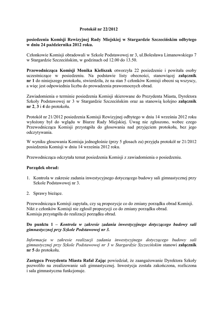 Protokół nr 22/2012 posiedzenia Komisji Rewizyjnej Rady Miejskiej w Stargardzie Szczecińskim odbytego w dniu 24 października 2012 roku. Członkowie Komisji obradowali w Szkole Podstawowej nr 3, ul.Bolesława Limanowskiego 7 w Stargardzie Szczecińskim, w godzinach od 12.00 do 13.50. Przewodnicząca Komisji Monika Kieliszak otworzyła 22 posiedzenie i powitała osoby uczestniczące w posiedzeniu. Na podstawie listy obecności, stanowiącej załącznik nr 1 do niniejszego protokołu, stwierdziła, że na stan 5 członków Komisji obecni są wszyscy, a więc jest odpowiednia liczba do prowadzenia prawomocnych obrad. Zawiadomienia o terminie posiedzenia Komisji skierowane do Prezydenta Miasta, Dyrektora Szkoły Podstawowej nr 3 w Stargardzie Szczecińskim oraz aa stanowią kolejno załącznik nr 2, 3 i 4 do protokołu. Protokół nr 21/2012 posiedzenia Komisji Rewizyjnej odbytego w dniu 14 września 2012 roku wyłożony był do wglądu w Biurze Rady Miejskiej. Uwag nie zgłoszono, wobec czego Przewodnicząca Komisji przystąpiła do głosowania nad przyjęciem protokołu, bez jego odczytywania. W wyniku głosowania Komisja jednogłośnie (przy 5 głosach za) przyjęła protokół nr 21/2012 posiedzenia Komisji w dniu 14 września 2012 roku. Przewodnicząca odczytała temat posiedzenia Komisji z zawiadomienia o posiedzeniu. Porządek obrad: 1. Kontrola w zakresie zadania inwestycyjnego dotyczącego budowy sali gimnastycznej przy Szkole Podstawowej nr 3. 2. Sprawy bieżące. Przewodnicząca Komisji zapytała, czy są propozycje co do zmiany porządku obrad Komisji. Nikt z członków Komisji nie zgłosił propozycji co do zmiany porządku obrad. Komisja przystąpiła do realizacji porządku obrad. Do punktu 1 – Kontrola w zakresie zadania inwestycyjnego dotyczącego budowy sali gimnastycznej przy Szkole Podstawowej nr 3. Informacja w zakresie realizacji zadania inwestycyjnego dotyczącego budowy sali gimnastycznej przy Szkole Podstawowej nr 3 w Stargardzie Szczecińskim stanowi załącznik nr 5 do protokołu. Zastępca Prezydenta Miasta Rafał Zając powiedział, że zaangażowanie Dyrektora Szkoły pozwoliło na zrealizowanie sali gimnastycznej. Inwestycja została zakończona, rozliczona i sala gimnastyczna funkcjonuje. Dyrektor Szkoły Podstawowej nr 3 w Stargardzie Szczecińskim Romuald Bobrowicz powiedział, że 10 lat zabiegał o realizację sali gimnastycznej. Na wyposażenie sali gimnastycznej szkoła otrzymała środki zewnętrzne w wys. 60 tys. zł z Ministerstwa Edukacji. Wykonawca zmieścił się w budżecie przeznaczonym na realizację sali gimnastycznej. Dyrektor podkreślił, że bardzo dobrze układa się współpraca z Miastem. Przewodnicząca Komisji Monika Kieliszak zapytała o termin zakończenia inwestycji, czy został on zachowany. Zastępca Inżyniera Miasta Jakub Majerski powiedział, że termin został zachowany. Radny Bartosz Rudnicki po obejrzeniu dokumentacji dotyczącej budowy sali gimnastycznej, powiedział, że jest ona prawidłowa, terminy również. Dokumentacja jest wzorcowa, prawidłowo poukładana. W wyniku przeprowadzonej kontroli Komisja jednogłośnie (przy 5 głosach za) nie stwierdziła żadnych nieprawidłowości w zakresie zadania inwestycyjnego dotyczącego budowy sali gimnastycznej przy Szkole Podstawowej nr 3. Członkowie Komisji Rewizyjnej przyjęli i podpisali Protokół kontroli z przeprowadzonej kontroli w dniu 24 października 2012 roku w Szkole Podstawowej nr 3 w Stargardzie Szczecińskim odnośnie kontroli w zakresie zadania inwestycyjnego dotyczącego budowy sali gimnastycznej przy Szkole Podstawowej nr 3. Pismo wraz z Protokołem kontroli skierowane do Dyrektora Szkoły Podstawowej nr 3 w Stargardzie Szczecińskim; Prezydenta Miasta Stargard Szczeciński; Komisji Oświaty, Kultury i Sportu Rady Miejskiej; Rady Miejskiej w Stargardzie Szczecińskim przekazujące sprawozdanie z przeprowadzonej kontroli stanowi załącznik nr 6 do protokołu. Do punktu 2 – Sprawy bieżące. Komisja przyjęła do wiadomości odpowiedź Prezydenta Miasta Stargard Szczeciński, na wniosek Komisji podjęty na posiedzeniu w dniu 14 września 2012 roku, w sprawie przeprowadzenia konsultacji społecznych odnośnie opłaty za gospodarowanie odpadami komunalnymi, stanowiąca załącznik nr 7 do protokołu. Przewodnicząca Komisji Monika Kieliszak podziękowała Prezydentowi za udzieloną odpowiedź, że jest ona więcej niż zadawalająca. Radny Bartosz Rudnicki zapytał, czy opłatę za dodatkowe zajęcia w przedszkolu można byłoby uiszczać drogą elektroniczną. Zastępca Prezydenta Miasta Rafał Zając powiedział, że temat ten był już poruszany. Zostanie ta sprawa ponownie przeanalizowana. Radny Bartosz Rudnicki zapytał, czy jest możliwe wykupienie kawałka pasa drogowego na ulicy Rzemieślniczej w celu przesunięcia płotu. Zastępca Prezydenta Miasta Andrzej Korzeb powiedział, że nie, ponieważ byłoby to niezgodne z prawem. 2 Radny Bartosz Rudnicki powiedział, że w Polsce funkcjonuje budżet obywatelski i można byłoby go wprowadzić w naszym mieście w roku 2014. Ideą budżetu obywatelskiego jest określenie pewnej puli pieniędzy w budżecie miasta w danym roku, która sfinansuje przedsięwzięcia zgłoszone przez mieszkańców. Na spotkaniach z mieszkańcami odbywałyby się rozmowy nt. propozycji wydatków z budżetu i innych ważnych dla społeczności lokalnej sprawach. W ramach budżetu obywatelskiego mieszkańcy mogą wybierać najlepsze projekty, zgłaszać ich propozycje. Mieszkańcy zostaliby wprowadzeni w aktywną działalność samorządową. Słuszną rzeczą jest wyjście do ludzi. Radny powiedział, że do tego tematu będzie wracał i poprosił Panów Prezydentów o przemyślenie tej sprawy. Można wystąpić do mieszkańców, czy tego chcą, jeżeli nie będzie odzewu, to nie zostanie budżet obywatelski wprowadzony. Radny przekazał Zastępcom Prezydenta Miasta materiały dotyczące budżetu obywatelskiego Miasta Sopotu. 