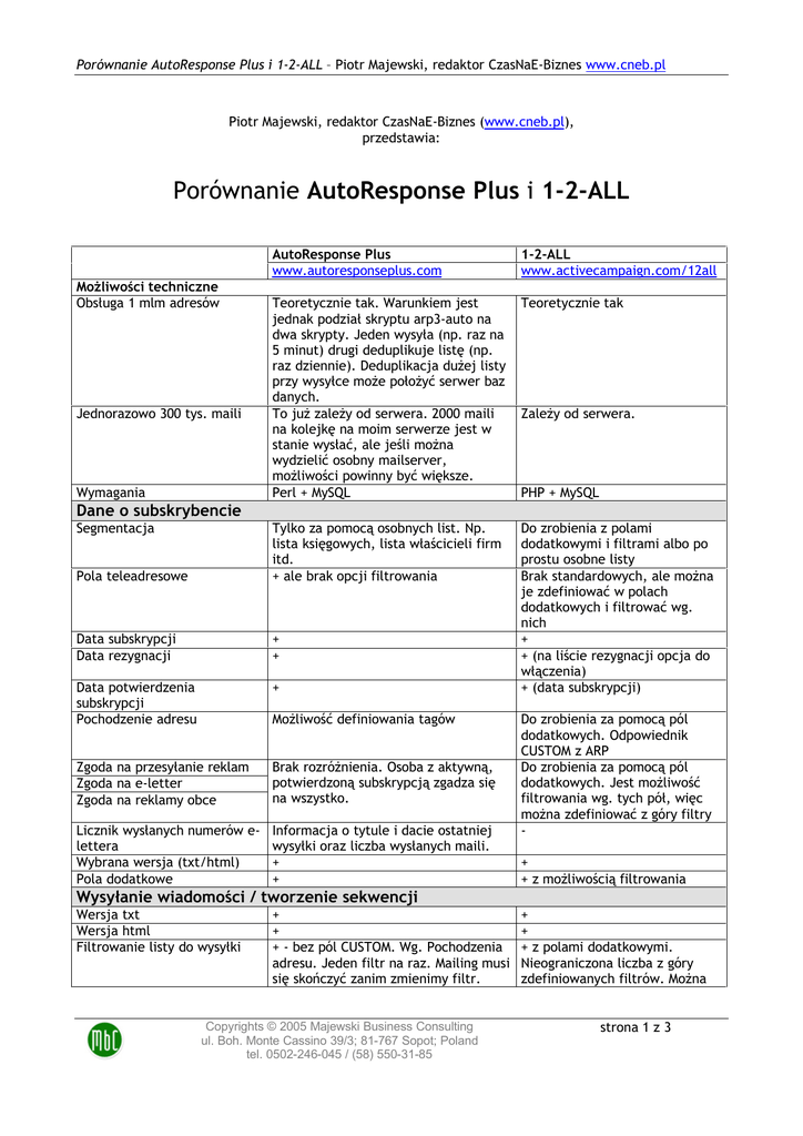 Porównanie AutoResponse Plus i 1-2-ALL – Piotr Majewski, redaktor CzasNaE-Biznes www.cneb.pl Piotr Majewski, redaktor CzasNaE-Biznes (www.cneb.pl), przedstawia: Porównanie AutoResponse Plus i 1-2-ALL AutoResponse Plus www.autoresponseplus.com 1-2-ALL www.activecampaign.com/12all Teoretycznie tak. Warunkiem jest jednak podział skryptu arp3-auto na dwa skrypty. Jeden wysyła (np. raz na 5 minut) drugi deduplikuje listę (np. raz dziennie). Deduplikacja dużej listy przy wysyłce może położyć serwer baz danych. To już zależy od serwera. 2000 maili na kolejkę na moim serwerze jest w stanie wysłać, ale jeśli można wydzielić osobny mailserver, możliwości powinny być większe. Perl + MySQL Teoretycznie tak Pola teleadresowe Tylko za pomocą osobnych list. Np. lista księgowych, lista właścicieli firm itd. + ale brak opcji filtrowania Data subskrypcji Data rezygnacji + + Data potwierdzenia subskrypcji Pochodzenie adresu + Do zrobienia z polami dodatkowymi i filtrami albo po prostu osobne listy Brak standardowych, ale można je zdefiniować w polach dodatkowych i filtrować wg. nich + + (na liście rezygnacji opcja do włączenia) + (data subskrypcji) Zgoda na przesyłanie reklam Zgoda na e-letter Zgoda na reklamy obce Brak rozróżnienia. Osoba z aktywną, potwierdzoną subskrypcją zgadza się na wszystko. Możliwości techniczne Obsługa 1 mlm adresów Jednorazowo 300 tys. maili Wymagania Zależy od serwera. PHP + MySQL Dane o subskrybencie Segmentacja Możliwość definiowania tagów Licznik wysłanych numerów e- Informacja o tytule i dacie ostatniej lettera wysyłki oraz liczba wysłanych maili. Wybrana wersja (txt/html) + Pola dodatkowe + Do zrobienia za pomocą pól dodatkowych. Odpowiednik CUSTOM z ARP Do zrobienia za pomocą pól dodatkowych. Jest możliwość filtrowania wg. tych pół, więc można zdefiniować z góry filtry + + z możliwością filtrowania Wysyłanie wiadomości / tworzenie sekwencji Wersja txt Wersja html Filtrowanie listy do wysyłki + + + - bez pól CUSTOM. Wg. Pochodzenia adresu. Jeden filtr na raz. Mailing musi się skończyć zanim zmienimy filtr. Copyrights © 2005 Majewski Business Consulting ul. Boh. Monte Cassino 39/3; 81-767 Sopot; Poland tel. 0502-246-045 / (58) 550-31-85 + + + z polami dodatkowymi. Nieograniczona liczba z góry zdefiniowanych filtrów. Można strona 1 z 3 Porównanie AutoResponse Plus i 1-2-ALL – Piotr Majewski, redaktor CzasNaE-Biznes www.cneb.pl Szablony wiadomości Edytor WYSWIG Programowanie terminu wysyłki Programowanie sekwencji listów Personalizacja definiować kilka mailingów na różne filtry. Stopka i nagłówek przypisane do danej + - rozbudowane listy. W przypadku sekwencji, można wybrać stopkę i nagłówek z danej listy oraz dodać zdefiniowane wcześniej elementy typu informacja o polityce prywatności. W przypadku wysyłki jednorazowej, można wybrać dowolny nagłówek i stopkę. + + - data lub najbliższy dany dzień + data, godzina tygodnia + - opcja natychmiast oraz możliwość + - opcja natychmiast oraz ustawienia odstępu w DNIACH licząc od możliwość ustawienia odstępu w ostatniej wiadomości GODZINACH licząc od daty zapisania się na listę. + - podstawowe dane, dane systemowe + - podstawowe dane oraz (data itd.) oraz dowolne dane typu dowolna liczsba danych CUSTOM opcjonalnych Dodatki Archiwum e-letterów Możliwość blokowania odbijanych maili + - pod warunkiem nie czyszczenia kolejki + - tylko csv + - tylko csv Kolejka. W danym momencie może być wysyłany mailing tylko do jednej grupy. + + Obsługa maili odbitych. Liczba odbitych maili w danych prenumeratora. X odbitych maili = zmiana statusu na Failed Czas wysyłki Liczba sesji i sumaryczny czas sesji ? + Obsługa maili odbitych. Liczba odbitych maili w danych prenumeratora. X odbitych maili – usunięcie adresu z listy. Wcześniej flaga na adresie. Kolejka + + + - + - liczba zależna od licencji + + + + - + + + - możliwość filtrowania + - możliwość filtrowania + + + Tylko ilość wysłanych + + Import Eksport Log Wznawianie po awarii Autoryzacja (double opt-in) Raportowanie maili odbitych + publiczne + - tylko csv + - tylko csv Kolejka. Administracja Administracja z poziomu WWW Wielu użytkowników Użytkownik Admin Użytkownicy z ograniczeniami Śledzenie Nadawanie kodów marketingowych Filtrowanie wg. Kodów marketingowych Wstawianie kodów do listów Kto otworzył co Kto kliknął co Statystyki Ilość dostarczonych maili Ilość otwartych maili Copyrights © 2005 Majewski Business Consulting ul. Boh. Monte Cassino 39/3; 81-767 Sopot; Poland tel. 0502-246-045 / (58) 550-31-85 strona 2 z 3 Porównanie AutoResponse Plus i 1-2-ALL – Piotr Majewski, redaktor CzasNaE-Biznes www.cneb.pl Ilość zwrotów Ilość kliknięć w linki z podziałem na kody Ilość zamówień Graficzne statystyki – np. rejestracji + ale bez podziałów na kody. możliwość filtrowania wg. kliknięć. Ręczne definiowanie. - Copyrights © 2005 Majewski Business Consulting ul. Boh. Monte Cassino 39/3; 81-767 Sopot; Poland tel. 0502-246-045 / (58) 550-31-85 + - bez przyczyny + - automatyczne śledzenie. Filtrowanie wg. Kliknięć i informacja, kto kliknął + strona 3 z 3