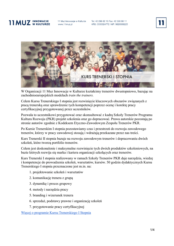 W Organizacji 11 Muz Innowacje w Kulturze kształcimy trenerów dwustopniowo, bazując na zachodnioeuropejskich modelach train the trainers. Celem Kursu Trenerskiego I stopnia jest rozwinięcie kluczowych obszarów związanych z pracą trenerską oraz sprawdzenie tych kompetencji poprzez ocenę i korektę pracy certyfikacyjnej przygotowanej przez uczestników. Pozwala to uczestnikowi przygotować oraz skonsultować z kadrą Szkoły Trenerów Programu Kultura Rozwoju (PKR) projekt szkolenia oraz go dopracować. Prawa autorskie pozostają po stronie autorów zgodnie z Kodeksem Etyczno-Zawodowym Zespołu Trenerów PKR. Po Kursie Trenerskim I stopnia pozostawiamy czas i przestrzeń do rozwoju zawodowego trenerów, którzy w pracy zawodowej stosują i wdrażają przekazane przez nas treści. Kurs Trenerski II stopnia bazuje na rozwoju zawodowym trenerów i dopracowaniu dwóch szkoleń, które tworzą portfolio trenerów. Celem jest doskonalenie i maksymalne rozwinięcie tych dwóch produktów szkoleniowych, na bazie których rozwija się marka i kariera organizacji szkolących oraz trenerów. Kurs Trenerski I stopnia realizowany w ramach Szkoły Trenerów PKR daje narzędzia, wiedzę i kompetencje do prowadzenia szkoleń, warsztatów, kursów. 50 godzin dydaktycznych Kursu Trenerskiego I stopnia przeznaczone jest m.in. na: 1. projektowanie szkoleń i warsztatów 2. komunikację trenera z grupą 3. dynamikę i proces grupowy 4. metody i narzędzia pracy 5. branding i wizerunek trenera 6. sprzedaż, podstawy prawne i organizację szkoleń 7. przygotowanie pracy certyfikacyjnej Więcej o programie Kursu Trenerskiego I Stopnia 1/4 W trakcie Kursu Trenerskiego trenerzy koncentrują się przede wszystkim na praktycznych aspektach. Wychodzimy z założenia, że teorię każdy jest w stanie sam przyswoić (wskażemy obszary rozwojowe, dysponujemy spisem aktualnej literatury na tematy związane z pracą i rozwojem trenera). Uczymy przy pomocy m.in.: ćwiczeń grupowych i indywidualnych, odgrywania ról, elementów improwizacji, dyskusji, naprowadzania, stymulacji pytań, metaplanu, analizy krytycznej i wykładów. Korzyści oraz wymierne rezultaty dla uczestników są dla nas kluczowe. Program Kursu Trenerskiego I stopnia oparty jest o standardy kwalifikacji zawodowych dla zawodu trenera wg Ministerstwa Pracy i Polityki Społecznej. Programowo Kurs Trenerski I i II stopnia realizowany jest na 5 poziomie European Qualifications Framework (EQF LLL), który jest potwierdzeniem wiedzy, umiejętności oraz kompetencji trenerskich. Absolwenci mogą również otrzymać certyfikat w języku angielskim. Zasoby, na bazie których rozwijamy Szkołę Trenerów PKR to: specjalistyczna wiedza, doświadczenie i umiejętności trenerów prowadzących kursy, wskazówki oraz oczekiwania ponad 250 absolwentów, doświadczenia i przemyślenia 17 osobowego Zespołu Trenerów. Myślimy open-source’owo – DZIELIMY SIĘ doświadczeniami i szczegółowymi rozwiązaniami poznanymi w czasie pracy zawodowej. Jesteśmy otwarci na konsultacje i wsparcie wartościowych pomysłów naszymi zasobami. Dla nas absolwenci są partnerami. Oceniając nasza pracę robimy to przez pryzmat ich sukcesów. Rozwój zawodowy naszych kursantów po zakończeniu Kursu, wysoka jakość ich działań oraz koncentrowane na potrzebach uczestników podejście do pracy trenerskiej stanowią o sukcesie Szkoły Trenerów PKR. Zespół Trenerów PKR i Kodeks Etyczny Zespołu Trenerów PKR. W Organizacji wychodzimy z założenia, że oceny naszych uczestników, ich opinie i wskazówki są jednym z najważniejszych elementów wpływających długoterminowo na jakość i rezultaty naszej pracy. Dotychczas w Kursach realizowanych w ramach Szkoły Trenerów PKR wzięło udział ponad 250 osób reprezentujących wszystkie cztery sektory: organizacje pozarządowe, biznes, sektor publiczny i akademicki. Wielokrotnie to konkretna instytucja, NGOs lub firma delegowała pracownika i ona również mogła ocenić naszą pracę. Przykładowymi sukcesami była możliwość szkolenia trenerów i menadżerów z Politechniki Łódzkiej, Centrum Rozwoju Inicjatyw Społecznych CRIS, Forum Odpowiedzialnego Biznesu, Miasta Stołecznego Warszawy oraz trenerów wewnętrznych i menadżerów dla BRE Banku / Mellon Poland, Multimedia S.A. i BGŻ - ich pozytywna weryfikacja naszej pracy. Zestawienie opinii i ewaluacji Kursu Trenerskiego I Stopnia 2/4 Jako jedna z nielicznych szkół trenerskich zdecydowaliśmy się publikować wszystkie opinie z ankiet końcowych oraz zestawienia ilościowe z ewaluacji. W naszej ocenie sukces Szkoły Trenerów PKR wynika z zaproponowanej struktury, programu, społeczności edukacyjnej, podejściu do dzielenia się doświadczeniem. W rezultacie przez ostatnie pięć lat staliśmy się jedną z większych szkół trenerskich w Polsce. Dysponujemy profesjonalną w pełni wyposażoną bazą dydaktyczną, składającą się z 3 sal: szkoleniowej, warsztatowo - treningowej oraz szkoleniowo – facylitacyjnej. Nasza siedziba znajduje się w centrum Łodzi, w Business Centre Pracownia 1113, przy ulicy Piramowicza 11/13. Profil Szkoły Trenerów PKR bazuje na połączeniu uczestników z organizacji pozarządowych, korporacji i firm, instytucji publicznych oraz środowiska akademickiego. Również w czasie Kursu Trenerskiego I i II Stopnia łączy specyfikę pracy przy szkoleniach zamkniętych (w tym finansowanych ze środków Unii Europejskiej) ze szkoleniami otwartymi. Szczegółowe informacje i zgłoszenia: Kurs Trenerski Szkoły Trenerów PKR Terminy Kursu Trenerskiego I Stopnia, na które prowadzone są rekrutacje: Edycja Kursu Termin Kursu Miasto XXXVI edycja Kursu Trenerskiego I 07.06-11.06.2014 r. Łódź Stopnia XXXVII edycja Kursu Trenerskiego I 28.06-02.07.2014 r. Warszawa Stopnia XXXVIII edycja Kursu Trenerskiego I 06.09-10.09.2014 r. Łódź Stopnia XXXIX edycja Kursu Trenerskiego I 27.09-01.10.2014 r. Warszawa Stopnia XL edycja Kursu Trenerskieg