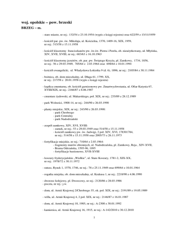 woj. opolskie – pow. brzeski BRZEG – m. - stare miasto, nr rej.: 132/54 z 23.10.1954 (wypis z księgi rejestru) oraz 622/59 z 13/11/1959 - kościół par. pw. św. Mikołaja, ul. Kościelna, 1370, 1409-16, XIX, 1959, nr rej.: 515/58 z 15.11.1958 - kościół klasztorny franciszkanów pw. św.św. Piotra i Pawła, ob. nieużytkowany, ul. Młyńska, XIV, XVII, XVIII, nr rej.: 683/63 z 16.10.1963 - kościół klasztorny jezuitów, ob. par. pw. Świętego Krzyża, pl. Zamkowy, 1734, 1856, nr rej.: 56 z 29.03.1949, 705/64 z 2.03.1964 oraz 698/64 z 10.01.1994 - kościół ewangelicki, ul. Władysława Łokietka 9 (d. 6), 1896, nr rej.: 2105/84 z 30.11.1984 - bożnica, ob. dom mieszkalny, ul. Długa 61, 1799, XX, nr rej.: 217/58 z 20.01.1958 (wypis z księgi rejestru) - kaplica cmentarna, ob. kościół garnizonowy pw. Zmartwychwstania, ul. Ofiar Katynia 67, XVIII/XIX, nr rej.: 2166/87 z 8.06.1987 - cmentarz żydowski, ul. Makarskiego, poł. XIX, nr rej.: 235/89 z 28.12.1989 - park Wolności, 1908-14, nr rej.: 244/90 z 26.03.1990 - planty miejskie, XIX, nr rej.: 243/90 z 26.03.1990: - park Chrobrego - park Centralny - park Nadodrzański - zespół zamkowy, XIV, XVI, XVIII: - zamek, nr rej.: 53 z 29.03.1949 oraz 514/58 z 15.11.1958 - kościół zamkowy pw. św. Jadwigi, 2 poł. XIV, XVI, 178301784, nr rej.: 514/58 z 15.11.1958 oraz 2005/73 z 26.11.1973 - fortyfikacje miejskie, nr rej.: 710/64 z 2.03.1964: - fragmenty murów obronnych, ul. Nadodrzańska, pl. Zamkowy, Reja , XIV-XVII, - Brama Odrzańska, 1595-96, 1895 - fortyfikacje bastionowe, XVII-XVIII - koszary fryderycjańskie „Wielkie”, ul. Stare Koszary, 1781-2, XIX-XX, nr rej.: 1978/72 z 30.11.1972 - ratusz, Rynek 1, 1570, 1746, nr rej.: 78 z 25.11.1949 oraz 699/64 z 10.01.1964 - rogatka miejska, ob. dom mieszkalny, ul. Krakusa 1, nr rej.: 2218/90 z 4.06.1990 - dworzec kolejowy, pl. Dworcowy, nr rej.: 2120/86 z 28.03.1986 - poczta, nr rej.: j.w. - dom, ul. Armii Krajowej 2/Chrobrego 35, ok. poł. XIX, nr rej.: 2191/89 z 19.05.1989 - willa, ul. Armii Krajowej 4, 2 poł. XIX, nr rej.: 2146/87 z 16.01.1987 - dom, ul. Armii Krajowej 10, 1905, nr rej.: A-2300 z 30.01.1992 - kamienica, ul. Armii Krajowej 16, 1915, nr rej.: A-142/2010 z 30.12.2010 1 woj. opolskie – pow. brzeski - kamienica, ul. Armii Krajowej 24, 1890, nr rej.: A-146/2011 z 7.03.2011 - dom, ul. Bolesława Chrobrego 4 (d. 56), po 1870, nr rej.: 2131/87 z 17.02.1987 - dom, ul. Bolesława Chrobrego 6 (d. 54/55), XIX/XX, nr rej.: 2148/87 z 17.02.1987 - dom, ul. Bolesława Chrobrego 10 (d. 51), nr rej.: 2282/91 z 20.08.1991 - kamienica, ul. Bolesława Chrobrego 11, 1880, nr rej.: A-133/2010 z 19.10.2010 - dom, ul. Bolesława Chrobrego 13 (d. 8), nr rej.: 2283/91 z 20.09.1991 - kamienica, ul. Bolesława Chrobrego 14, po 1890, nr rej.: A-134/2010 z 19.10.2010 - kamienica, ul. Bolesława Chrobrego 23, 1905, nr rej.: A-80/2009 z 5.03.2009 - dom, ul. Bolesława Chrobrego 27 (d. 14), pocz. XIX, nr rej.: 2331/94 z 27.05.1994 - kamienica, ul. Bolesława Chrobrego 28, 1914, nr rej.: A-136/2010 z 15.11.2010 - zakład karny, ul. Bolesława Chrobrego 29 (d. 15/16), 1845-1860, nr rej.: 2330/94 z 26.05.1994: - budynek penitencjarno-administracyjny - budynek penitencjarno-produkcyjny - mury obwodowe i wewnętrzne - sąd rejonowy, ul. Bolesława Chrobrego 31 (d. 17), nr rej.: 2143/86 z 23.10.1986 - willa, ul. Bolesława Chrobrego 35 (d. 17), 2 poł. XIX, nr rej.: 2090/82 z 10.11.1982 - fontanna, nr rej.: j.w. - dom, ul. Chopina 1, 1597, 1883, nr rej.: 700/64 z 10.01.1964 - 2 kamienice, ul. Chopina 2-4, XVI-XVIII, 1885, 1970, nr rej.: A-100/2009 z 7.09.2009 - kamienica, ul. Chopina 10, pocz. XIX, 1970, nr rej.: A-127/2010 z 27.09.2010 - dom, ul. Chopina 12, (XVI), poł. XIX, nr rej.: A-169/2011 z 23.09.2011 - dom, ul. Chopina 13, nr rej.: 176/ z 17.11.1957 (wypis z księgi rejestru) (nie istnieje ?) - dom, ul. Chopina 14, 1830, 1880, 1912, nr rej.: 109/2010 z 12.02.2010 - dom, ul. Chopina 20, pocz. XIX, nr rej.: 2190/89 z 6.03.1989 - dom, ul. Długa 9, nr rej.: 2087/82 z 18.10.1982 - dom, ul. Długa 13, 1790, nr rej.: 942/64 z 18.08.1964 oraz 1260/66 z 2.04.1966 - 2 kamienice, ul. Długa 14 i 16, XVI-XVIII, k. XIX, 1970, nr rej.: A-135/2010 z 10.12.2010 - dom, ul. Długa 19, nr rej.: 2088/82 z 19.10.1982 - dom, ul. Długa 21, nr rej.: 711/64 z 5.03.1964 - dom, ul. Długa 23 (d.12), nr rej.: 2326/93 z 21.09.1993 - dom, ul. Długa 24 (d.48), nr rej.: 222/58 z 21.01.1958 (wypis z księgi rejestru) 2 woj. opolskie – pow. brzeski - dom, ul. Długa 27 (d. 48), XVIII, nr rej.: 1261/66 z 2.04.1966 - dom, ul. Długa 31, XVIII, nr rej.: 223/58 z 21.01.1958 (wypis z księgi rejestru) oraz 1092/65 z 30.07.1965 - dom, ul. Długa 33 (d. 17), nr rej.: 205/58 z 20.01.1958 (wypis z księgi rejestru) - dom, ul. Długa 35, XVIII, 1860, 1925, nr rej.: 2402/2000 z 30.11.2000 - dom, ul. Długa 43 (d. 22), XVI, 1830, nr rej.: 677/63 z 30.11.1963 - dom, ul. Długa 45 (d. 23), pocz. XIX, nr rej.: 192/58 z 18.10.1958 (wypis z księgi rejestru) oraz 689/63 z 30.11.1963 - dom, ul. Długa 47 (d. 24), pocz. XIX, nr rej.: 238/58 z 22.01.1958 (wypis z księgi rejestru) oraz 690/63 z 30.11.1963 - dom, ul. Długa 49 (d. 25), nr rej.: 691/63 z 30.11.1963 oraz 200/85 z 18.01.1985 (wypis z księgi rejestru) - dom, ul. Długa 55/57 (d. 16, 28, 29), nr rej.: 692/63 z 30.11.1963 - dom, ul. Długa 57, 1820, nr rej.: A-2390/99 z 14.06.1999 - dom, pl. Dworcowy 2, po 1870, nr rej.: 2184/88 z 7.07.1988 - dom, ul. Dzierżonia 1, 3 (d. Rynek 36 i ul. Zakonnic 2), 1840, nr rej.: 1979/72 z 30.11.1972 oraz A-2389/99 z 7.06.1999 - dom, ul. Dzierżonia 4 (d. 29), 1800, nr rej.: 1263/66 z 4.04.1966 - kamienica, ul. Dzierżonia 6, 1885, nr rej.: A-95/2009 z 15.07.2009 - kamienica, ul. Dzierżonia 8, XV, 1884, nr rej.: A-199/2013 z 21.01.2013 - kamienica, ul. Dzierżonia 10, XV, 1884, nr rej.: A-200/2013 z 21.01.2013 - kamienica, ul. Dzierżonia 12, XV, 1884, nr rej.: A-201/2013 z 21.01.2013 - dom, ul. Dzierżonia 14 (d. 23), XIX, nr rej.: 199