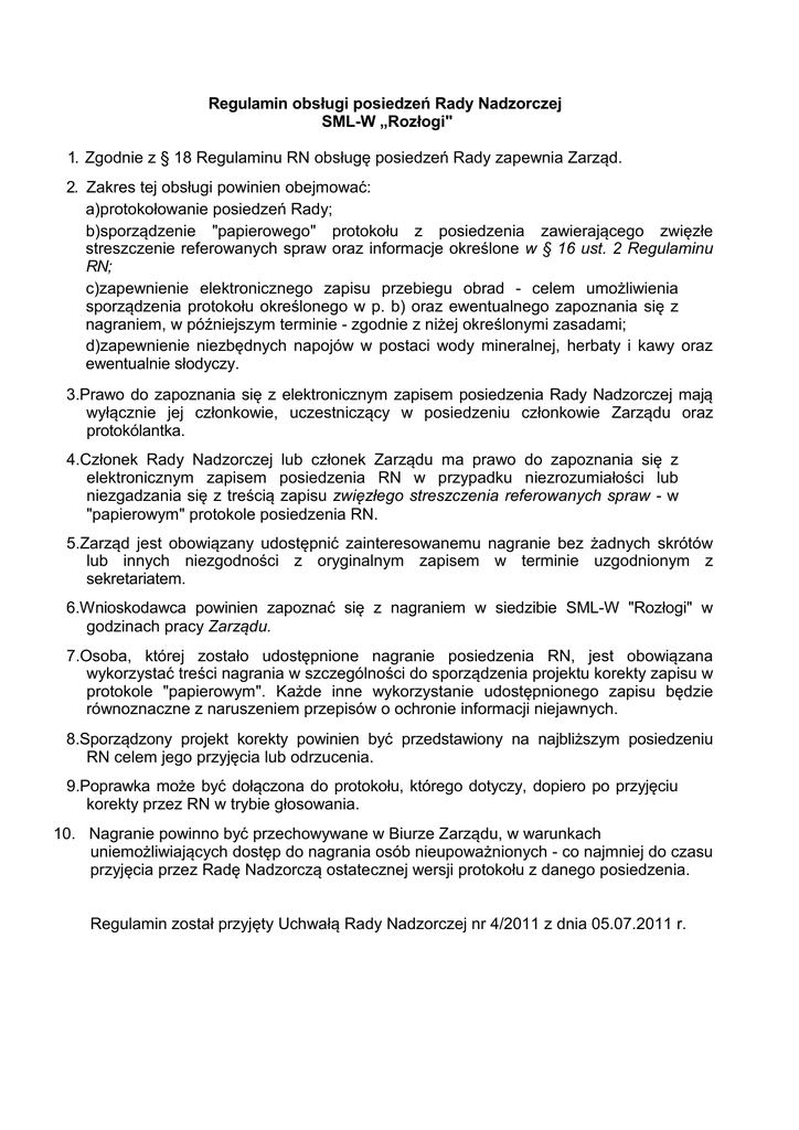 Regulamin obsługi posiedzeń Rady Nadzorczej SML-W „Rozłogi" 1. Zgodnie z § 18 Regulaminu RN obsługę posiedzeń Rady zapewnia Zarząd. 2. Zakres tej obsługi powinien obejmować: a)protokołowanie posiedzeń Rady; b)sporządzenie "papierowego" protokołu z posiedzenia zawierającego zwięzłe streszczenie referowanych spraw oraz informacje określone w § 16 ust. 2 Regulaminu RN; c)zapewnienie elektronicznego zapisu przebiegu obrad - celem umożliwienia sporządzenia protokołu określonego w p. b) oraz ewentualnego zapoznania się z nagraniem, w późniejszym terminie - zgodnie z niżej określonymi zasadami; d)zapewnienie niezbędnych napojów w postaci wody mineralnej, herbaty i kawy oraz ewentualnie słodyczy. 3.Prawo do zapoznania się z elektronicznym zapisem posiedzenia Rady Nadzorczej mają wyłącznie jej członkowie, uczestniczący w posiedzeniu członkowie Zarządu oraz protokólantka. 4.Członek Rady Nadzorczej lub członek Zarządu ma prawo do zapoznania się z elektronicznym zapisem posiedzenia RN w przypadku niezrozumiałości lub niezgadzania się z treścią zapisu zwięzłego streszczenia referowanych spraw - w "papierowym" protokole posiedzenia RN. 5.Zarząd jest obowiązany udostępnić zainteresowanemu nagranie bez żadnych skrótów lub innych niezgodności z oryginalnym zapisem w terminie uzgodnionym z sekretariatem. 6.Wnioskodawca powinien zapoznać się z nagraniem w siedzibie SML-W "Rozłogi" w godzinach pracy Zarządu. 7.Osoba, której zostało udostępnione nagranie posiedzenia RN, jest obowiązana wykorzystać treści nagrania w szczególności do sporządzenia projektu korekty zapisu w protokole "papierowym". Każde inne wykorzystanie udostępnionego zapisu będzie równoznaczne z naruszeniem przepisów o ochronie informacji niejawnych. 8.Sporządzony projekt korekty powinien być przedstawiony na najbliższym posiedzeniu RN celem jego przyjęcia lub odrzucenia. 9.Poprawka może być dołączona do protokołu, którego dotyczy, dopiero po przyjęciu korekty przez RN w trybie głosowania. 10. Nagranie powinno być przechowywane w Biurze Zarządu, w warunkach uniemożliwiających dostęp do nagrania osób nieupoważnionych - co najmniej do czasu przyjęcia przez Radę Nadzorczą ostatecznej wersji protokołu z danego posiedzenia. Regulamin został przyjęty Uchwałą Rady Nadzorczej nr 4/2011 z dnia 05.07.2011 r.