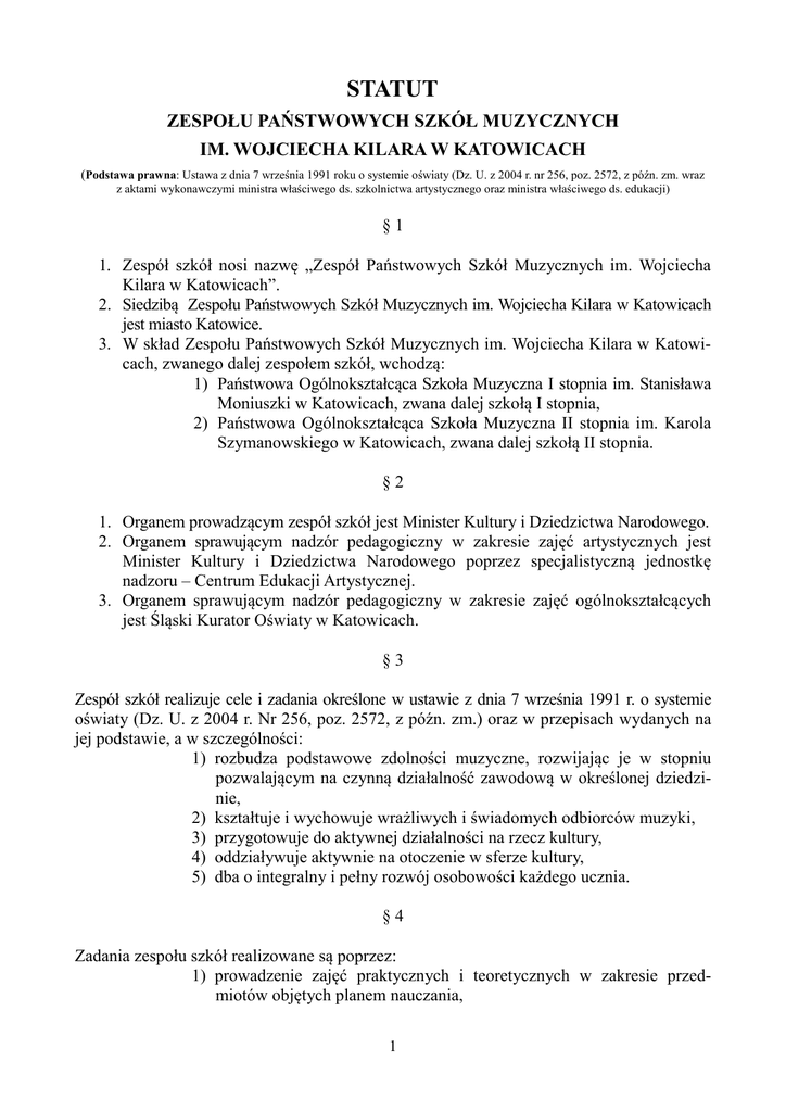 STATUT ZESPOŁU PAŃSTWOWYCH SZKÓŁ MUZYCZNYCH IM. WOJCIECHA KILARA W KATOWICACH (Podstawa prawna: Ustawa z dnia 7 września 1991 roku o systemie oświaty (Dz. U. z 2004 r. nr 256, poz. 2572, z późn. zm. wraz z aktami wykonawczymi ministra właściwego ds. szkolnictwa artystycznego oraz ministra właściwego ds. edukacji) §1 1. Zespół szkół nosi nazwę „Zespół Państwowych Szkół Muzycznych im. Wojciecha Kilara w Katowicach”. 2. Siedzibą Zespołu Państwowych Szkół Muzycznych im. Wojciecha Kilara w Katowicach jest miasto Katowice. 3. W skład Zespołu Państwowych Szkół Muzycznych im. Wojciecha Kilara w Katowicach, zwanego dalej zespołem szkół, wchodzą: 1) Państwowa Ogólnokształcąca Szkoła Muzyczna I stopnia im. Stanisława Moniuszki w Katowicach, zwana dalej szkołą I stopnia, 2) Państwowa Ogólnokształcąca Szkoła Muzyczna II stopnia im. Karola Szymanowskiego w Katowicach, zwana dalej szkołą II stopnia. §2 1. Organem prowadzącym zespół szkół jest Minister Kultury i Dziedzictwa Narodowego. 2. Organem sprawującym nadzór pedagogiczny w zakresie zajęć artystycznych jest Minister Kultury i Dziedzictwa Narodowego poprzez specjalistyczną jednostkę nadzoru – Centrum Edukacji Artystycznej. 3. Organem sprawującym nadzór pedagogiczny w zakresie zajęć ogólnokształcących jest Śląski Kurator Oświaty w Katowicach. §3 Zespół szkół realizuje cele i zadania określone w ustawie z dnia 7 września 1991 r. o systemie oświaty (Dz. U. z 2004 r. Nr 256, poz. 2572, z późn. zm.) oraz w przepisach wydanych na jej podstawie, a w szczególności: 1) rozbudza podstawowe zdolności muzyczne, rozwijając je w stopniu pozwalającym na czynną działalność zawodową w określonej dziedzinie, 2) kształtuje i wychowuje wrażliwych i świadomych odbiorców muzyki, 3) przygotowuje do aktywnej działalności na rzecz kultury, 4) oddziaływuje aktywnie na otoczenie w sferze kultury, 5) dba o integralny i pełny rozwój osobowości każdego ucznia. §4 Zadania zespołu szkół realizowane są poprzez: 1) prowadzenie zajęć praktycznych i teoretycznych w zakresie przedmiotów objętych planem nauczania, 1 2) uczestniczenie w konkursach, przesłuchaniach, festiwalach o zasięgu regionalnym, ogólnopolskim i międzynarodowym, 3) koncerty, przeglądy, popisy, prezentacje osiągnięć wszystkich uczniów, 4) współpracę z placówkami kulturalnymi i artystycznymi na terenie całego kraju i poza jego granicami, 5) współdziałanie z samorządem lokalnym w rozwijaniu działalności kulturalnej, zgodnie z postanowieniem par. 5 niniejszego statutu. §5 Zespół szkół współdziała z samorządami terytorialnymi w zależności od potrzeb środowiska lokalnego w zakresie działalności dydaktyczno-wychowawczej i artystycznej poprzez promowanie i prezentację uzdolnionych dzieci i młodzieży w formie koncertów, popisów, konkursów, a także typowanie do nagród i stypendiów. §6 1. Okres nauki w szkole I stopnia wynosi 6 lat i obejmuje zajęcia edukacyjne ogólnokształcące i artystyczne. 2. Szkoła I stopnia kształci w zakresie następujących specjalności: fortepian, akordeon, skrzypce, wiolonczela, kontrabas, flet, obój, klarnet, saksofon, fagot, trąbka, waltornia, puzon, perkusja, gitara klasyczna i harfa. §7 1. Okres nauki w szkole II stopnia wynosi 6 lat i obejmuje zajęcia edukacyjne ogólnokształcące i artystyczne. 2. W szkole II stopnia prowadzone są wydziały: 1) instrumentalny, w zakresie następujących specjalności: fortepian, organy, skrzypce, altówka, wiolonczela, kontrabas, flet, obój, klarnet, saksofon, fagot, trąbka, waltornia, puzon, tuba, perkusja, akordeon, gitara klasyczna i harfa, 2) rytmiki. 3. W szkole II stopnia mogą być prowadzone w ramach wydziału instrumentalnego następujące specjalności: viola da gamba, flet traverso i klawesyn. 4. Absolwenci szkoły II stopnia otrzymują tytuły: 1) muzyk – instrumentalista, z określeniem specjalizacji w zakresie specjalności wymienionych w ust. 2 pkt. 1, po ukończeniu wydziału instrumentalnego, 2) muzyk – nauczyciel rytmiki, po ukończeniu wydziału rytmiki. §8 1. W Zespole Państwowych Szkół Muzycznych im. Wojciecha Kilara mogą funkcjonować stowarzyszenia i fundacje, działające na rzecz szkół wchodzących w jego skład. 2. W szkole II stopnia działa Stowarzyszenie Absolwentów i Sympatyków Liceum Muzycznego w Katowicach. 2 3. Szczegółowy zakres działania stowarzyszeń i fundacji określają ich statuty §9 Ocenianie, klasyfikowanie i promowanie uczniów oraz przeprowadzanie sprawdzianów i egzaminów w zespole szkół reguluje Wewnątrzszkolny System Oceniania, Klasyfikowania i Promowania Uczniów w Zespole Państwowych Szkół Muzycznych im. Wojciecha Kilara w Katowicach, zwany dalej WSO, będący integralną częścią niniejszego statutu. § 10 1. Organami zespołu szkół są: 1) dyrektor, 2) rada pedagogiczna szkoły I stopnia, 3) rada pedagogiczna szkoły II stopnia, 4) rada szkoły, 5) rada rodziców, 6) samorząd uczniowski szkoły I stopnia, 7) samorząd uczniowski szkoły II stopnia. 2. Zespołem szkół kieruje dyrektor, który jest jego przedstawicielem na zewnątrz, przełożonym służbowym wszystkich pracowników szkoły i przewodniczącym rady pedagogicznej. Dyrektor sprawuje opiekę nad dziećmi i młodzieżą uczącą się w szkole. Dyrektor w szczególności: 1) kieruje działalnością zespołu szkół, 2) sprawuje nadzór pedagogiczny, 3) sprawuje opiekę nad uczniami, 4) realizuje uchwały rady szkoły i rady pedagogicznej, podjęte w ramach ich kompetencji stanowiących, 5) dysponuje środkami określonymi w planie finansowym szkoły i ponosi odpowiedzialność za ich prawidłowe wykorzystanie, 6) wykonuje czynności prawne w zakresie prawa pracy w stosunku do pracowników, 7) współdziała ze szkołami wyższymi w organizacji praktyk pedagogicznych, 8) odpowiada za właściwą organizację i przebieg egzaminów przeprowadzanych 