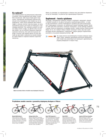 Co wybrać? Jeśli spodziewaliście się jednoznacznej odpowiedzi na pytanie, który typ geometrii jest lepszy, muszę Was rozczarować. Jeśli liczycie każdy gram masy roweru, oszczędność kilkudziesięciu gramów przy zakupie ramy slopingowej może okazać się nie do pogardzenia. Jeżeli natura obdarzyła Was krótkimi nogami, wówczas również może się okazać, że rama kompaktowa pasuje wam lepiej niż tradycyjna z racji niższego przekroku. Przy ustawianiu pozycji na rowerze należy zwrócić uwagę, czy główka ramy nie jest zbyt krótka i czy nie utrudnia ustawienia właściwej wysokości kierownicy. Nie warto też kupować slopinga w sytuacji, gdy długość górnej rury jest zbyt mała lub zbyt duża w stosunku do wzrostu kolarza, bo ciężko będzie to naprawić doborem wspornika kierownicy. Ważne, by pamiętać, że najważniejsze w doborze ramy jest właściwe dopasowanie jej do rowerzysty. I to powinno być najważniejszym kryterium. Suplement - teoria spiskowa Słuchając z obrzydzeniem kolejnych newsów o koalicjach, opozycjach, sitwach i układach przyszła mi do głowy myśl godna współczesnego polityka - a może to całe zamieszanie z ramami slopingowymi wywołane jest przez producentów ram? Spiskujących cichaczem, by wydrenować kieszeń biednego kolarza? Taniej im robić tylko kilka rozmiarów i wmawiać rowerzystom, że bez żadnego problemu i zawsze można je dopasować do każdego wzrostu i każdej budowy anatomicznej? Gdyby nie to, że w każdym dobrym sklepie rowerowym mamy cały czas wybór pomiędzy ramami slopingowymi i tradycyjnymi, byłbym gorącym orędownikiem powołania w tej sprawie specjalnej komisji... www. Na naszej stronie www.bikeboard.pl możecie zobaczyć więcej zdjęć z testu, dokładne specyfikacje techniczne prezentowanych modeli oraz prezentacje ram szosowych z geometrią slopingową dostępnych w naszym kraju. Zdjęcie prezentuje różnice w kształcie ramy slopingowej i klasycznej Przykładowe modele rowerów z geometrią slopingową dostępne w Polsce: 75 Bianchi 928 Carbon L Rama TC03 XL Carbon, osprzęt Shimano Ultegra/105 10 sp., koła Fulcrum Racing 5. Kontakt: Del Sport, tel. (0-22) 811-01-02, www.delsport. com.pl, cena: 11 699 zł Colnago Active Plus Rama z aluminium Columbus Airplane 7000 z tylnym widelcem z carbonu, osprzęt Campagnolo Centaur 10-sp., koła Campagnolo Vento. Kontakt: Wertykal, tel. (0-12) 285-14-97, www.wertykal.com, cena: 10 096 zł Giant TCR Composite 1 Rama kompozytowa formulaOne, osprzęt Shimano Ultegra/ Dura Ace 10-sp., koła Mavic Ksyrium Elite. Kontakt: Giant Polska, tel. (0-22) 645-14-34, www.giant-bicycles.com, cena: 11 999 zł. Giant OCR 3 Rama aluminium AluXX, osprzęt Shimano Sora 8-sp., koła Formula/Alexrims DA22. Kontakt: Giant Polska, tel. (022) 645-14-34, www.giant-bicycles.com, cena: 2499 zł. Lapierre 970 Team Scandium Rama Scandium, osprzęt Shimano Ultegra 10-sp., koła Mavic Ksyrium Elite. Kontakt: Poręba, tel. (0-12) 264-9024, www.poreba.carrer.pl bi k e Boa r d # 8 p a ź d z ie r n ik 2 0 0 6