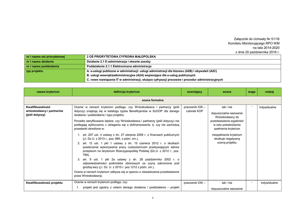 Załącznik do Uchwały Nr 51/16 Komitetu Monitorującego RPO WM na lata 2014-2020 z dnia 20 października 2016 r. nr i nazwa osi priorytetowej 2 OŚ PRIORYTETOWA CYFROWA MAŁOPOLSKA nr i nazwa działania Działanie 2.1 E-administracja i otwarte zasoby nr i nazwa poddziałania Poddziałanie 2.1.1 Elektroniczna administracja typ projektu A. e-usługi publiczne w administracji: usługi administracji dla biznesu (A2B) i obywateli (A2C) B. usługi wewnątrzadministracyjne (A2A) wspierające dla e-usług publicznych C. nowe rozwiązania IT w administracji, służące cyfryzacji procesów i procedur administracyjnych nazwa kryterium definicja kryterium oceniający ocena waga pracownik IOK – członek KOP tak / nie - rodzaj ocena formalna Kwalifikowalność wnioskodawcy i partnerów (jeśli dotyczy) Ocenie w ramach kryterium podlega, czy Wnioskodawca i partnerzy (jeśli dotyczy) znajdują się w katalogu typów Beneficjentów w SzOOP dla danego działania / poddziałania / typu projektu. Ponadto weryfikowane będzie, czy Wnioskodawca i partnerzy (jeśli dotyczy) nie podlegają wykluczeniu z ubiegania się o dofinansowanie, tj. czy nie zachodzą przesłanki określone w: indywidualne dopuszczalne wezwanie Wnioskodawcy do przedstawienia wyjaśnień w celu potwierdzenia spełnienia kryterium niespełnienie kryterium skutkuje negatywną oceną projektu 1. art. 207 ust. 4 ustawy z dn. 27 sierpnia 2009 r. o finansach publicznych (j.t. Dz.U. z 2013 r., poz. 885, z późn. zm.), 2. art. 12 ust. 1 pkt 1 ustawy z dn. 15 czerwca 2012 r. o skutkach powierzania wykonywania pracy cudzoziemcom przebywającym wbrew przepisom na terytorium Rzeczypospolitej Polskiej (Dz.U. z 2012 r., poz. 769), 3. art. 9 ust. 1 pkt 2a ustawy z dn. 28 października 2002 r. o odpowiedzialności podmiotów zbiorowych za czyny zabronione pod groźbą kary (j.t. Dz. U. z 2015 r. poz.1212 z późn. zm.). Ocena w ramach kryterium odbywa się w oparciu o oświadczenia przedstawione przez Wnioskodawcę. Kwalifikowalność projektu Ocenie w ramach kryterium podlega, czy: 1. pracownik IOK – projekt jest zgodny z celami danego działania / poddziałania – projekt 1 tak / nie dopuszczalne wezwanie - indywidualne charakteryzuje się wewnętrzną logiką, co oznacza, że zaplanowane działania odpowiadają na zdefiniowany problem i pozwolą na osiągnięcie założonego celu, wpisującego się w cele danego działania / poddziałania, 2. projekt wpisuje się w typy projektów wskazane dla danego działania / poddziałania, zgodnie z SzOOP i regulaminem konkursu (jeśli dotyczy), 3. projekt jest zgodny z warunkami specyficznymi dla danego działania / poddziałania, określonymi w SzOOP i regulaminie konkursu (jeśli dotyczy), 4. projekt jest zgodny z przepisami prawa w zakresie ocen oddziaływania na środowisko (jeśli dotyczy), tj. ustawy z dn. 3 października 2008 r. o udostępnianiu informacji o środowisku i jego ochronie, udziale społeczeństwa w ochronie środowiska oraz o ocenach oddziaływania na środowisko (Dz.U. 2016 poz. 353) Ocena odbywa się w oparciu o dokumentację załączoną do wniosku o dofinansowanie. 5. projekt jest zgodny z przepisami art. 65 ust. 6 i art. 125 ust. 3 lit. e) i f) Rozporządzenia Parlamentu Europejskiego i Rady (UE) nr 1303/2013 z dn. 17 grudnia 2013 r. tj. Wnioskodawca złożył oświadczenie, że: 6. projekt nie został zakończony w rozumieniu art. 65 ust. 6, nie rozpoczął realizacji projektu przed dniem złożenia wniosku o dofinansowanie albo, że realizując projekt przed dniem złożenia wniosku, przestrzegał obowiązujących przepisów prawa dotyczących danej operacji (art. 125 ust. 3 lit. e), projekt nie obejmuje przedsięwzięć będących częścią operacji, które zostały objęte lub powinny były zostać objęte procedurą odzyskiwania zgodnie z art. 71 (trwałość operacji) w następstwie przeniesienia działalności produkcyjnej poza obszar objęty programem, projekt (lub jego część) nie otrzymał dofinansowania z innych środków, Ocena odbywa się w oparciu o oświadczenia przedstawione przez Wnioskodawcę. 7. okres realizacji projektu jest zgodny z wymaganiami określonymi w regulaminie konkursu (jeśli dotyczy), 8. projekt jest ujęty w wykazie projektów zidentyfikowanych w ramach trybu pozakonkursowego, stanowiącym załącznik do SzOOP (jeśli dotyczy), 9. występuje zgodność z zasadniczymi elementami zidentyfikowanego projektu (jeśli dotyczy) 2 członek KOP Wnioskodawcy do przedstawienia wyjaśnień w celu potwierdzenia spełnienia kryterium niespełnienie kryterium skutkuje negatywną oceną projektu Ocena odbywa się w oparciu o kartę projektu. Kompletność oraz poprawność wypełnienia wniosku i załączników Poprawność przyjętych wskaźników Pomoc publiczna Ocenie w ramach kryterium podlega poprawność formalna wniosku o dofinansowanie, tj. prawidłowość wypełniania poszczególnych pól, a także kompletność informacji wymaganych regulaminem konkursu oraz instrukcją wypełniania wniosku o dofinansowanie. Weryfikacji podlega: 1. czy wniosek o dofinansowanie został wypełniony zgodnie z wyżej wymienioną instrukcją, 2. czy zostały przedstawione wszystkie wymagane załączniki, 3. czy załączniki zostały przygotowane zgodnie z wyżej wymienioną instrukcją. Ocenie w ramach wskaźników: kryterium podlega formalna poprawność przyjętych 1. czy Wnioskodawca dokonał wyboru obligatoryjnych wskaźników dla danego działania / poddziałania, 2. czy Wnioskodawca wybrał wszystkie wskaźniki adekwatne ze względu na zakres projektu, 3. czy Wnioskodawca przedstawił założenia dotyczące szacowania wartości wskaźników. Ocenie w ramach kryterium podlega, czy w projekcie występuje pomoc publiczna: 1. w przypadku, gdy pomoc publiczna nie występuje w projekcie – czy przedstawiono uzasadnienie dla braku spełnienia przesłanek występowania pomocy publicznej wskazanych w art. 107 Traktatu o funkcjonowaniu Unii Europejskiej lub 2. w przypadku,