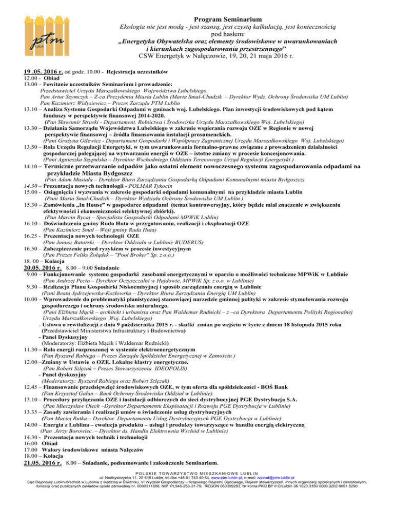 Program Seminarium Ekologia nie jest modą - jest szansą, jest czystą kalkulacją, jest koniecznością pod hasłem: „Energetyka Obywatelska oraz elementy środowiskowe w uwarunkowaniach i kierunkach zagospodarowania przestrzennego” CSW Energetyk w Nałęczowie, 19, 20, 21 maja 2016 r. 19 .05. 2016 r. od godz. 10.00 - Rejestracja uczestników 12.00 - Obiad 13.00 – Powitanie uczestników Seminarium i prowadzenie: Przedstawiciel Urzędu Marszałkowskiego Województwa Lubelskiego, Pan Artur Szymczyk – Z-ca Prezydenta Miasta Lublin (Marta Smal-Chudzik – Dyrektor Wydz. Ochrony Środowiska UM Lublin) Pan Kazimierz Widysiewicz – Prezes Zarządu PTM Lublin 13.10 – Analiza Systemu Gospodarki Odpadami w gminach woj. Lubelskiego. Plan inwestycji środowiskowych pod kątem funduszy w perspektywie finansowej 2014-2020. (Pan Sławomir Struski - Departament. Rolnictwa i Środowiska Urzędu Marszałkowskiego Woj. Lubelskiego) 13.30 – Działania Samorządu Województwa Lubelskiego w zakresie wspierania rozwoju OZE w Regionie w nowej perspektywie finansowej – źródła finansowania instalacji prosumenckich. (Pani Grażyna Gilewicz - Departament Gospodarki i Współpracy Zagranicznej Urzędu Marszałkowskiego Woj. Lubelskiego) 13.50 – Rola Urzędu Regulacji Energetyki, w tym uwarunkowania formalno-prawne związane z prowadzeniem działalności gospodarczej polegającej na wytwarzaniu energii w OZE – istotne zmiany w procesie koncesjonowania. (Pani Agnieszka Szypulska – Dyrektor Wschodniego Oddziału Terenowego Urząd Regulacji Energetyki ) 14.10 – Termiczne przetwarzanie odpadów jako ostatni element nowoczesnego systemu zagospodarowania odpadami na przykładzie Miasta Bydgoszcz (Pan Adam Musiała – Dyrektor Biura Zarządzania Gospodarką Odpadami Komunalnymi miasta Bydgoszcz) 14.30 – Prezentacja nowych technologii - POLMAR Tykocin 15.00 - Osiągnięcia i wyzwania w zakresie gospodarki odpadami komunalnymi na przykładzie miasta Lublin (Pani Marta Smal-Chudzik – Dyrektor Wydziału Ochrony Środowiska UM Lublin ) 15.30 – Zamówienia „In House” w gospodarce odpadami (temat kontrowersyjny, który będzie miał znaczenie w zwiększeniu efektywności i ekonomiczności selektywnej zbiórki). (Pan Marcin Rycaj – Specjalista Gospodarki Odpadami MPWiK Lublin) 16.10 - Doświadczenia gminy Ruda Huta w przygotowaniu, realizacji i eksploatacji OZE (Pan Kazimierz Smal – Wójt gminy Ruda Huta) 16.25 - Prezentacja nowych technologii OZE (Pan Janusz Batorski – Dyrektor Oddziału w Lublinie BUDERUS) 16.50 – Zabezpieczenie przed ryzykiem w procesie inwestycyjnym (Pan Prezes Feliks Żołądek – "Pool Broker" Sp. z o.o.) 18. 00 – Kolacja 20.05. 2016 r. 8.00 – 9.00 Śniadanie 9.00 – Funkcjonowanie systemu gospodarki zasobami energetycznymi w oparciu o możliwości techniczne MPWiK w Lublinie (Pan Andrzej Pecio – Dyrektor Oczyszczalni w Hajdowie, MPWiK Sp. z o.o. w Lublinie) 9.30 – Realizacja Planu Gospodarki Niskoemisyjnej i sposób zarządzania energią w Lublinie (Pani Beata Jędrzejewska-Kozłowska – Dyrektor Biura Zarządzania Energią UM Lublin) 10.00 – Wprowadzenie do problematyki planistycznej stanowiącej narzędzie gminnej polityki w zakresie stymulowania rozwoju gospodarczego i ochrony środowiska naturalnego. (Pani Elżbieta Mącik – architekt i urbanista oraz Pan Waldemar Rudnicki – z –ca Dyrektora Departamentu Polityki Regionalnej Urzędu Marszałkowskiego Woj. Lubelskiego) - Ustawa o rewitalizacji z dnia 9 października 2015 r. - skutki zmian po wejściu w życie z dniem 18 listopada 2015 roku (Przedstawiciel Ministerstwa Infrastruktury i Budownictwa) - Panel Dyskusyjny (Moderatorzy: Elżbieta Mącik i Waldemar Rudnicki) 11.30 – Rola energii rozproszonej w systemie elektroenergetycznym (Pan Ryszard Rabiega – Prezes Zarządu Spółdzielni Energetycznej w Zamościu ) 12.00 –Zmiany w Ustawie o OZE. Lokalne klastry energetyczne. (Pan Robert Szlęzak – Prezes Stowarzyszenia IDEOPOLIS) - Panel dyskusyjny (Moderatorzy: Ryszard Rabiega oraz Robert Szlęzak) 12.45 – Finansowanie przedsięwzięć środowiskowych OZE, w tym oferta dla spółdzielczości - BOŚ Bank (Pan Krzysztof Gałan – Bank Ochrony Środowiska Oddział w Lublinie) 13.10 – Procedury przyłączania OZE i instalacji odbiorczych do sieci dystrybucyjnej PGE Dystrybucja S.A. (Pan Mieczysław Olech –Dyrektor Departamentu Eksploatacji i Rozwoju PGE Dystrybucja w Lublinie) 13.35 – Zasady zawierania i realizacji umów o świadczenie usług dystrybucyjnych (Pan Maciej Rutka – Dyrektor Departamentu Usług Dystrybucyjnych PGE Dystrybucja w Lublinie) 14.00 – Energia z Lublina – ewolucja produktu – usługi i produkty towarzyszące w handlu energią elektryczną (Pan Jerzy Borowiec. – Dyrektor ds. Handlu Elektrownia Wschód w Lublinie) 14.30 - Prezentacja nowych technik i technologii 16.00 Obiad 17.00 Walory środowiskowe miasta Nałęczów 18.00 – Kolacja 21.05. 2016 r. 8.00 – Śniadanie, podsumowanie i zakończenie Seminarium. POLSKIE TOW ARZYSTW O MIESZ KANIOW E LUBLIN ul. Nadbystrzycka 11, 20-618 Lublin, tel./fax +48 81 743 49 64, www.ptm.lublin.pl, e-mail: [email protected] Sąd Rejonowy Lublin-Wschód w Lublinie z siedzibą w Świdniku, VI Wydział Gospodarczy – Krajowego Rejestru Sądowego, Rejestr stowarzyszeń, innych organizacji społecznych i zawodowych, fundacji oraz publicznych zakładów opieki zdrowotnej nr. 0000311688, NIP PL946-256-31-79, REGON 060399283, Nr konta:PKO BP II O/Lublin 36 1020 3150 0000 3202 0051 8290