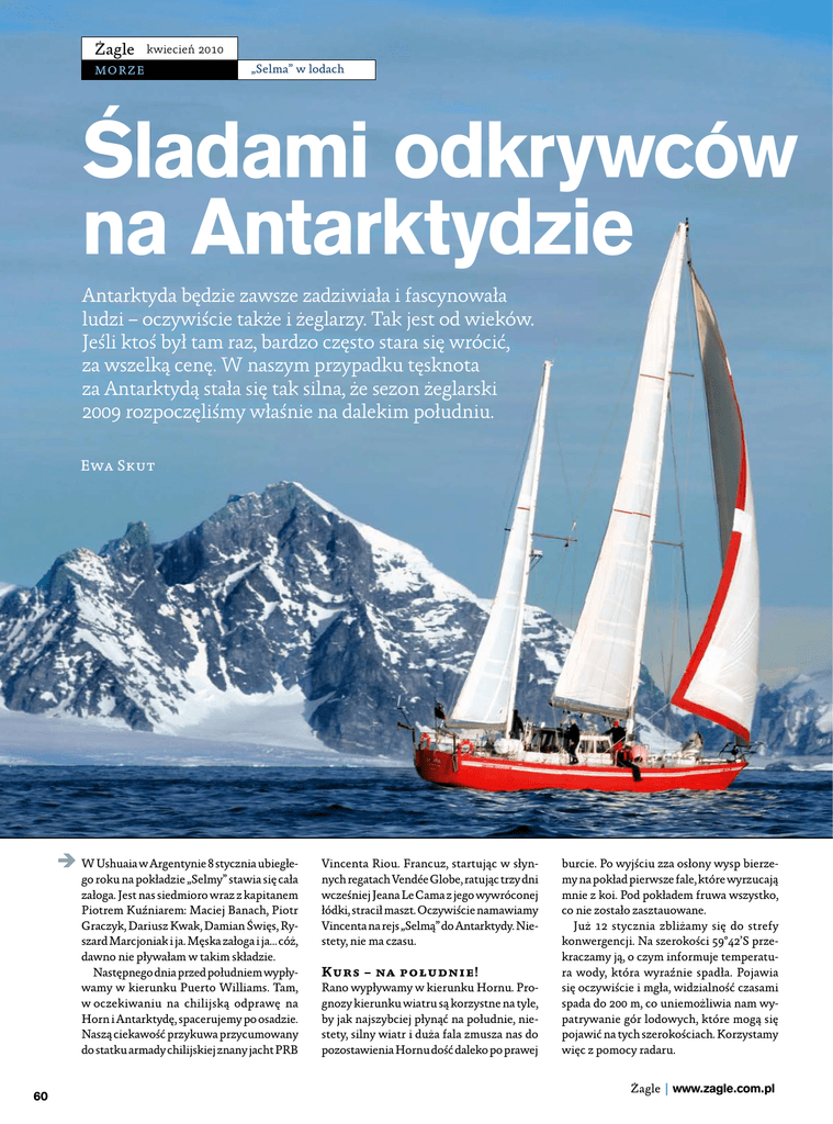 Żagle kwiecień 2010 morze „Selma” w lodach Śladami odkrywców na Antarktydzie Antarktyda będzie zawsze zadziwiała i fascynowała ludzi – oczywiście także i żeglarzy. Tak jest od wieków. Jeśli ktoś był tam raz, bardzo często stara się wrócić, za wszelką cenę. W naszym przypadku tęsknota za Antarktydą stała się tak silna, że sezon żeglarski 2009 rozpoczęliśmy właśnie na dalekim południu. Ewa Skut W Ushuaia w Argentynie 8 stycznia ubiegłego roku na pokładzie „Selmy” stawia się cała załoga. Jest nas siedmioro wraz z kapitanem Piotrem Kuźniarem: Maciej Banach, Piotr Graczyk, Dariusz Kwak, Damian Święs, Ryszard Marcjoniak i ja. Męska załoga i ja… cóż, dawno nie pływałam w takim składzie. Następnego dnia przed południem wypływamy w kierunku Puerto Williams. Tam, w oczekiwaniu na chilijską odprawę na Horn i Antarktydę, spacerujemy po osadzie. Naszą ciekawość przykuwa przycumowany do statku armady chilijskiej znany jacht PRB 60 Vincenta Riou. Francuz, startując w słynnych regatach Vendée Globe, ratując trzy dni wcześniej Jeana Le Cama z jego wywróconej łódki, stracił maszt. Oczywiście namawiamy Vincenta na rejs „Selmą” do Antarktydy. Niestety, nie ma czasu. Kurs – na południe! Rano wypływamy w kierunku Hornu. Prognozy kierunku wiatru są korzystne na tyle, by jak najszybciej płynąć na południe, niestety, silny wiatr i duża fala zmusza nas do pozostawienia Hornu dość daleko po prawej burcie. Po wyjściu zza osłony wysp bierzemy na pokład pierwsze fale, które wyrzucają mnie z koi. Pod pokładem fruwa wszystko, co nie zostało zasztauowane. Już 12 stycznia zbliżamy się do strefy konwergencji. Na szerokości 59°42’S przekraczamy ją, o czym informuje temperatura wody, która wyraźnie spadła. Pojawia się oczywiście i mgła, widzialność czasami spada do 200 m, co uniemożliwia nam wypatrywanie gór lodowych, które mogą się pojawić na tych szerokościach. Korzystamy więc z pomocy radaru. Żagle | www.zagle.com.pl