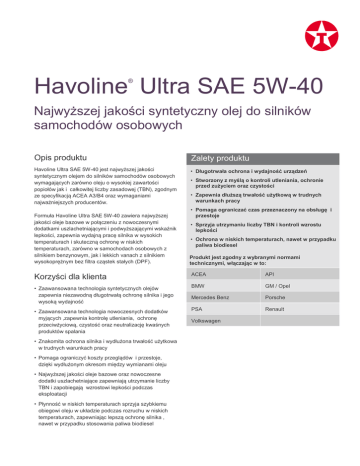 Havoline Ultra SAE 5W-40 ® Najwyższej jakości syntetyczny olej do silników samochodów osobowych Opis produktu Zalety produktu Havoline Ultra SAE 5W-40 jest najwyższej jakości syntetycznym olejem do silników samochodów osobowych wymagających zarówno oleju o wysokiej zawartości popiołów jak i całkowitej liczby zasadowej (TBN), zgodnym ze specyfikacją ACEA A3/B4 oraz wymaganiami najważniejszych producentów. • Długotrwała ochrona i wydajność urządzeń Formuła Havoline Ultra SAE 5W-40 zawiera najwyższej jakości oleje bazowe w połączeniu z nowoczesnymi dodatkami uszlachetniającymi i podwyższającymi wskaźnik lepkości, zapewnia wydajną pracę silnika w wysokich temperaturach i skuteczną ochronę w niskich temperaturach, zarówno w samochodach osobowych z silnikiem benzynowym, jak i lekkich vanach z silnikiem wysokoprężnym bez filtra cząstek stałych (DPF). • Stworzony z myślą o kontroli utleniania, ochronie przed zużyciem oraz czystości • Zapewnia dłuższą trwałość użytkową w trudnych warunkach pracy • Pomaga ograniczać czas przeznaczony na obsługę i przestoje • Sprzyja utrzymaniu liczby TBN i kontroli wzrostu lepkości • Ochrona w niskich temperaturach, nawet w przypadku paliwa biodiesel Produkt jest zgodny z wybranymi normami technicznymi, włączając w to: Korzyści dla klienta ACEA API • Zaawansowana technologia syntetycznych olejów zapewnia niezawodną długotrwałą ochronę silnika i jego wysoką wydajność BMW GM / Opel Mercedes Benz Porsche • Zaawansowana technologia nowoczesnych dodatków myjących ,zapewnia kontrolę utleniania, ochronę przeciwżyciową, czystość oraz neutralizację kwaśnych produktów spalania PSA Renault • Znakomita ochrona silnika i wydłużona trwałość użytkowa w trudnych warunkach pracy • Pomaga ograniczyć koszty przeglądów i przestoje, dzięki wydłużonym okresom między wymianami oleju • Najwyższej jakości oleje bazowe oraz nowoczesne dodatki uszlachetniające zapewniają utrzymanie liczby TBN i zapobiegają wzrostowi lepkości podczas eksploatacji • Płynność w niskich temperaturach sprzyja szybkiemu obiegowi oleju w układzie podczas rozruchu w niskich temperaturach, zapewniając lepszą ochronę silnika , nawet w przypadku stosowania paliwa biodiesel Volkswagen Havoline® Ultra SAE 5W-40 ─ ciąg dalszy Zgodność ze standardami Zastosowania • Havoline Ultra SAE 5W-40 może być stosowany w samochodach osobowych i lekkich vanach z silnikiem benzynowym lub wysokoprężnym bez filtra cząstek stałych (DPF) • Havoline Ultra SAE 5W-40 służy zarówno do pracy w warunkach normalnych jak i do intensywnej pracy w trudnych warunkach • Havoline Ultra SAE 5W-40 jest przeznaczony do silników wymagających klasy jakości ACEA A3/B3, ACEA A3/B4, API CF, API SN, API SM oraz starszych specyfikacji API dla silników benzynowych, takich jak API SL, API SJ, API SH i API SG • ACEA A3/B4, A3/B3 • API SN, CF • Mercedes Benz MB 229.3 • GM / Opel GM-LL-B-025 • PSA B71-2296 Zalecenia • Havoline Ultra SAE 5W-40 może być używany w silnikach MB 226.5 • Olej Havoline Ultra SAE 5W-40 może być używany w silnikach z turbosprężarką oraz wtryskiem bezpośrednim Normy i Zatwierdzenia Zatwierdzenia • BMW LL-01 • Mercedes Benz Aprobata MB 229.5 • Porsche A40 • Renault RN 0700/0710 • Volkswagen VW 502 00 / 505 00 Dane Typowe Test Metody badań Klasa lepkości Wartość SAE 5W-40 Dopuszczalny okres magazynowania: 60 miesięcy od daty napełnienia, podanej na produkcie Gęstość w temperaturze 15°C, kg/l ASTM D4052 0,853 Lepkość kinematyczna w temperaturze 2 40°C, mm /s ASTM D445 81,3 Lepkość kinematyczna w temperaturze 2 100°C, mm /s ASTM D445 13,6 Wskaźnik lepkości ASTM D2270 171 Temperatura płynięcia, °C ASTM D97 -39 Temperatura zapłonu COC, °C ASTM D92 224 Podane informacje są danymi typowymi dla bieżącej produkcji, nie stanowią wymagań technicznych produktu i mogą podlegać zmianom w ramach dopuszczalnych tolerancji produkcyjnych. Zastrzega się prawo do dokonywania zmian w specyfikacji produktu. Powyższa Karta Produktu zastępuje wszelkie poprzednie wersje Karty Produktu i zawarte w nich informacje. Chevron nie bierze odpowiedzialności: za jakiekolwiek straty oraz szkody powstałe wskutek używania tego produktu niezgodnie z przeznaczeniem opisanym w Karcie Produktu. Zdrowie, bezpieczeństwo, przechowywanie i ochrona środowiska: zgodnie z aktualnie dostępnymi informacjami nie przypuszcza się, żeby produkt mógł powodować negatywne skutki oddziaływania na zdrowie, w przypadku kiedy jest używany zgodnie z przeznaczeniem oraz zgodnie z informacjami zawartymi w Karcie Charakterystyki Preparatu Niebezpiecznego. Karty Charakterystyki dostępne są na życzenie w lokalnym biurze handlowym lub poprzez stronę internetową. Produkt ten nie powinien być używany niezgodnie z przeznaczeniem. W postępowaniu ze zużytym produktem zadbać o ochronę środowiska naturalnego i zastosować się do lokalnych przepisów. © 2015 Chevron Products UK Limited. All rights reserved. All trademarks are property owned by Chevron Intellectual Property LLC. EU v2 21 September 2015 Havoline® Ultra SAE 5W-40
